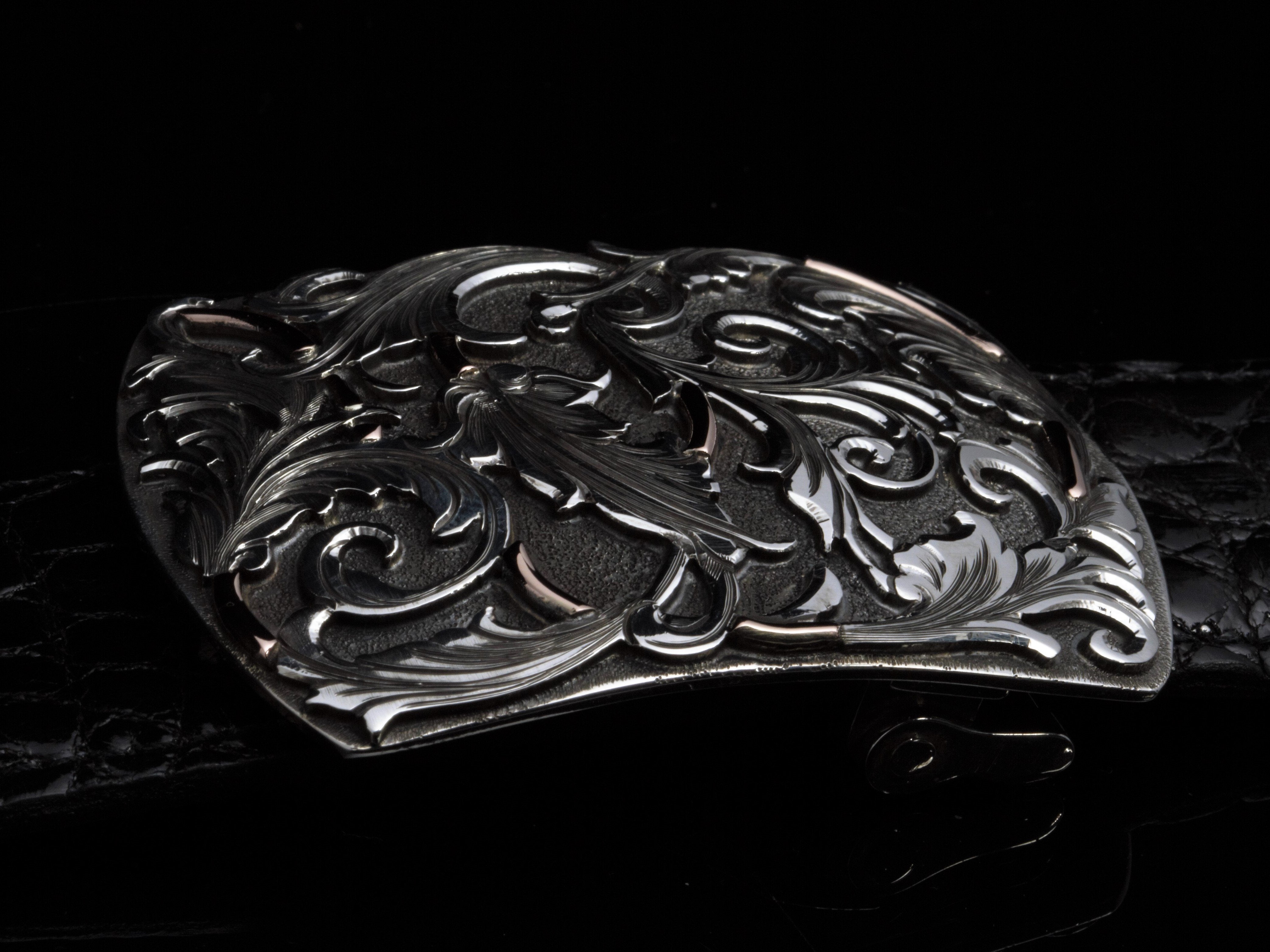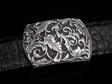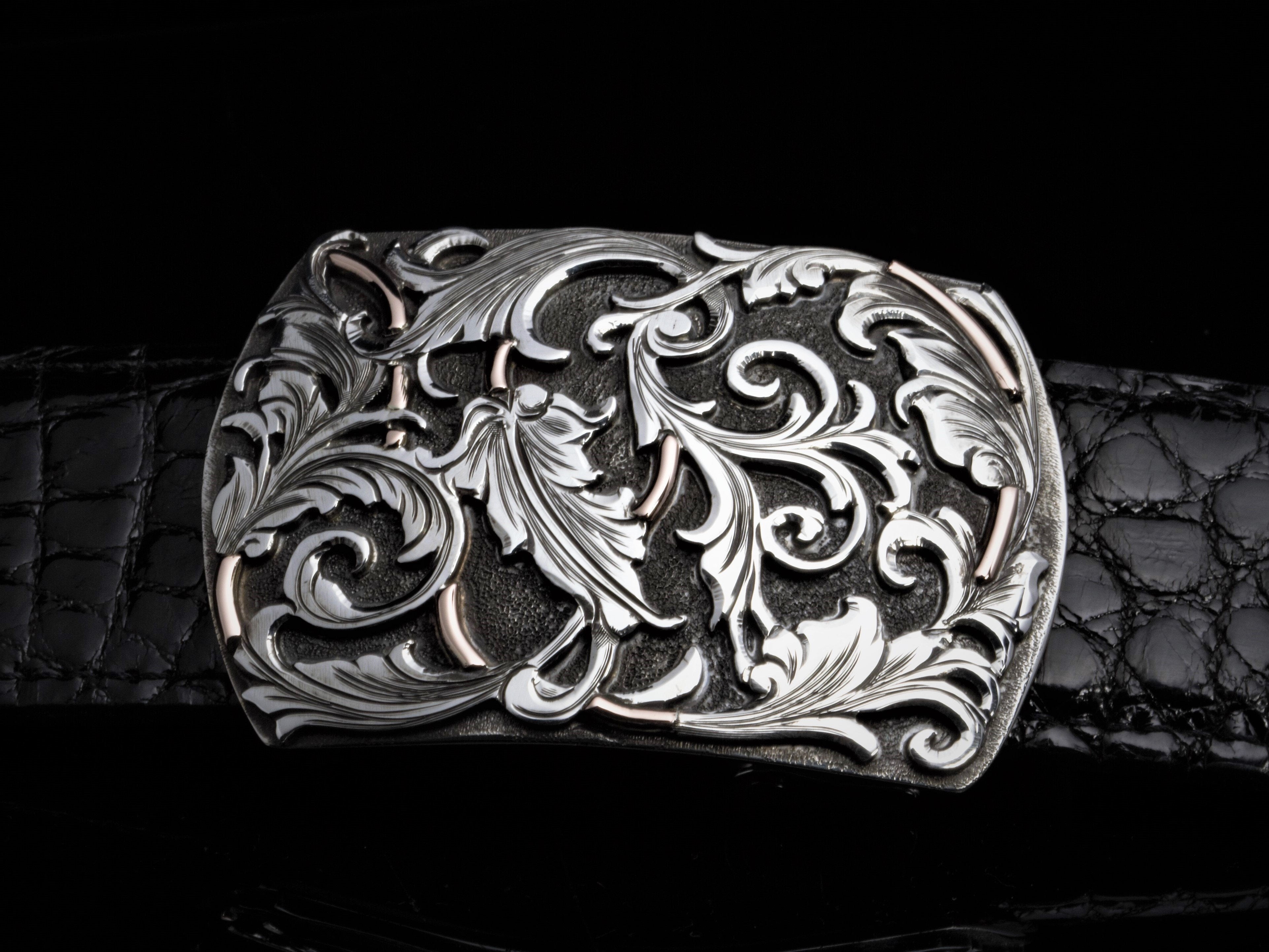 The Halogen Vines by Comstock Heritage is a medium-sized Halogen-style dress buckle crafted from Sterling silver. Hand-cut Sterling silver leaves are carefully placed along 14k yellow gold vines, forming an organic, flowing design. The entire scene rests on a stippled background that has been antiqued to create a dark base, allowing the details and materials to stand out with clarity and contrast.