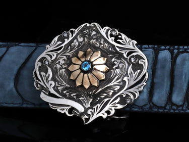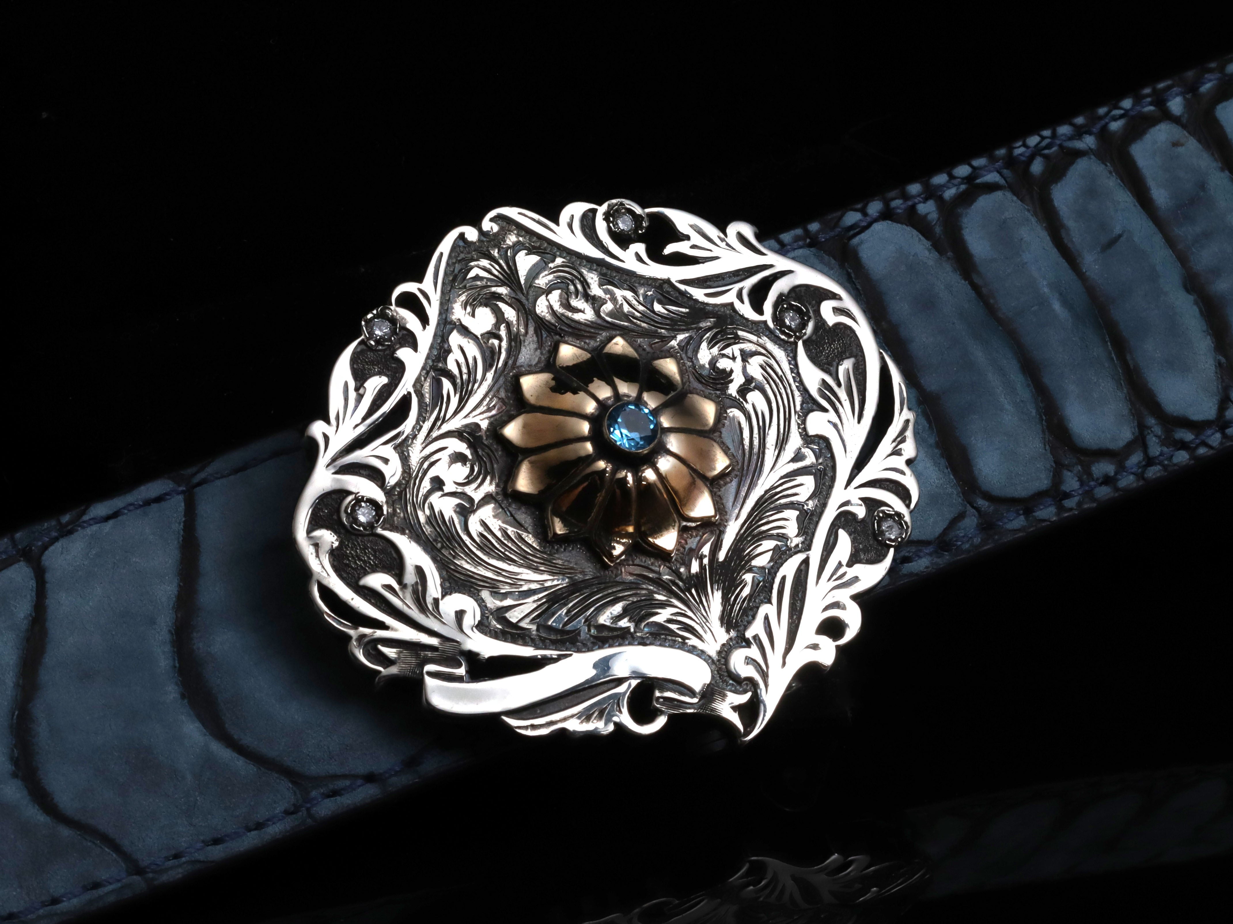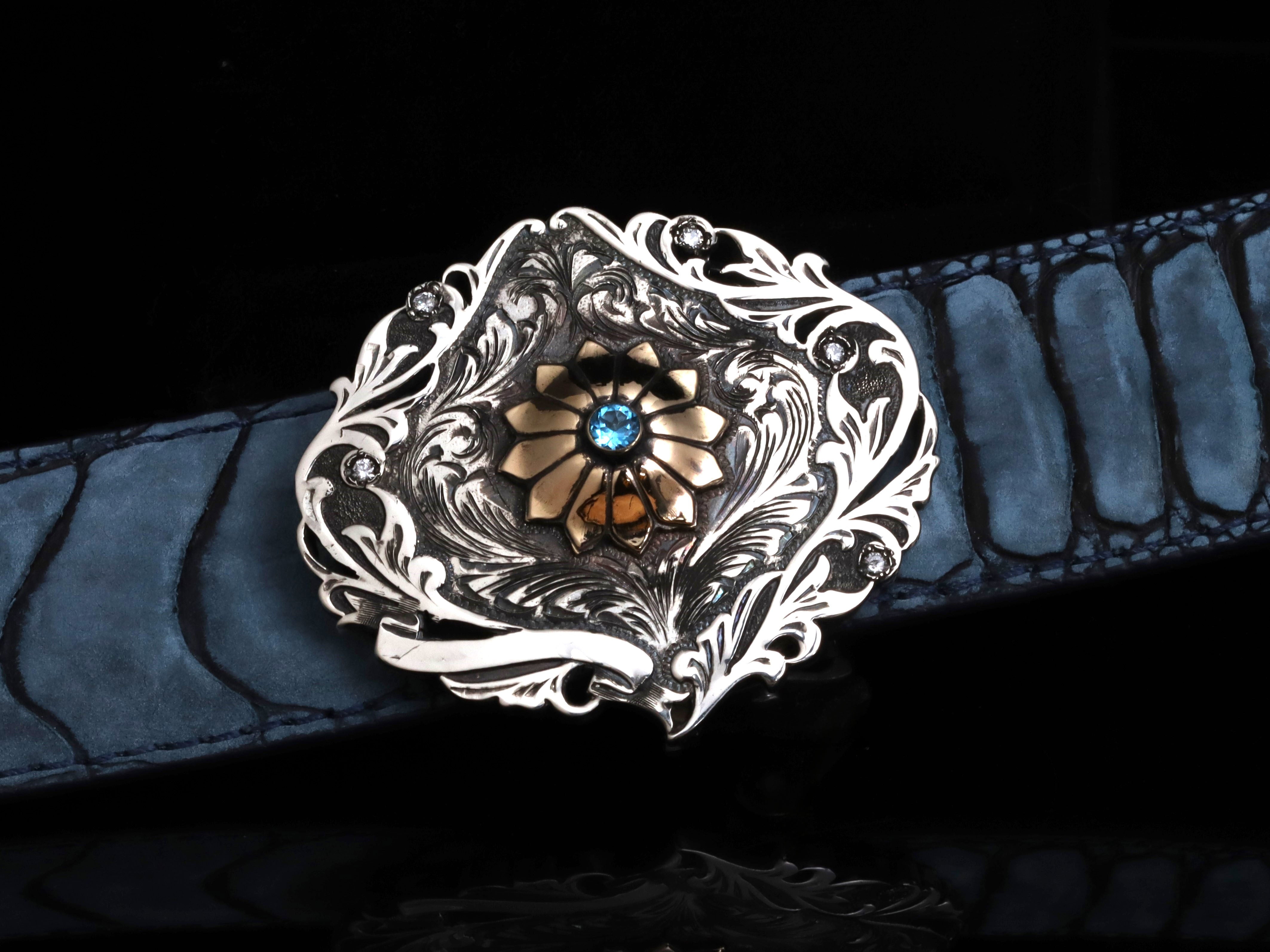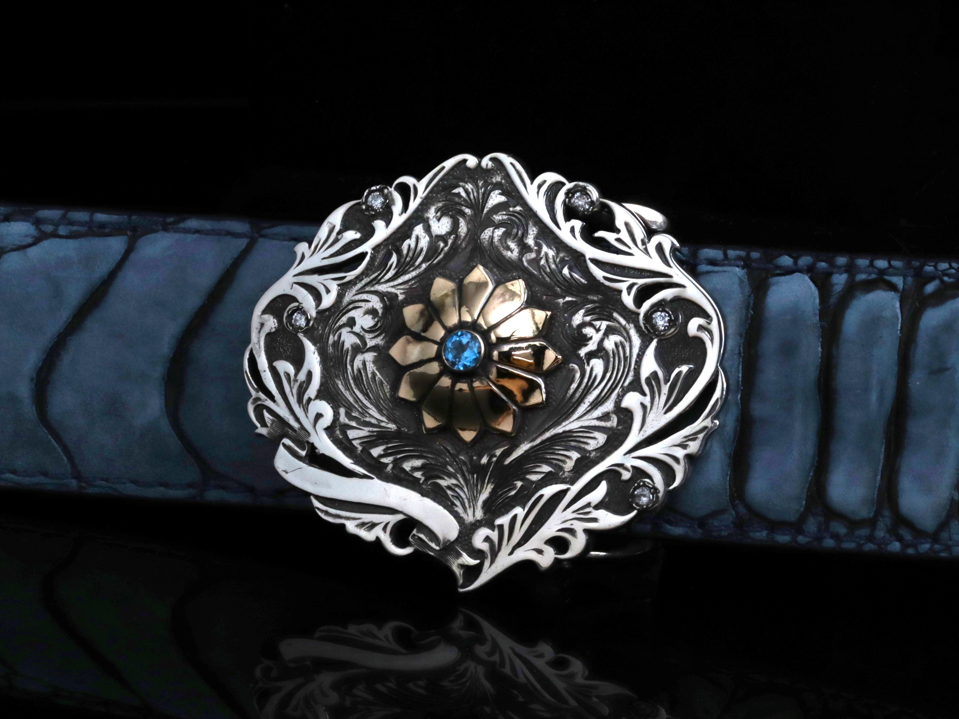 The Harmony Topaz by Comstock Heritage is a finely crafted Sterling silver dress buckle that brings a vibrant touch of color and brilliance. A Sterling silver base supports matching overlays, accented by five small white diamonds that create an elegant frame. At the heart of the design, a striking blue Topaz is set inside a detailed 14k yellow gold flower, adding depth and contrast. Surrounded by intricate hand engraving, this buckle is a unique blend of refinement and expert detailing.