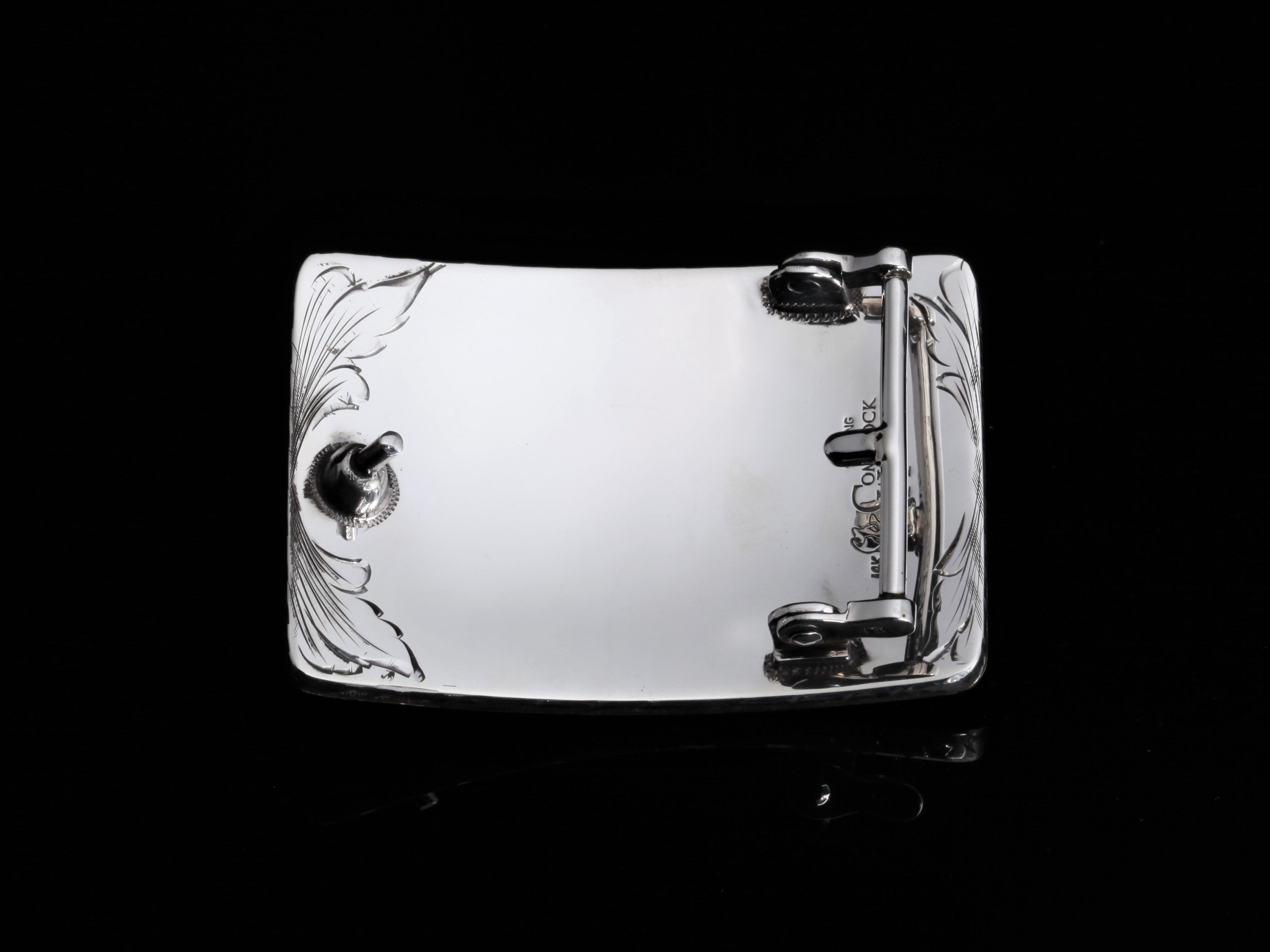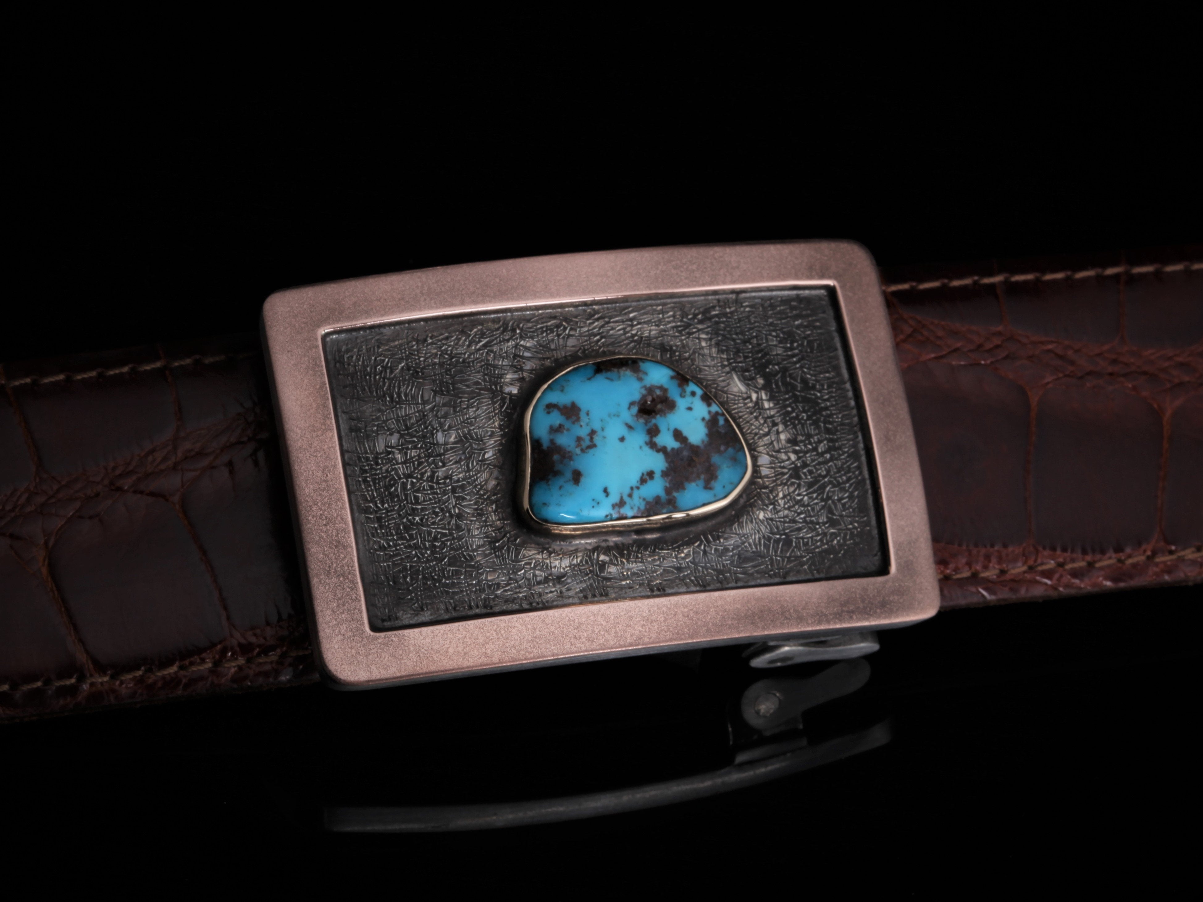 The Mason Allen TQ by Comstock Heritage is a Sterling silver rectangular "Mason" style buckle that blends bold materials with detailed engraving. A wide 14k rose gold border frames the center, which showcases intricate "Poe" style hand engraving. At the heart of the buckle is a vibrant piece of Tyrone turquoise from New Mexico, known for its deep, rich blues, set in a 14k yellow gold bezel. The back features light engraving, offering a perfect space for a custom inscription.