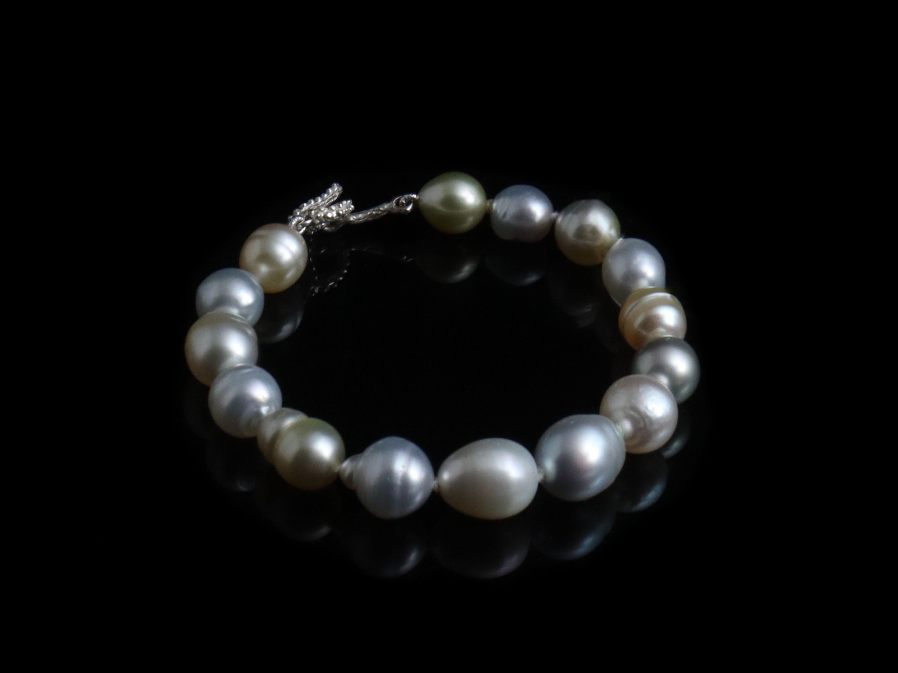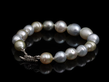 Get ready to be mesmerized by the unique combination of champagne and grey blue South Sea pearls on this striking bracelet. Each pearl is like its own captivating world, coming together to form a gorgeous and organic piece. And let's not forget the quirky tentacle-shaped silver toggle that adds a playful touch to the design!