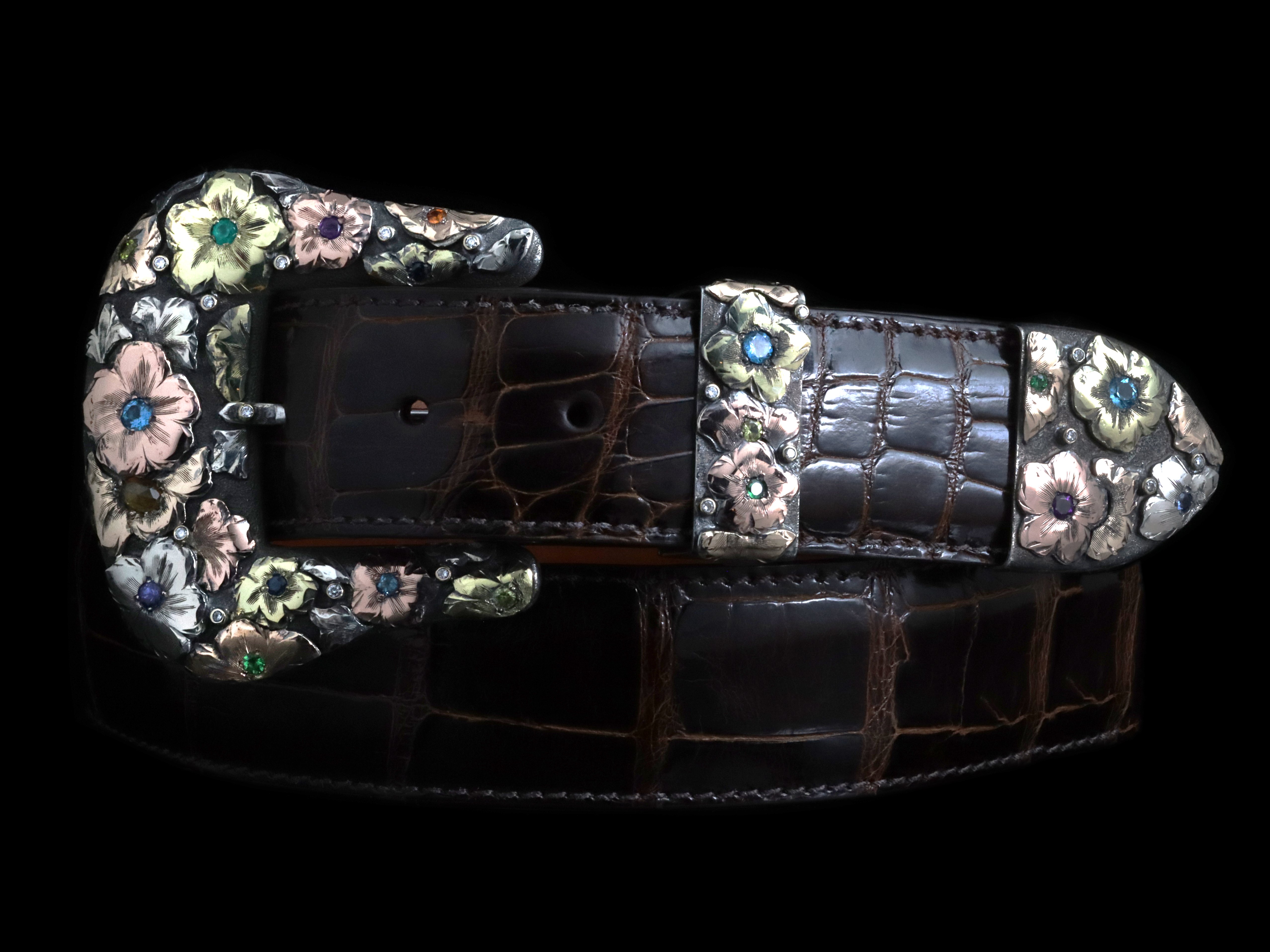Discover the Clement Flower Garden Buckle Set by Comstock Heritage, a stunning testament to exquisite craftsmanship and timeless elegance. This larger 1 ½" buckle set features three meticulously crafted pieces, all fashioned from premium Sterling silver and gold for durability and luxury. Adorned with dozens of intricately hand-cut 14k and 18k gold flowers, each buckle is a unique work of art that showcases exceptional attention to detail. Individual sapphires and diamonds are thoughtfully embedded throughout, adding a touch of brilliance and sophistication to this breathtaking set. The antiqued finish enhances the depth of the hand engraving, allowing the exquisite artistry to stand out and captivate the eye. Elevate your accessory collection with this stunning buckle set that embodies sophistication and style, perfect for those who appreciate the finer things in life.