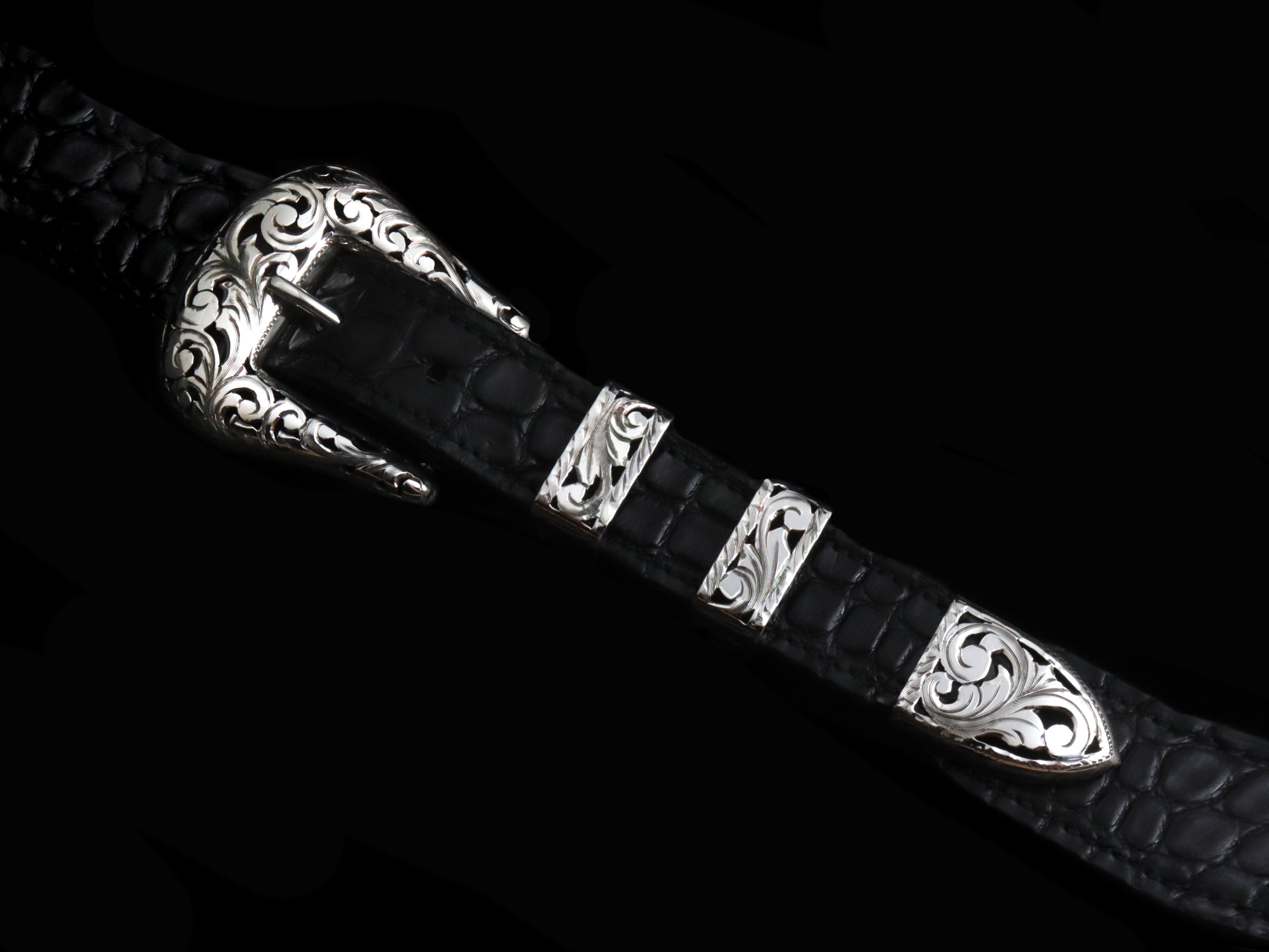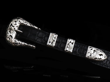 Introducing the Kent by Comstock Heritage, a classic 4-piece sterling silver buckle set featuring an elegant "JW" shape and meticulous craftsmanship. Each scroll and leaf is intricately cut through the silver, showcasing our dedication to detail.