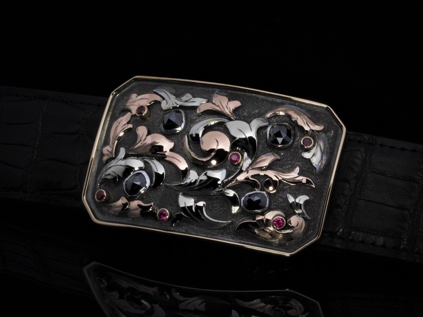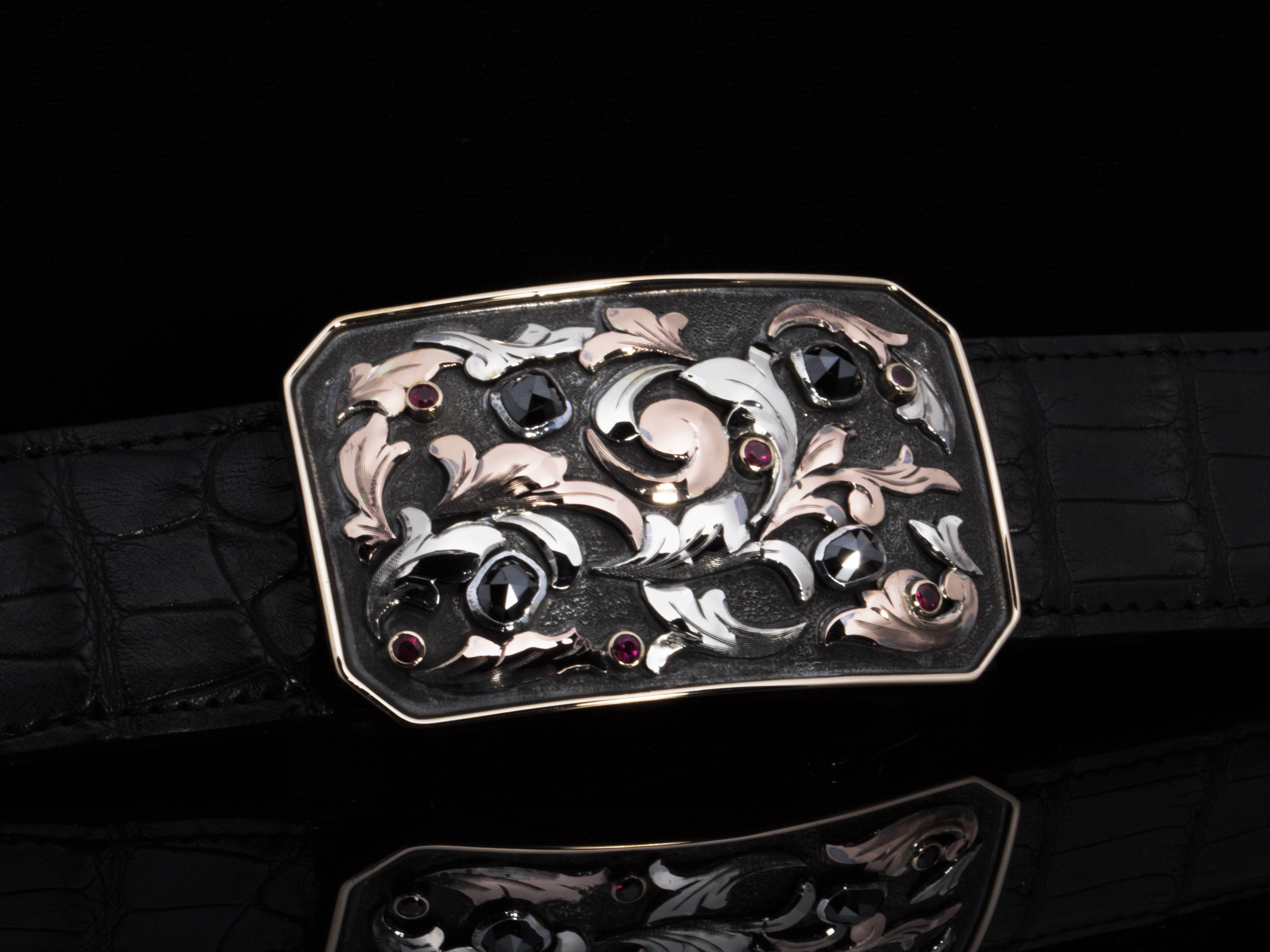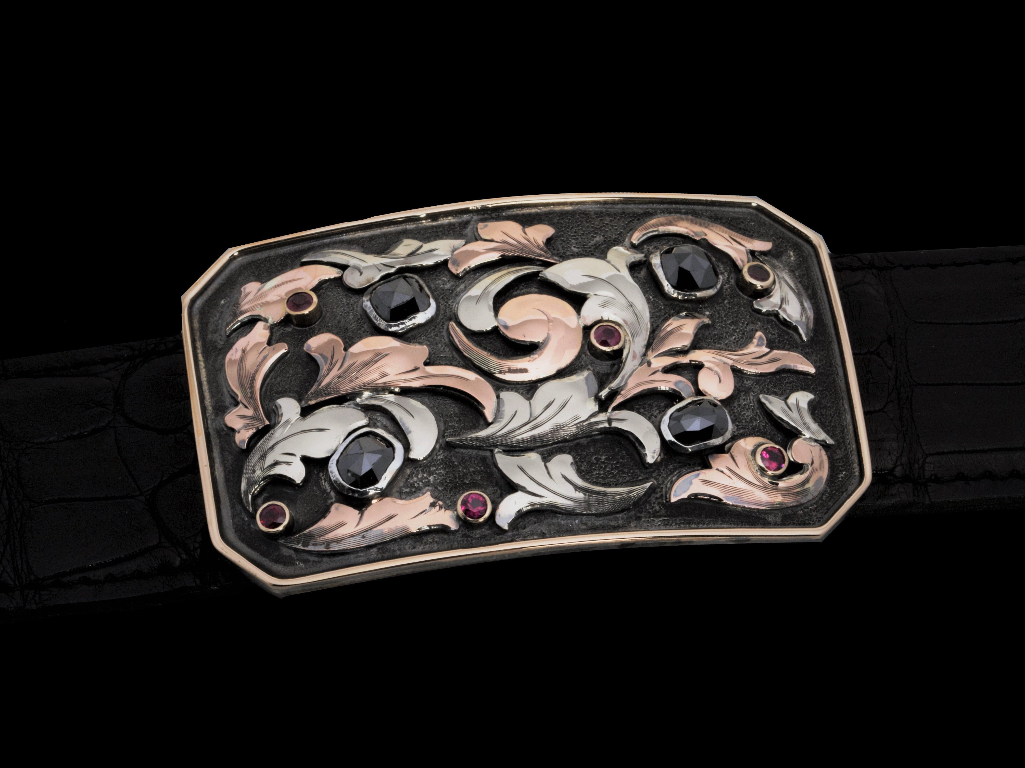 The Charlie Bahia belt buckle by Comstock Heritage is a "Charlie" shape, clipped-corner buckle designed with rich detail and contrast. Named after the Brazilian state known for its black diamonds, this buckle showcases over 4 carats total weight of black diamonds and 1 carat of vibrant red rubies. Framing these stones is a rounded 14k yellow gold wire edge, while hand-cut 14k white and rose gold 3D overlays add dimension and elegance to the overall design.