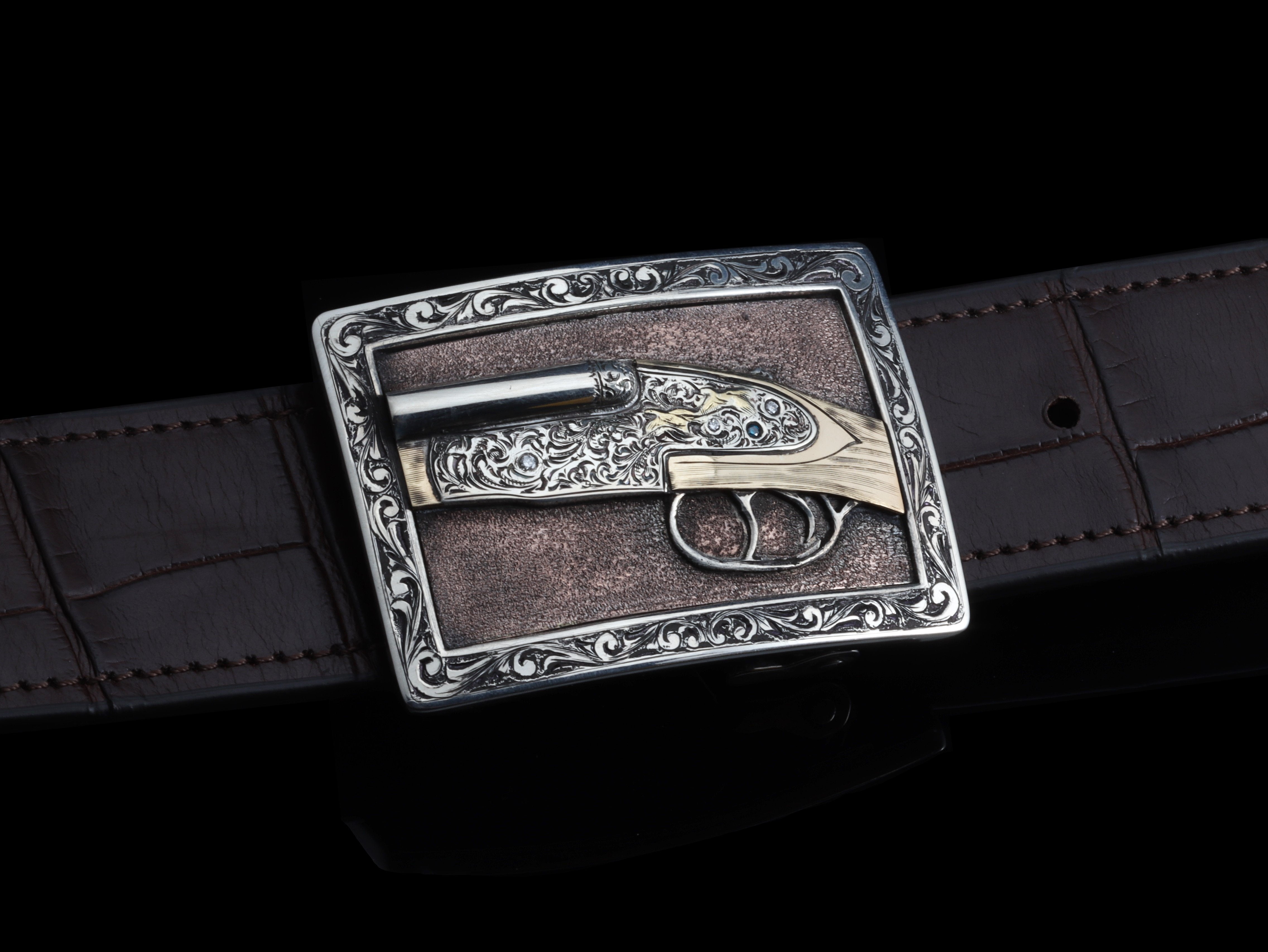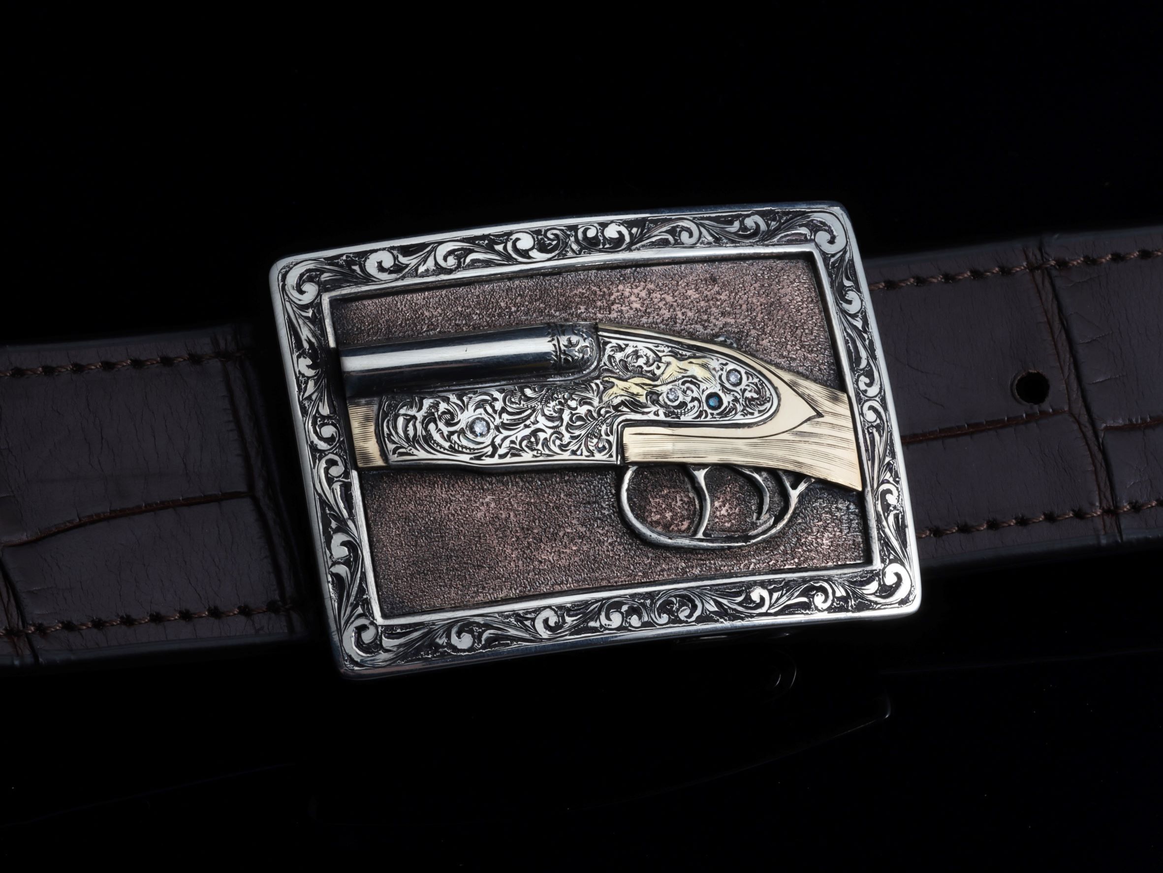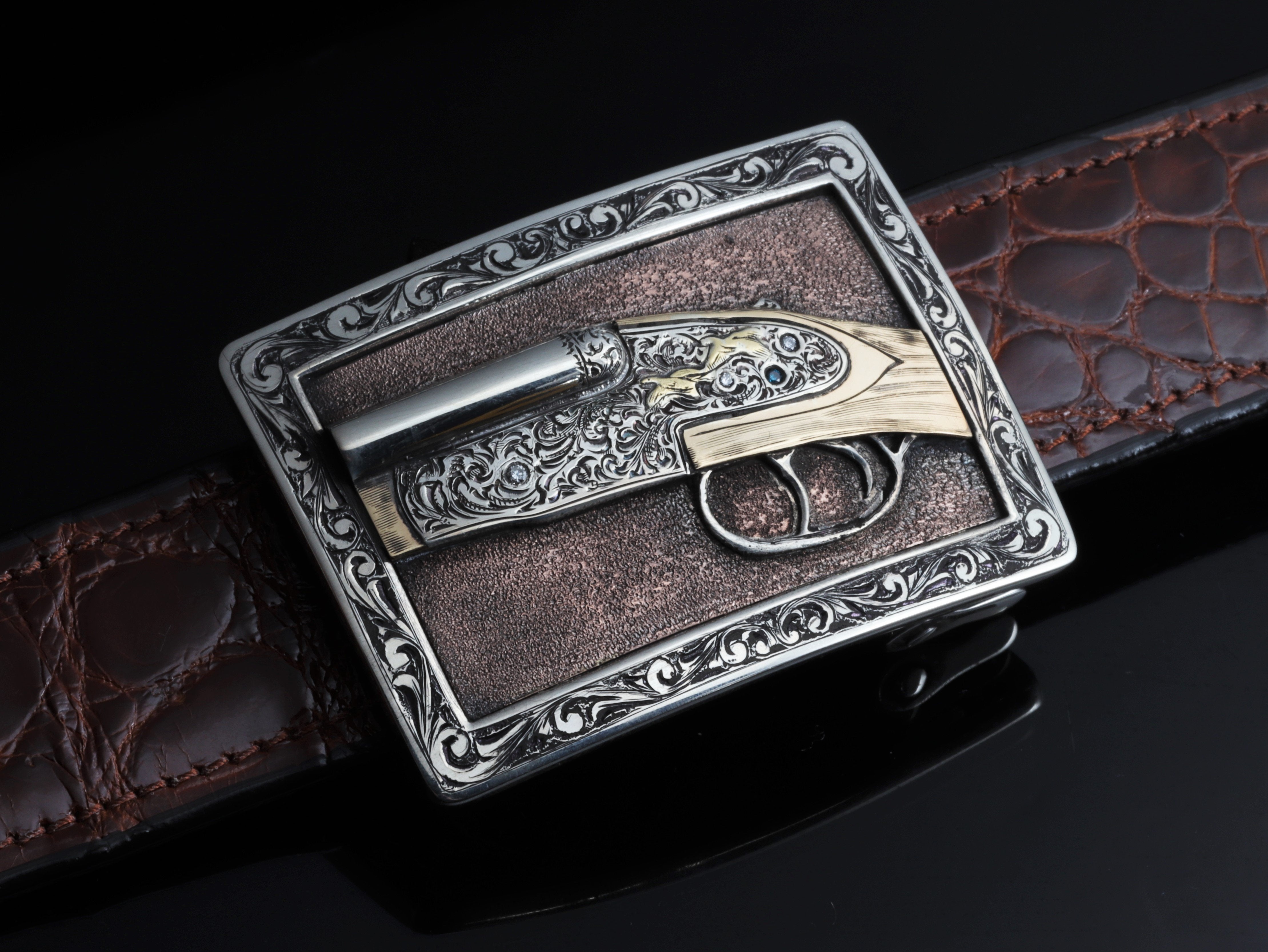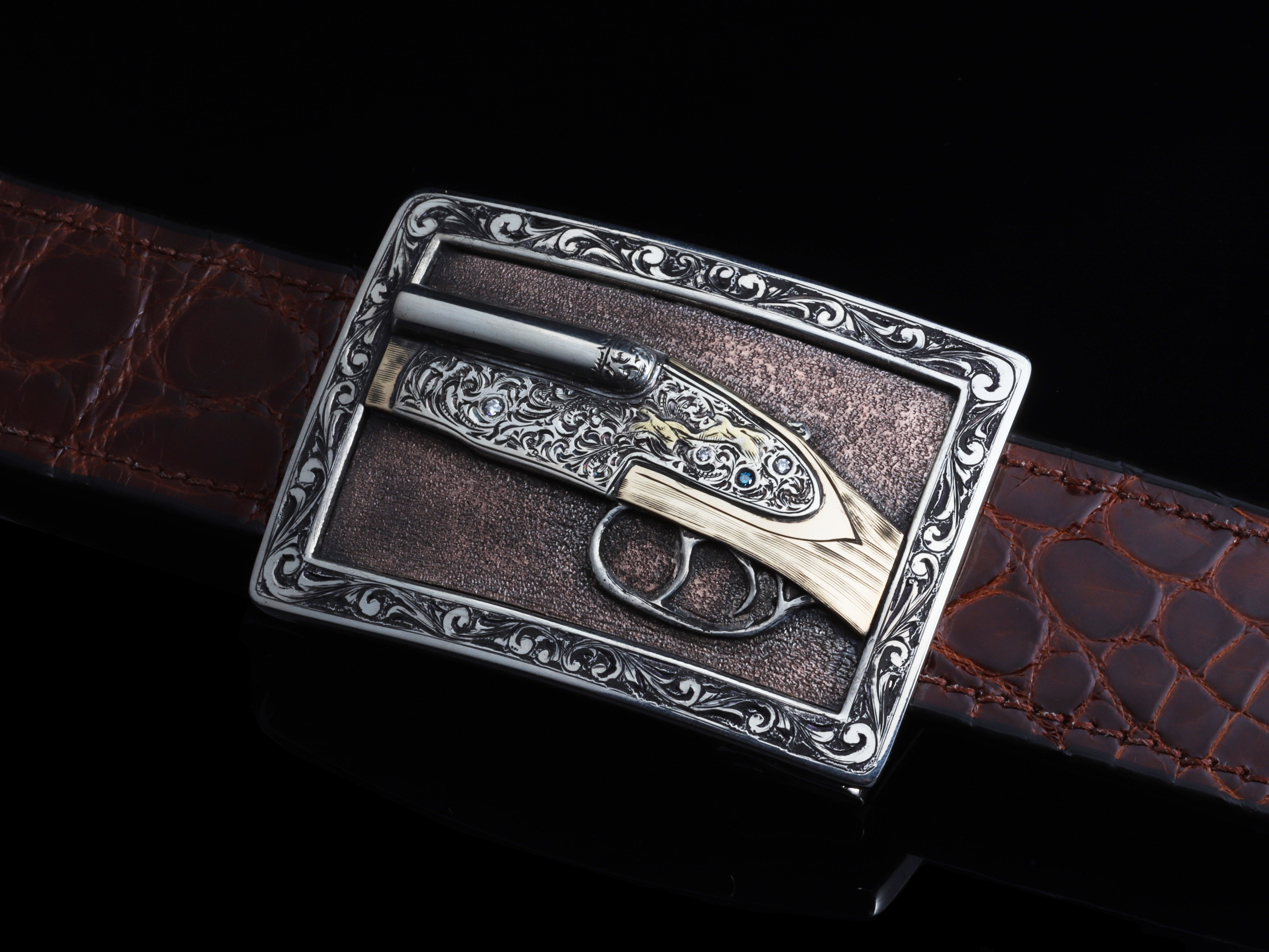 The Mason Shotgun by Comstock Heritage is a Sterling silver heavy gauge "Mason" shape buckle featuring a multi layer shotgun motif. A Sterling silver frame with "Harris" style engraving hosts a 14k rose gold inlaid plate that has been stippled to be the perfect background for a hand crafted shotgun. This centerpiece has 14k yellow gold ducks as well as two white and one blue diamond.