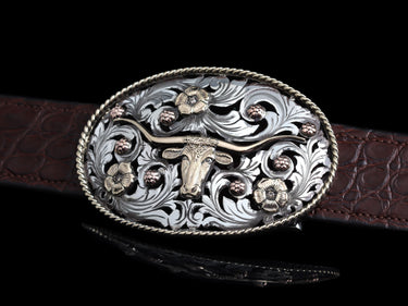 The Parker Longhorn 14k by Comstock Heritage is a larger oval-shaped belt buckle that blends traditional Western design with precious materials. At the center, a rustic 14k yellow gold hand-cast longhorn figure anchors the piece, surrounded by fully hand-cut Sterling silver filigree that allows light to pass through for added dimension. Accents include 14k rose gold berries used as scroll caps and three 14k yellow gold flowers, each set with a white diamond for added brilliance. A hand-wrought 14k yellow gold rope frames the entire buckle, tying together the detailed elements with a warm finish.