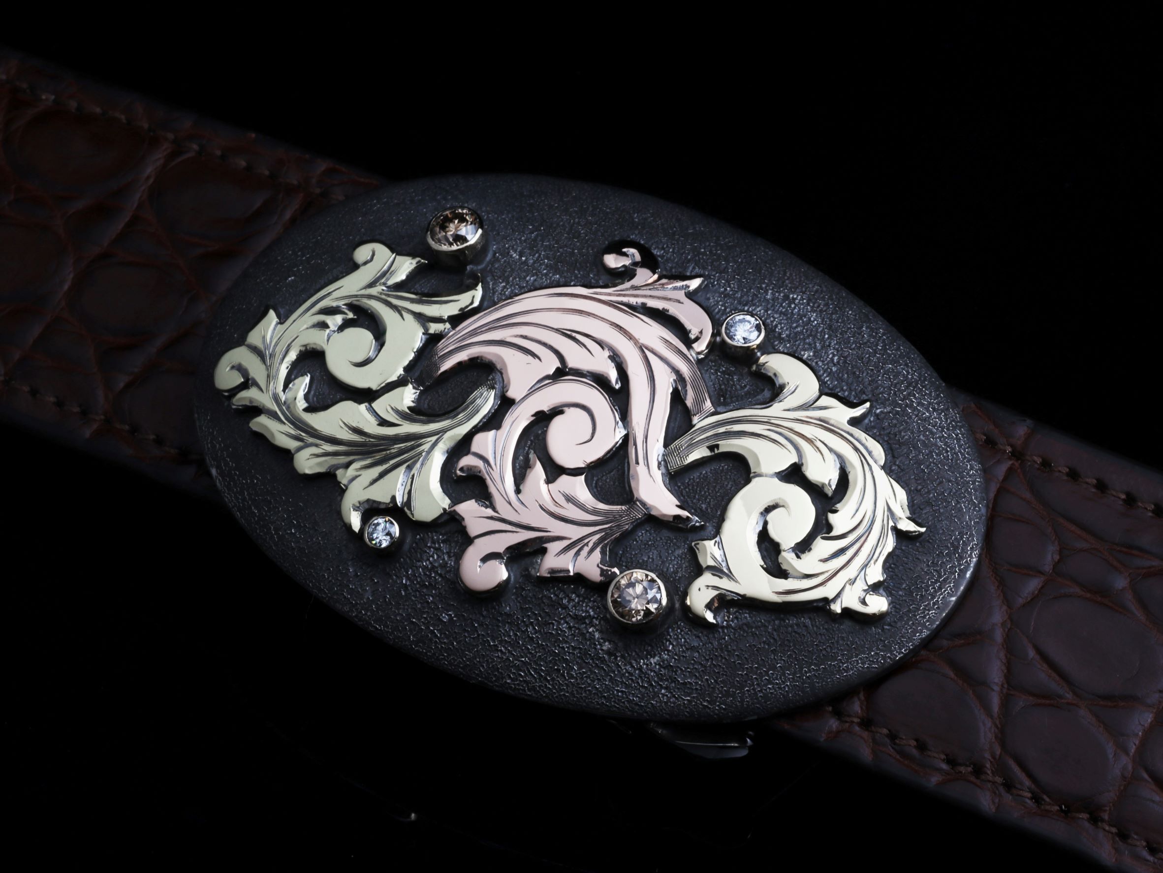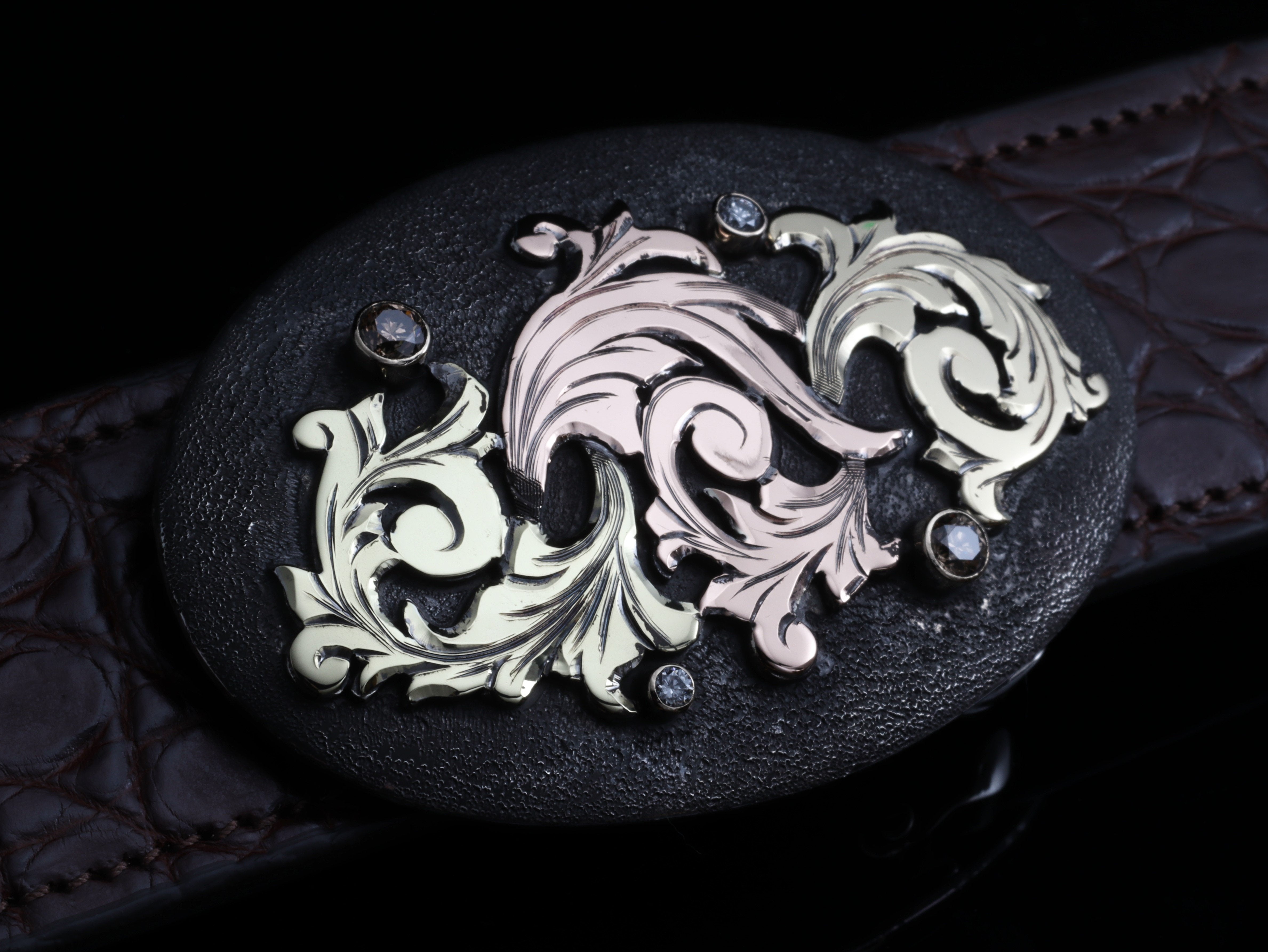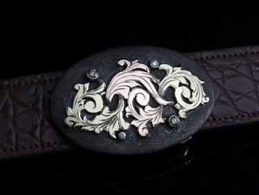 The Sutro Toscano by Comstock Heritage is a unique and elegant design on a Sterling silver belt buckle. The buckle starts with a Sterling silver "Sutro" shape base and features a generous amount of cognac diamonds, champagne diamonds, 18k yellow gold, and 14k rose gold. This show stopping piece has been given a dark, stippled background for a dramatic contrast.