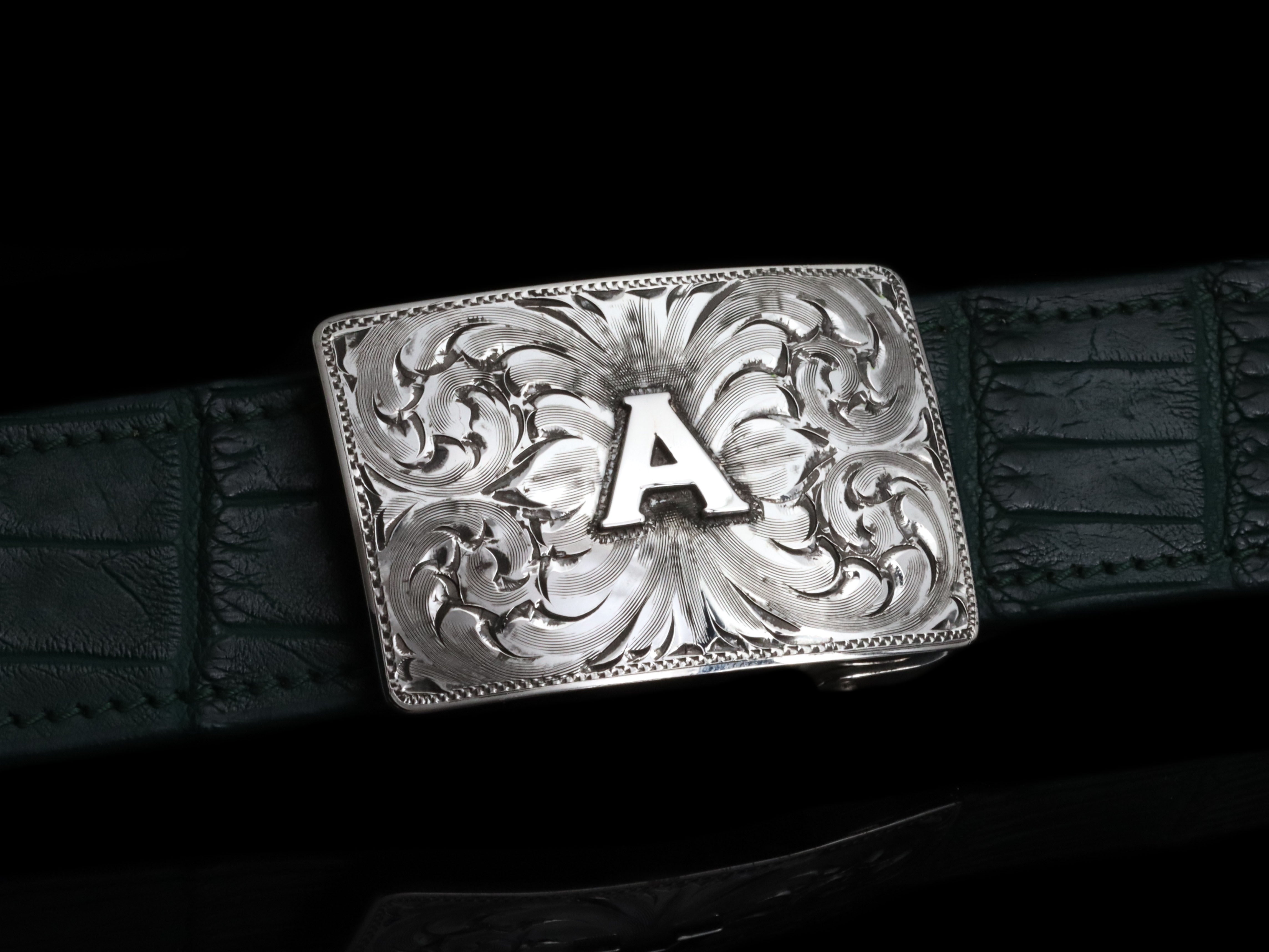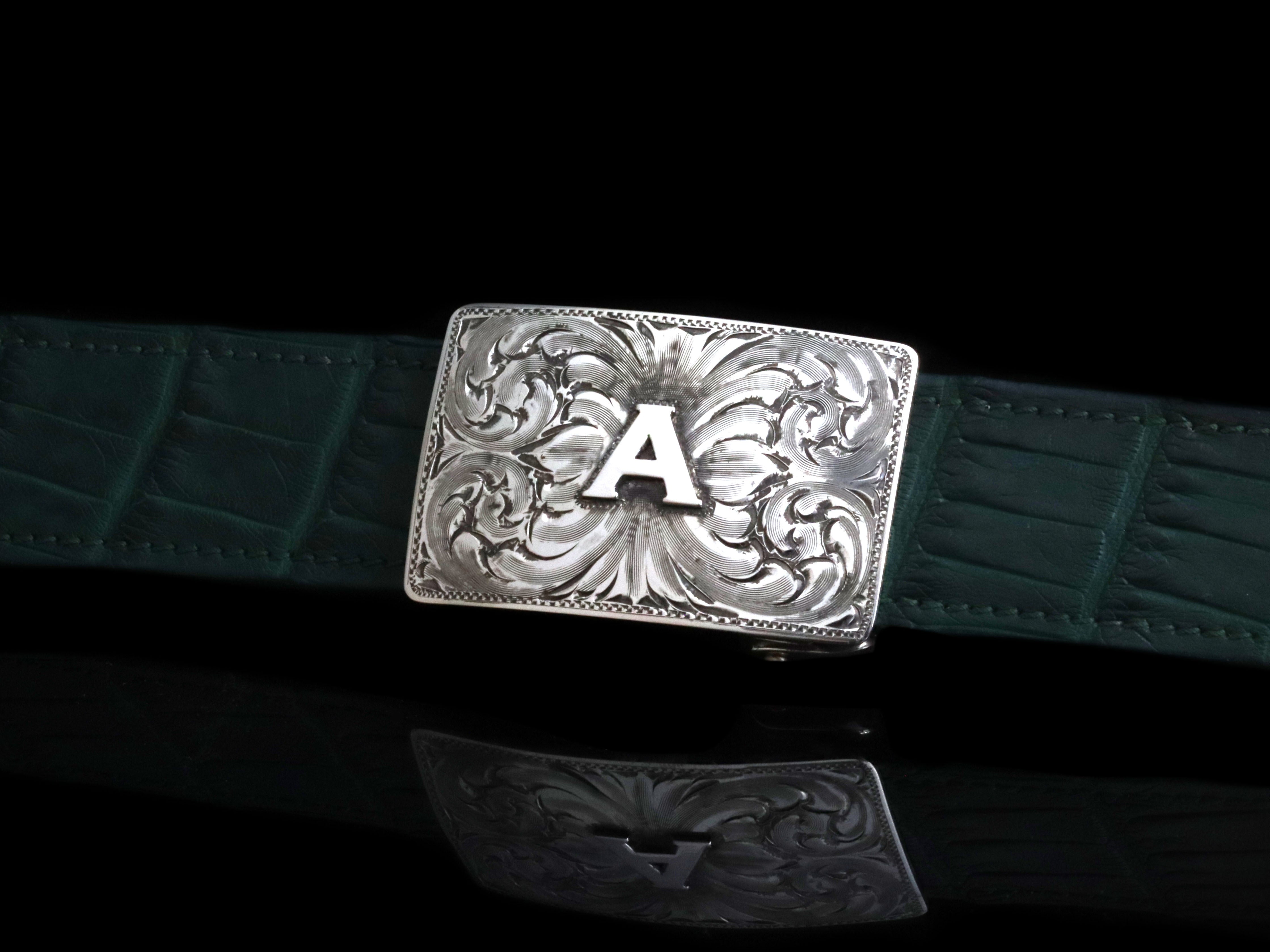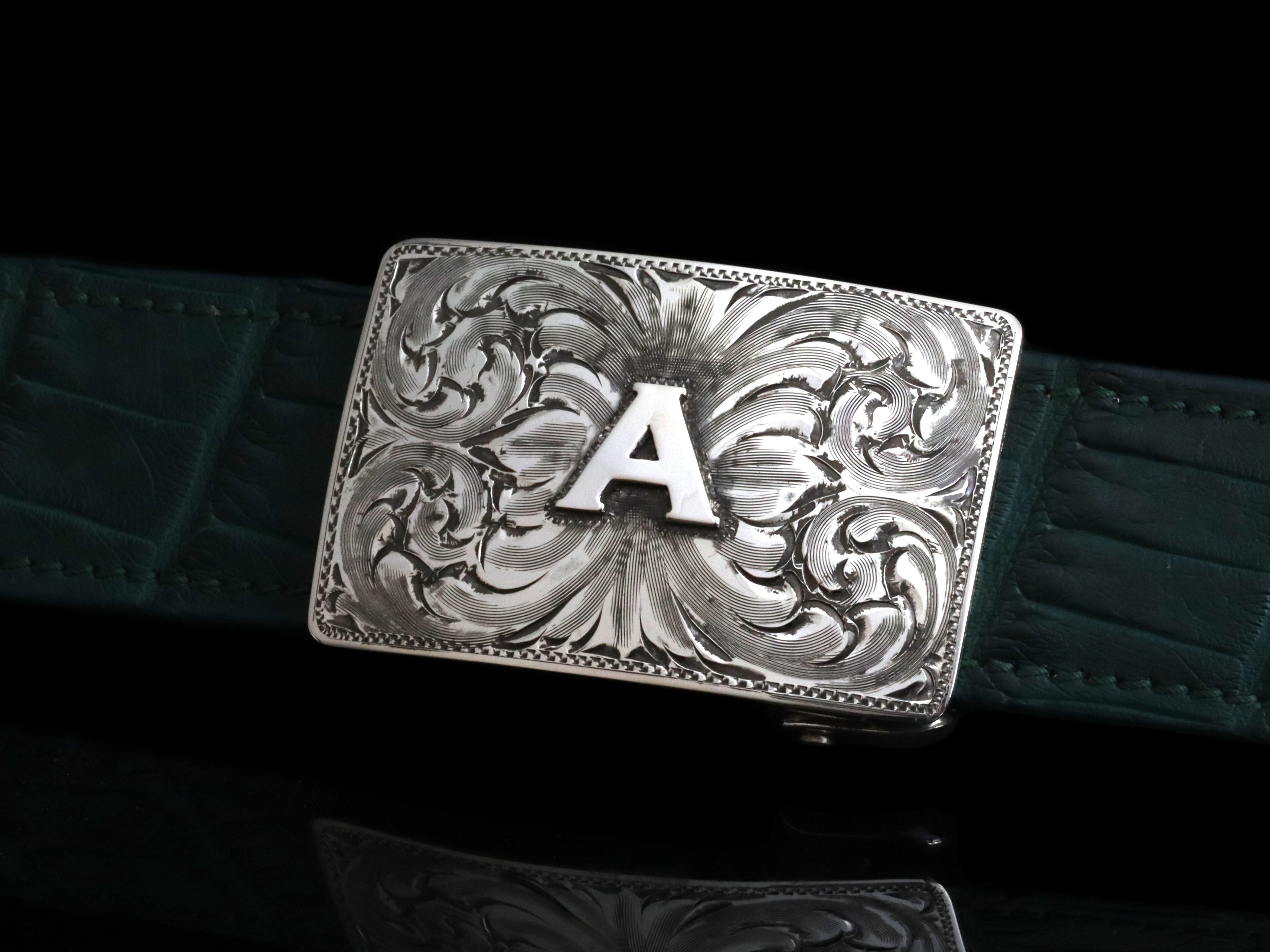 The Mesa Scroll With One Initial by Comstock Heritage is a Sterling silver lighter gauge "Mesa" shape buckle with rounded corners. This buckle is simple and elegant as it features our "Scroll" style hand engraving as the perfect backdrop for a stand-out center initial.