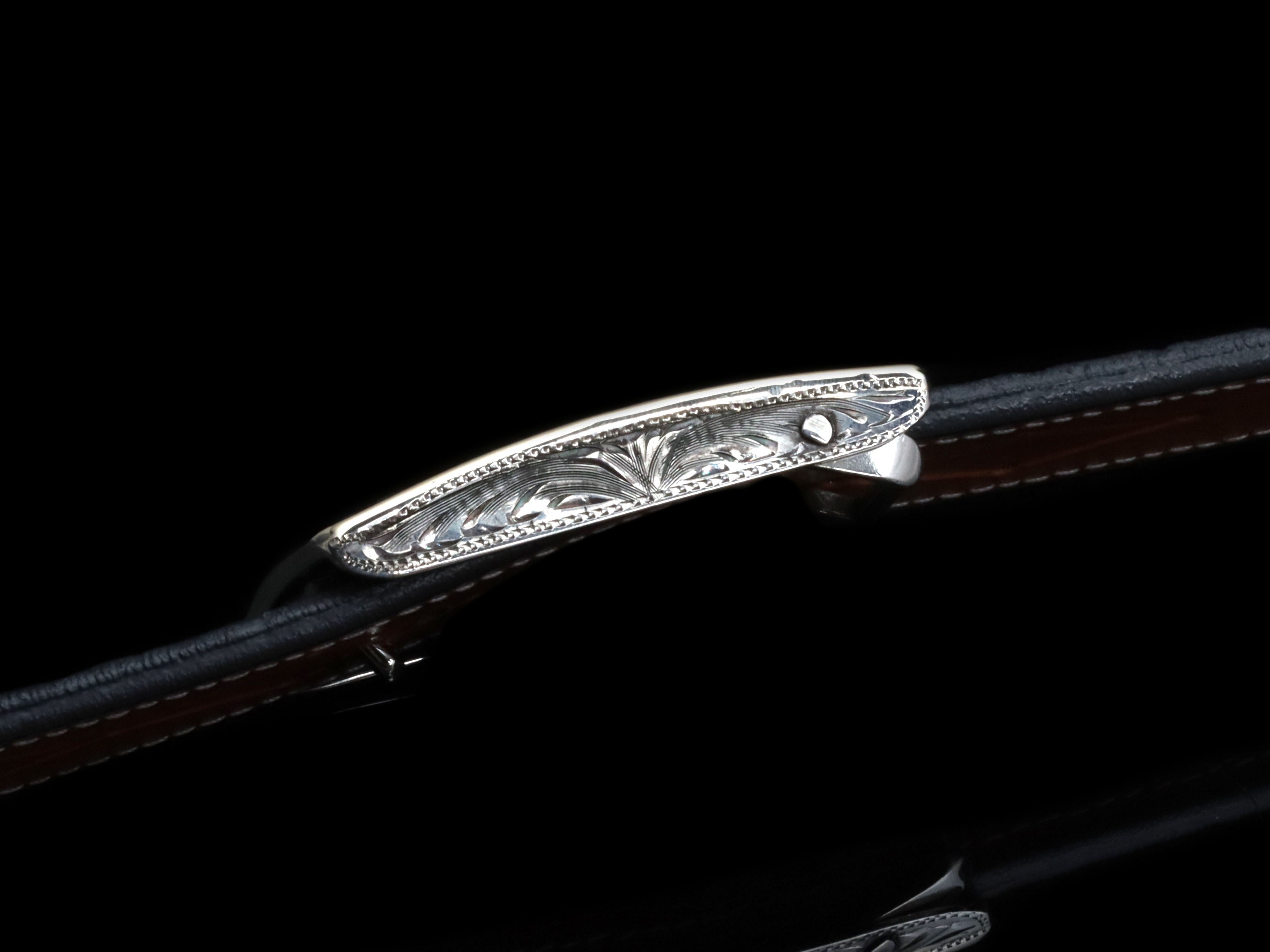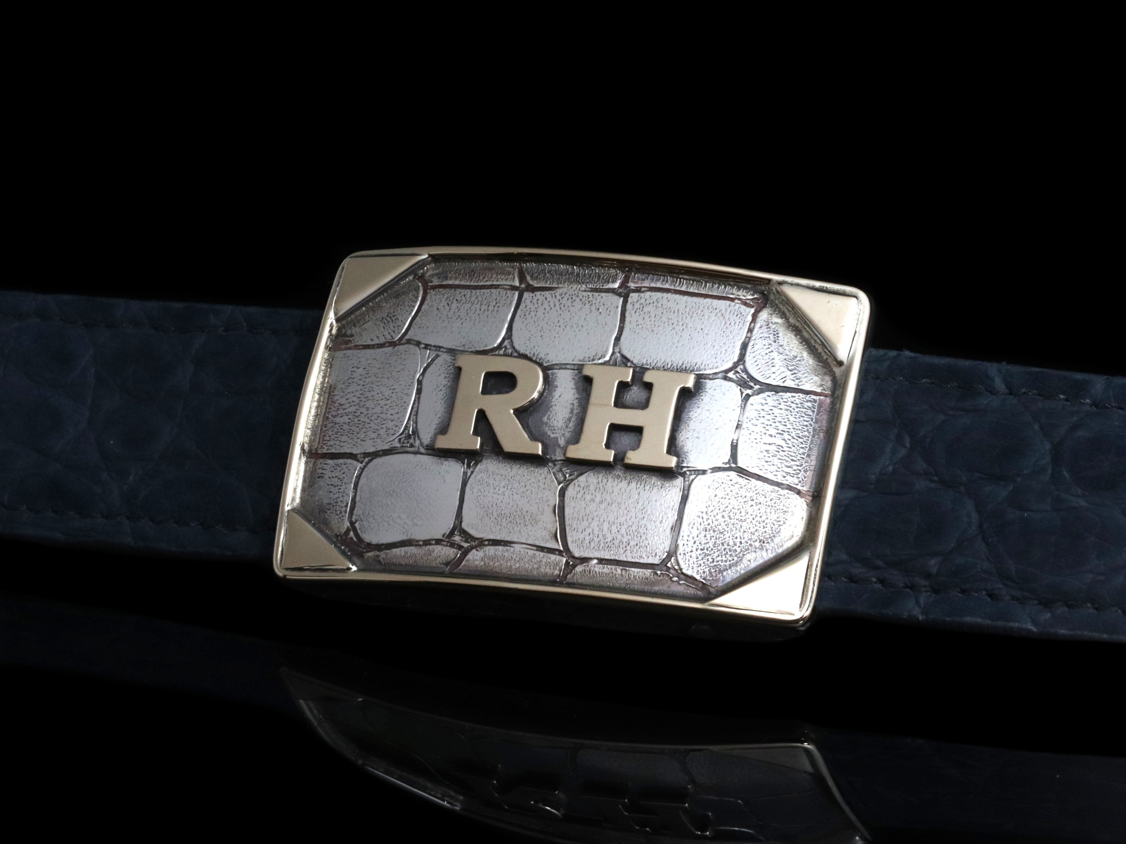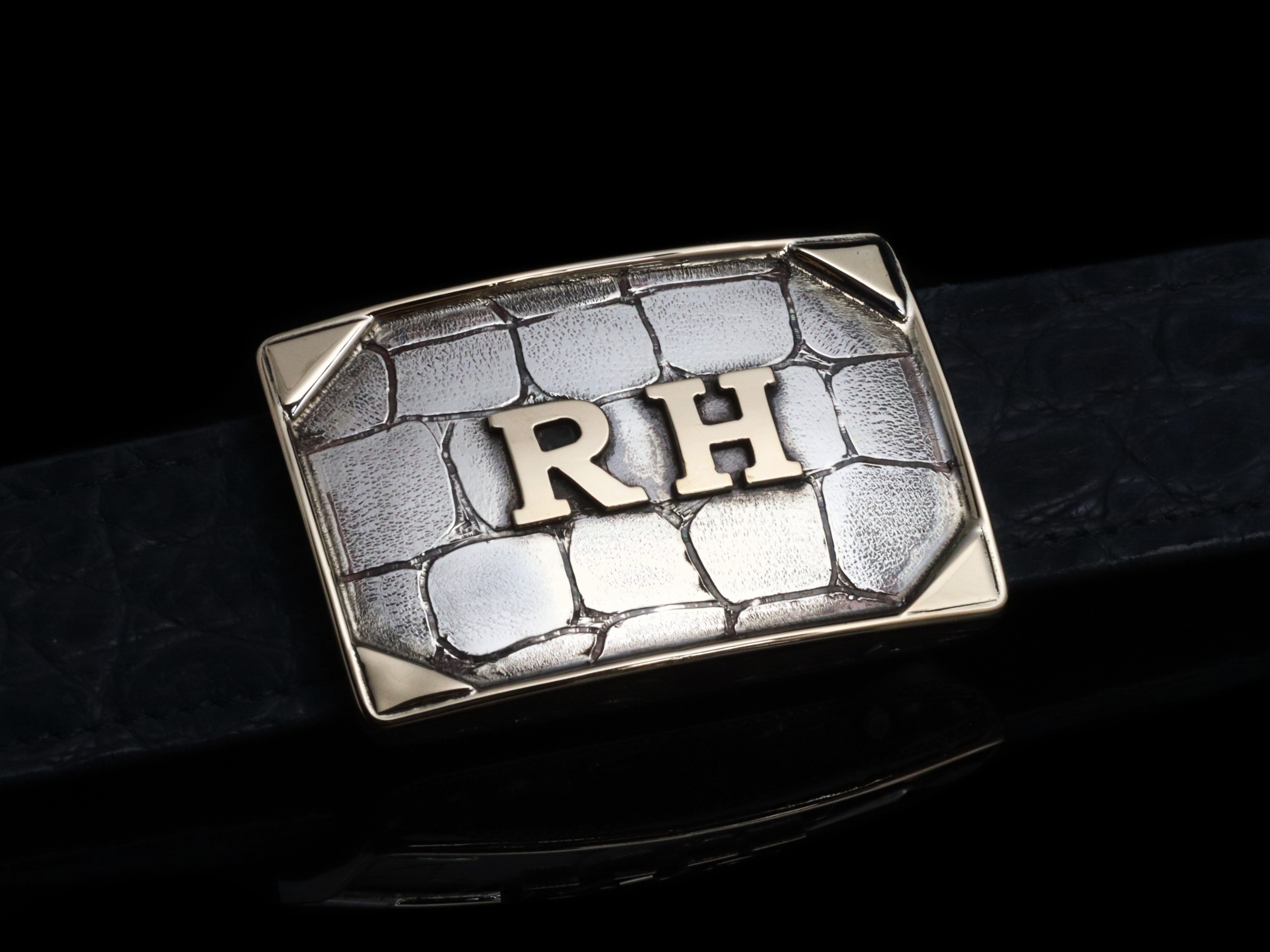 The Tyson Gator & Initials 14k by Comstock Heritage is a military style "Tyson" shape belt buckle featuring a 14k yellow gold wire edge. We then added two matching 14k gold hand cut initials of your choice in the center of our new "gator" style engraved background. This piece has our traditional "Tyson" top and bottom sides, making it hug your 1 ¼" belt perfectly.