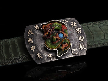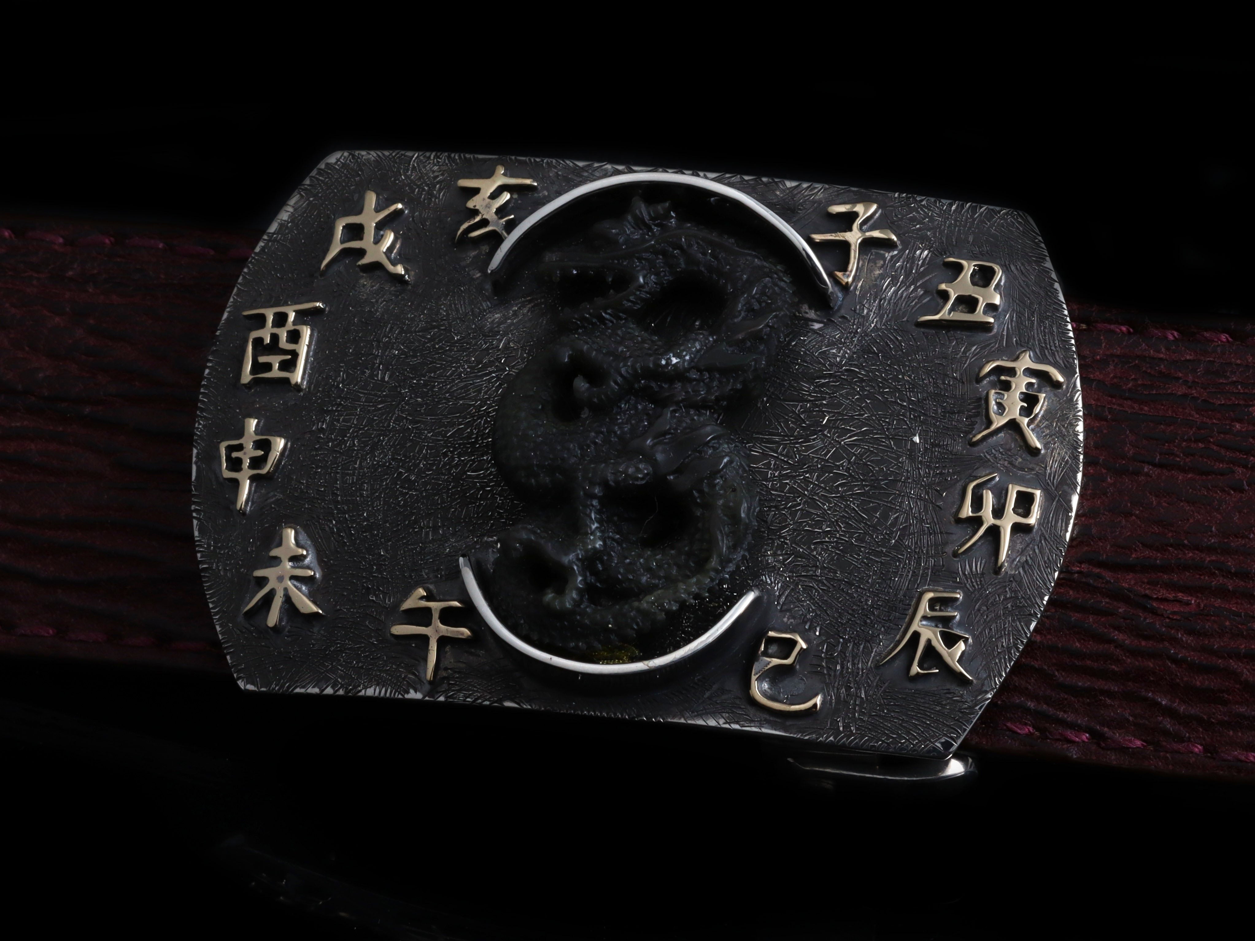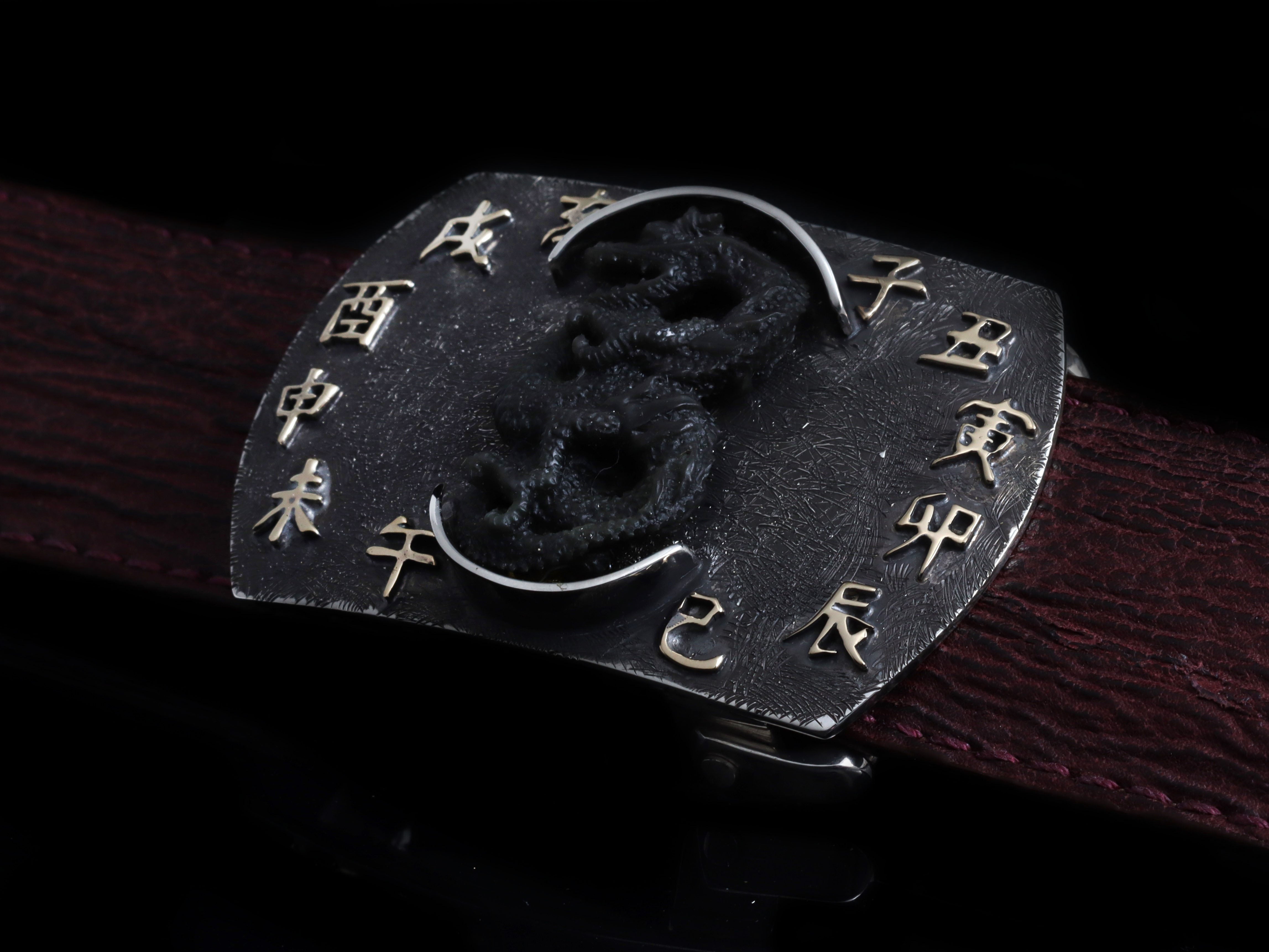 The Halogen Zodiac Dragon is a sterling silver buckle in a distinctive "Halogen" shape, showcasing exceptional craftsmanship and a blend of materials. At its center, a hand-carved dragon is flanked by 18k yellow gold Chinese zodiac characters, all set against intricate Poe-style engraving. The buckle features a dark finish, creating a striking contrast with the bright gold accents.