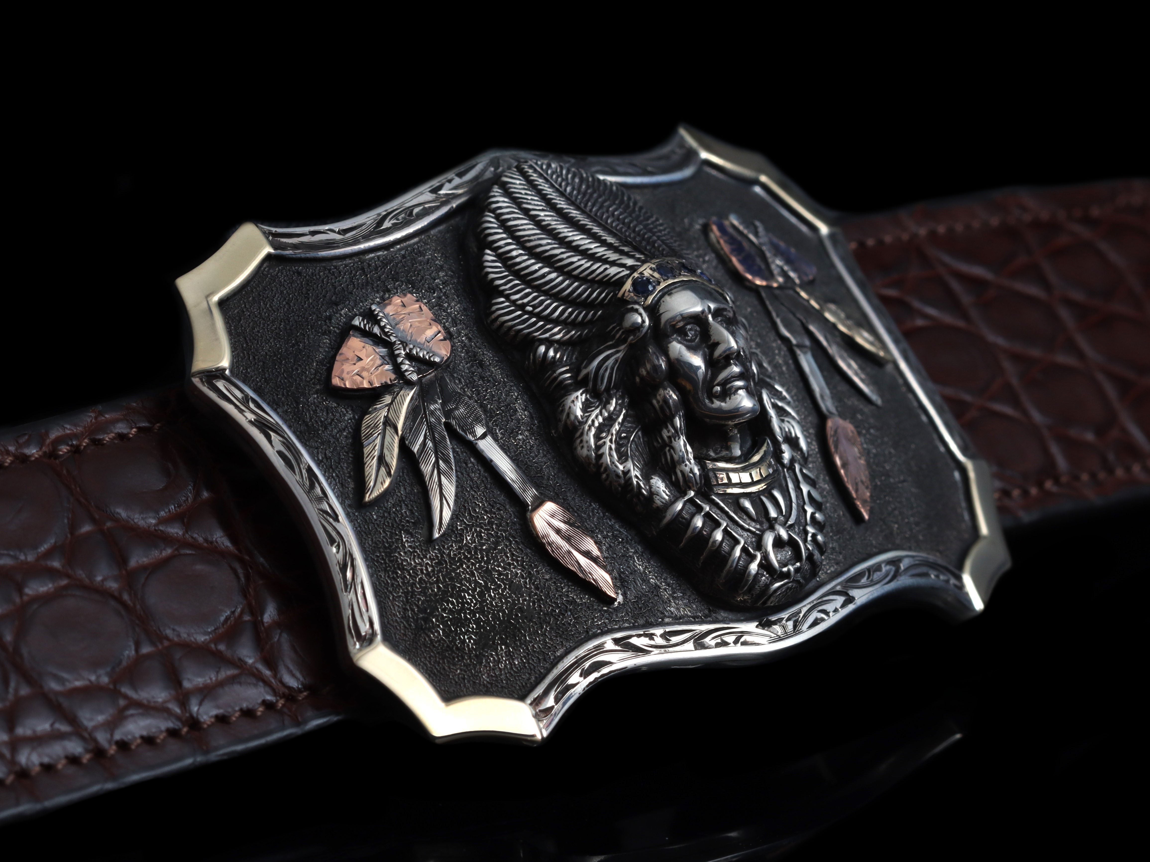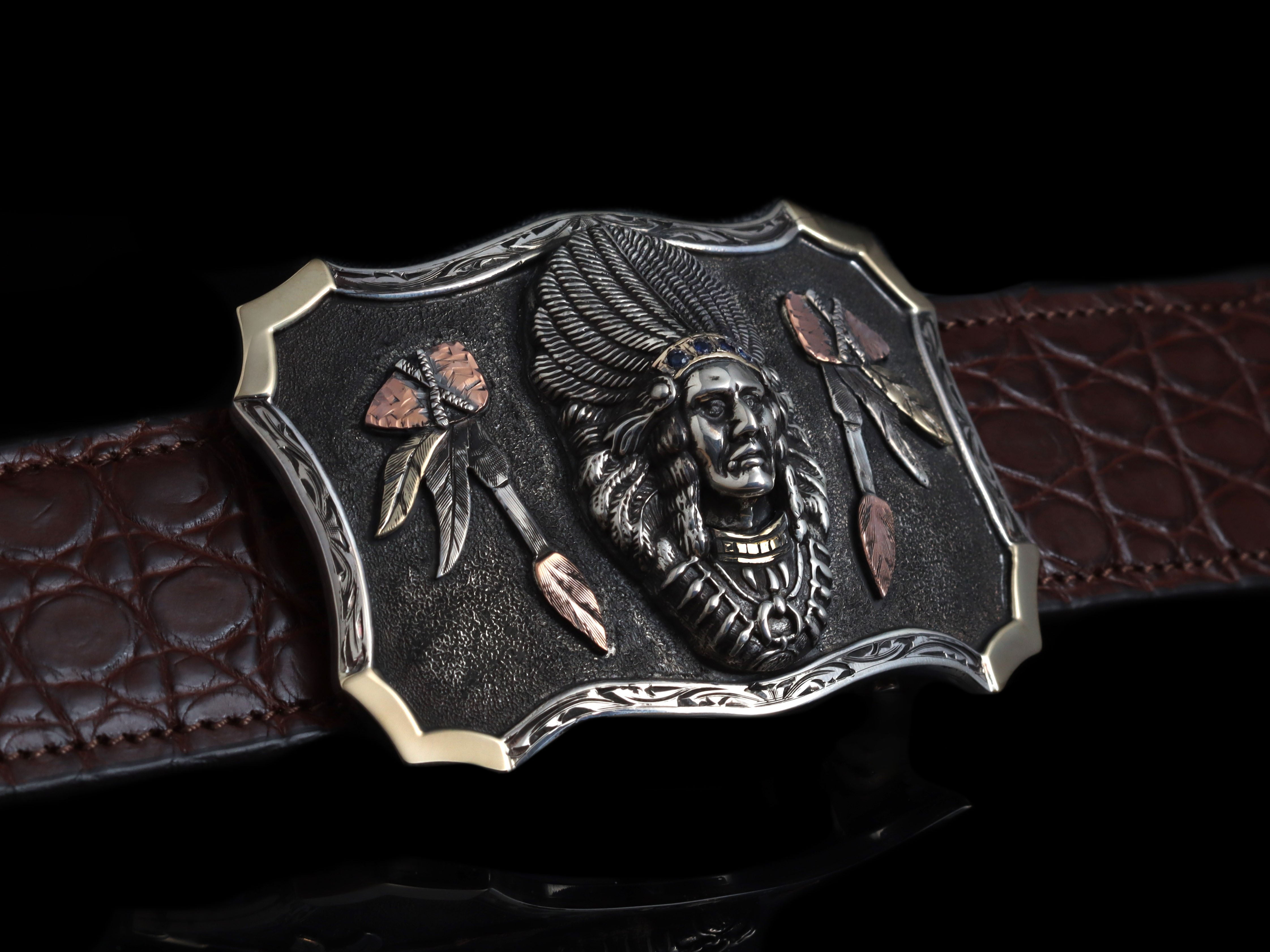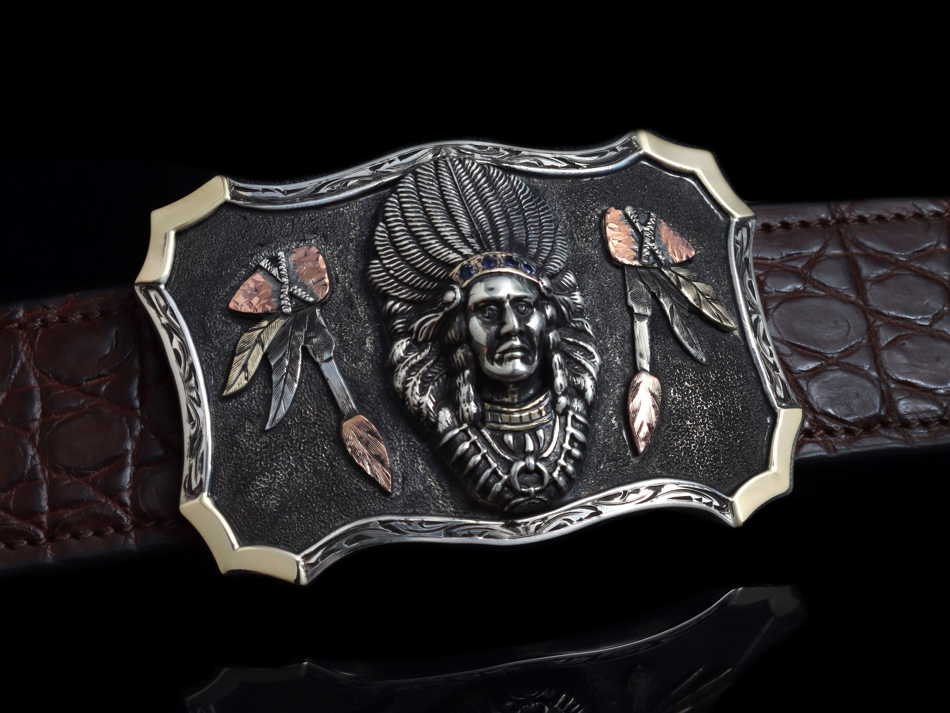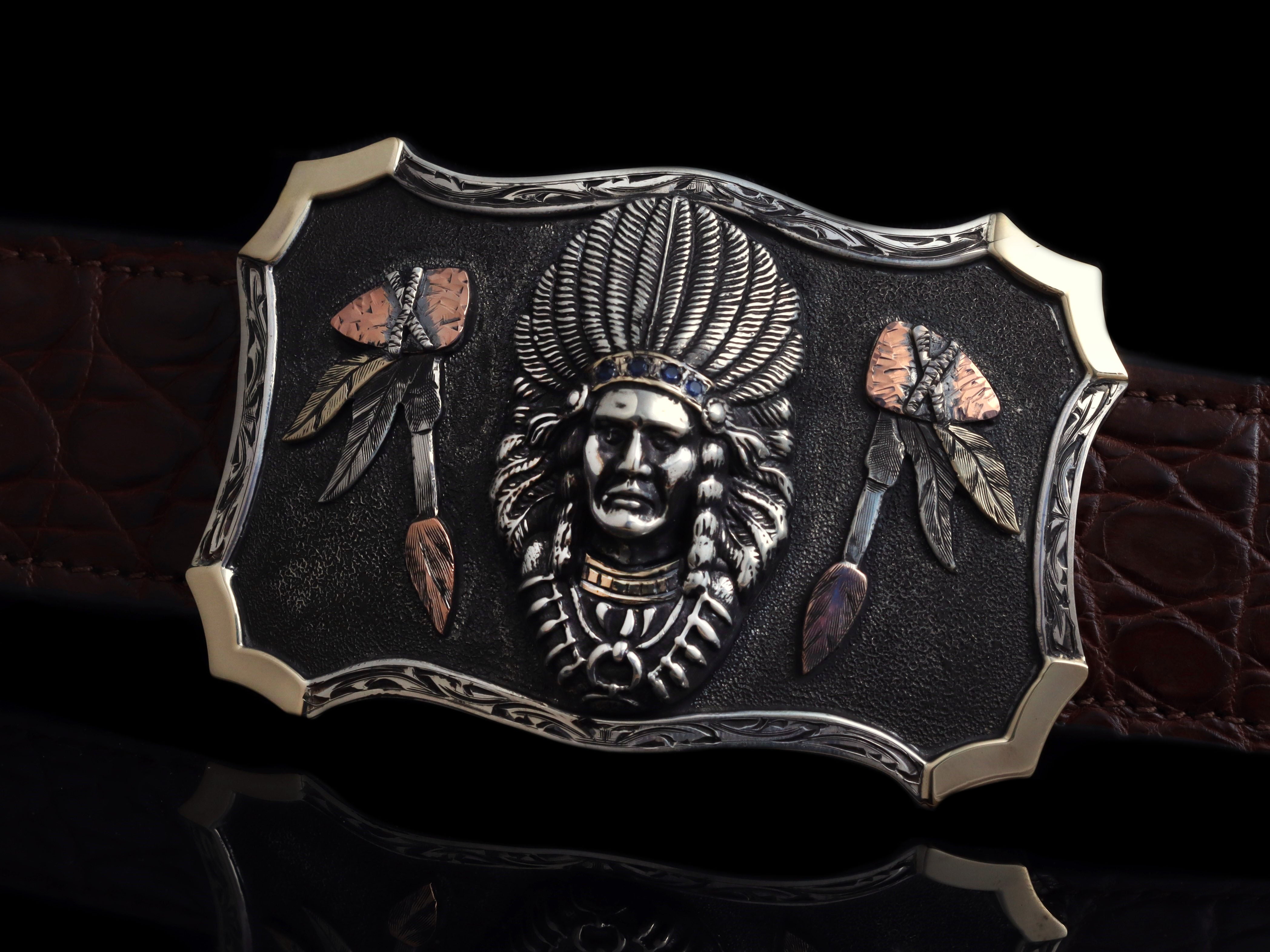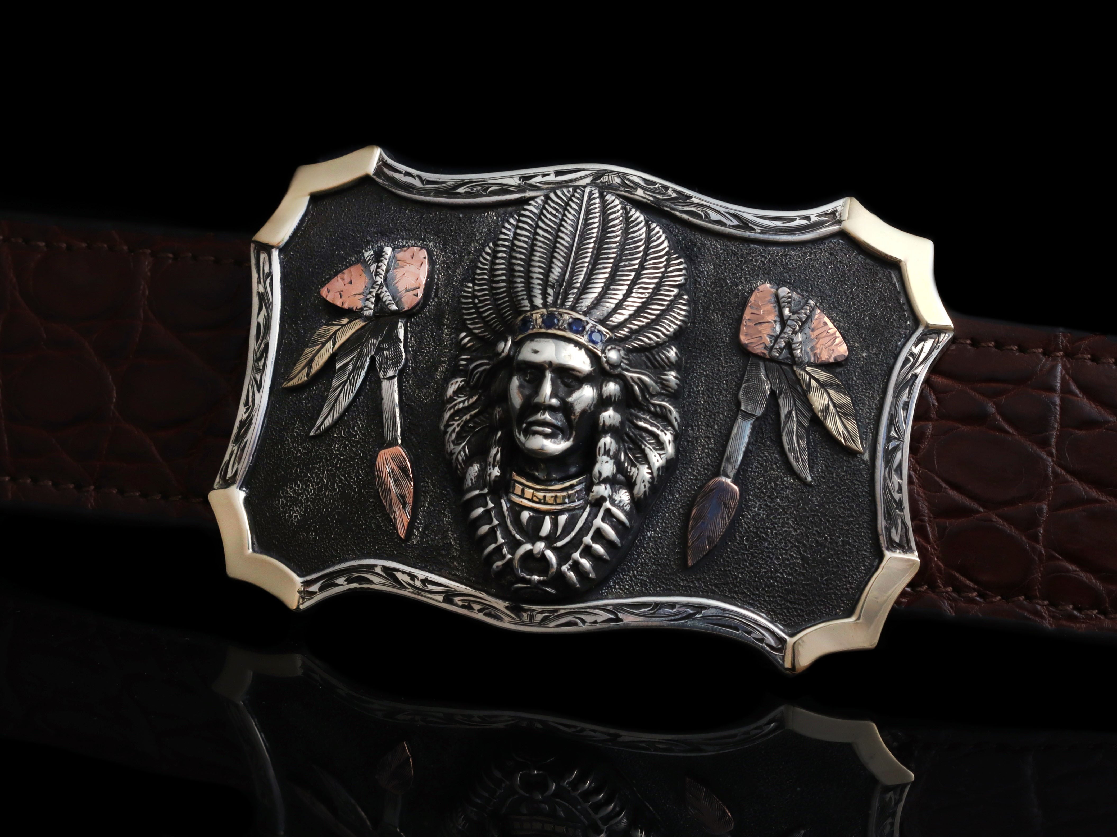 The Heraldic Ute 14k by Comstock Heritage is a Sterling silver "Heraldic" shaped trophy buckle with plenty of gold and color. The wide border has Sterling silver engraved parts, interrupted by 14k yellow gold corners that match the Ute's necklace, headband, and the tomahawk feathers. The large, solid, Sterling silver Ute in the center has blue sapphires in his headdress, and his flanked by two Sterling and gold tomahawks. This piece is then darkened for an antiqued finish.