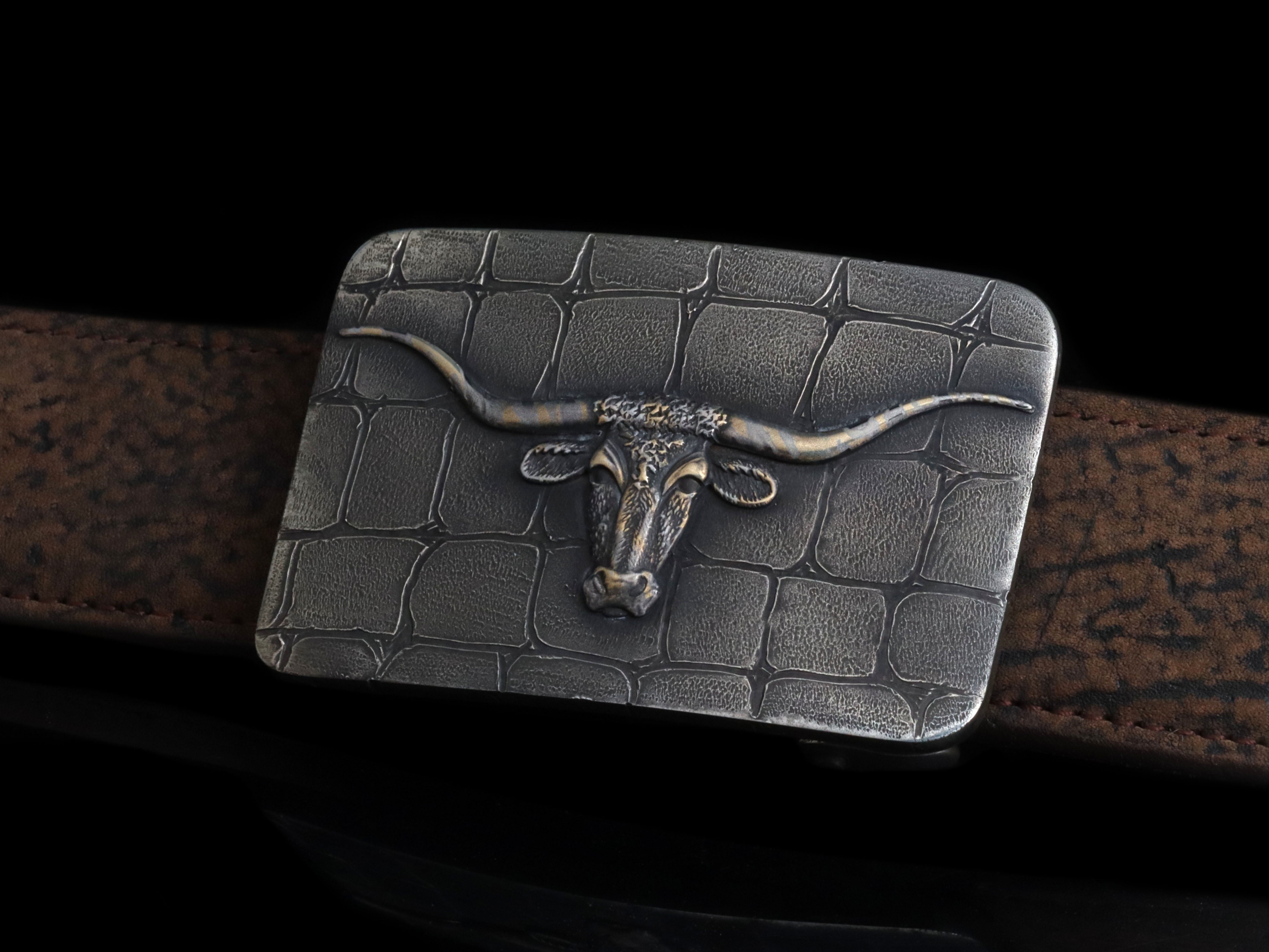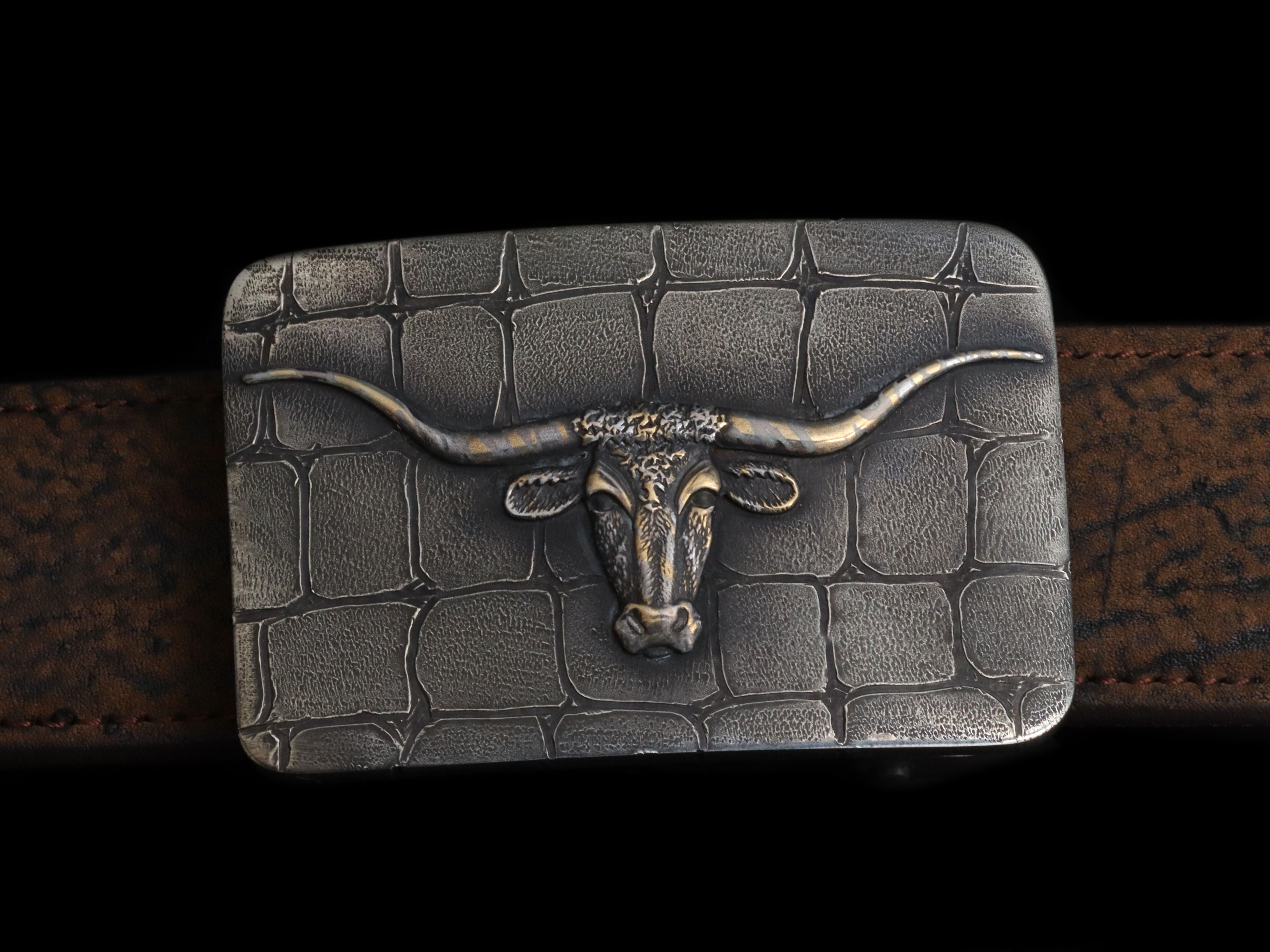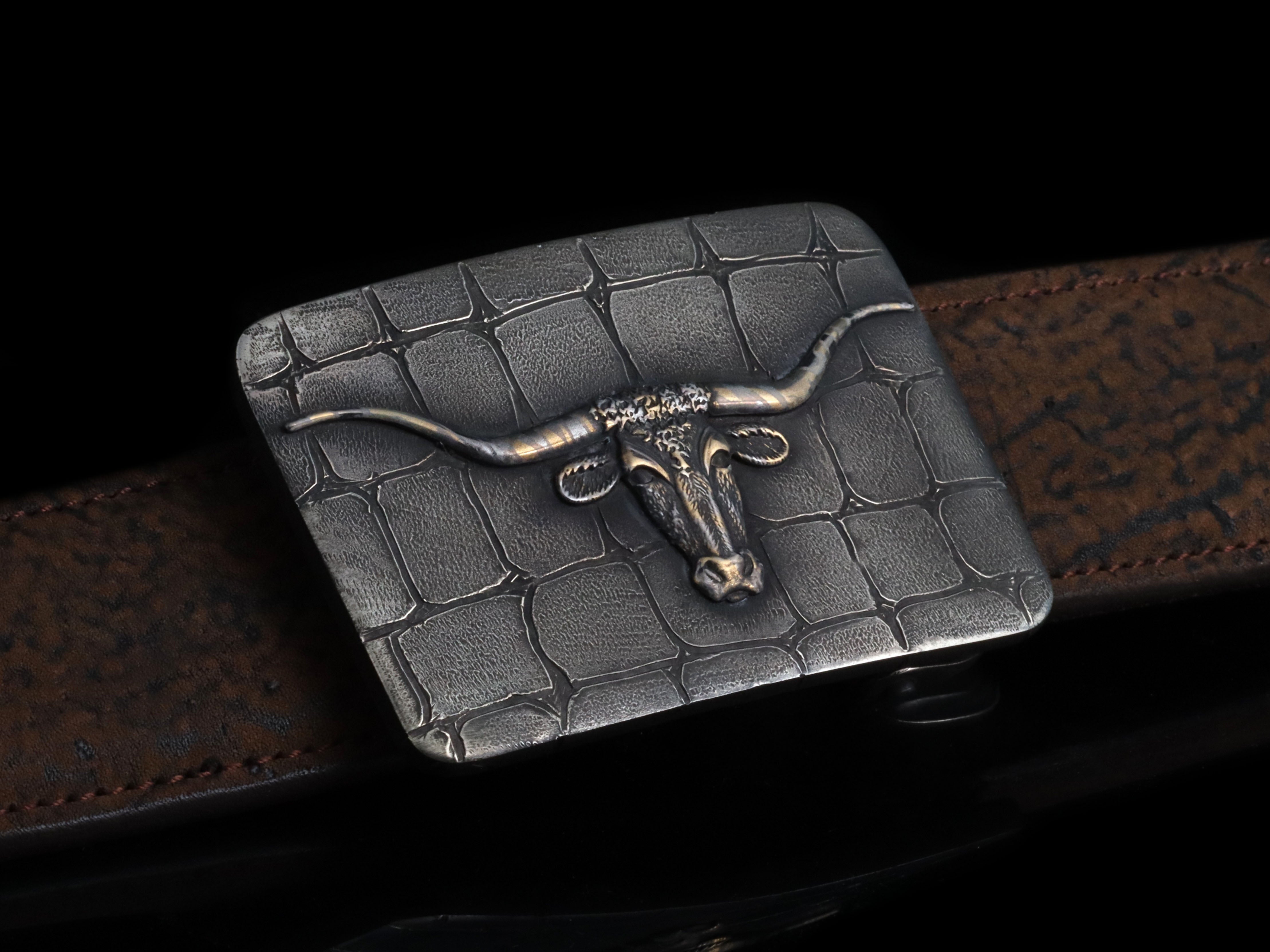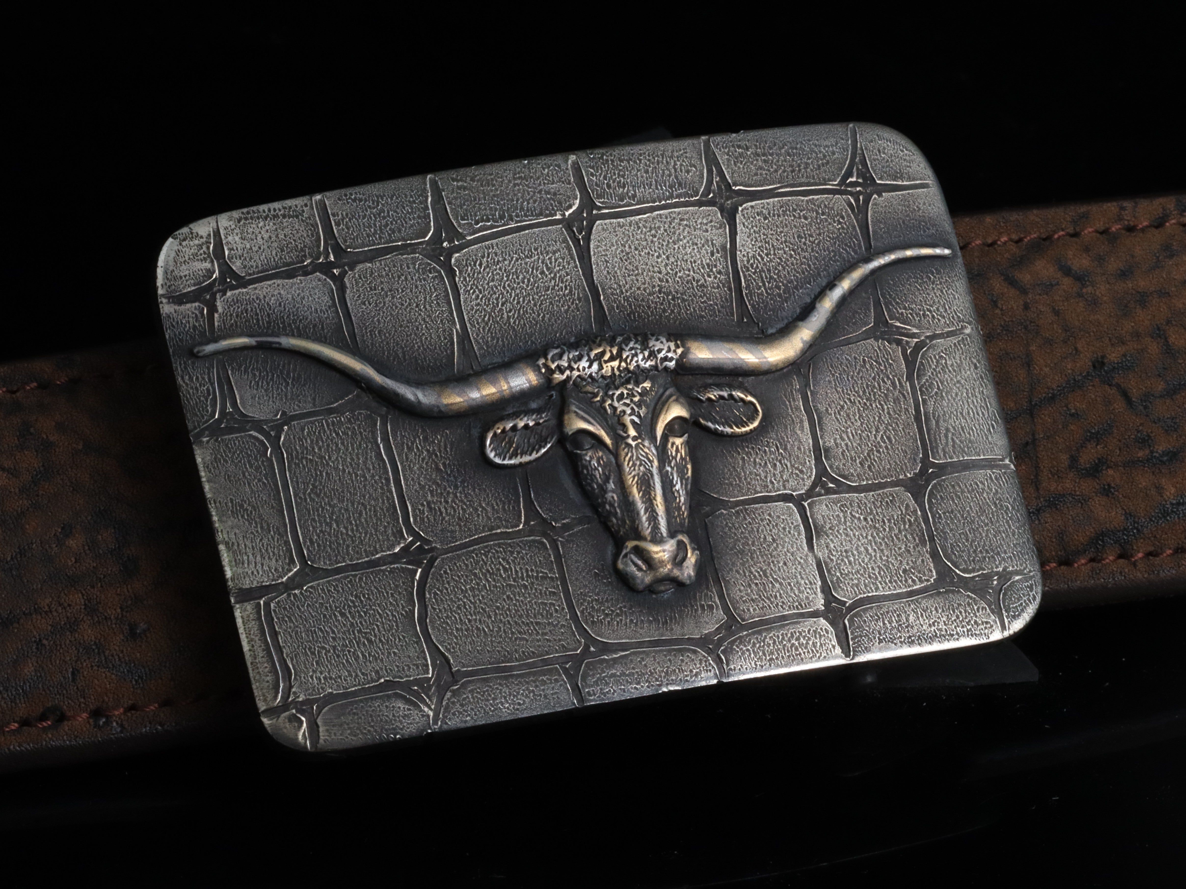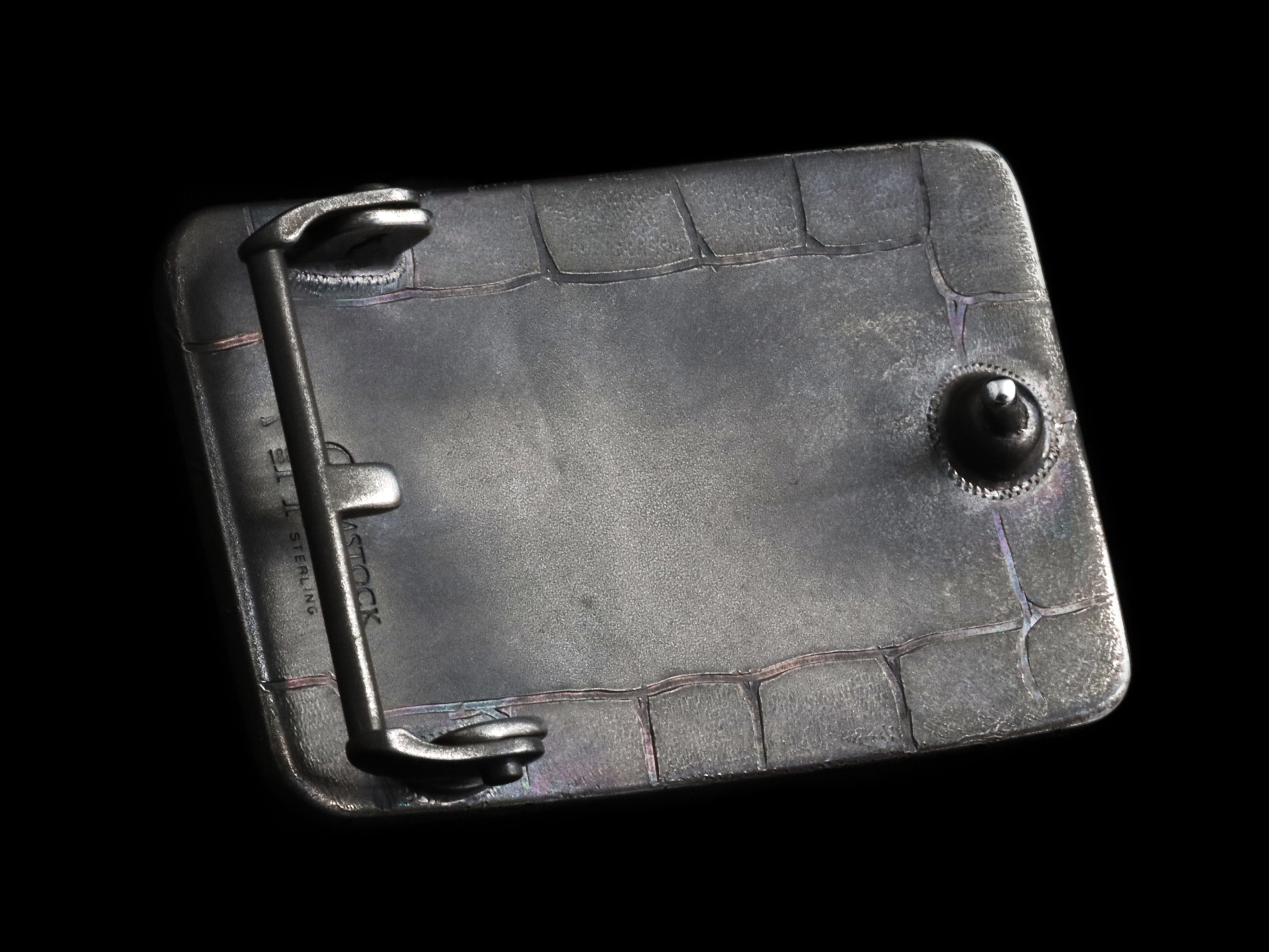 This design beautifully merges two of our favorite motifs into a remarkable buckle. The imagery of the Mokume Gane Texas longhorn cattle is elegantly complemented by the hand-engraved "gator" style background on the front. Crafted from Sterling silver with a sturdy bar back by Comstock Heritage, the Mokume Gane technique - originating from Japan - involves fusing layers of differently colored metals to create stunning, wood-grain patterns.