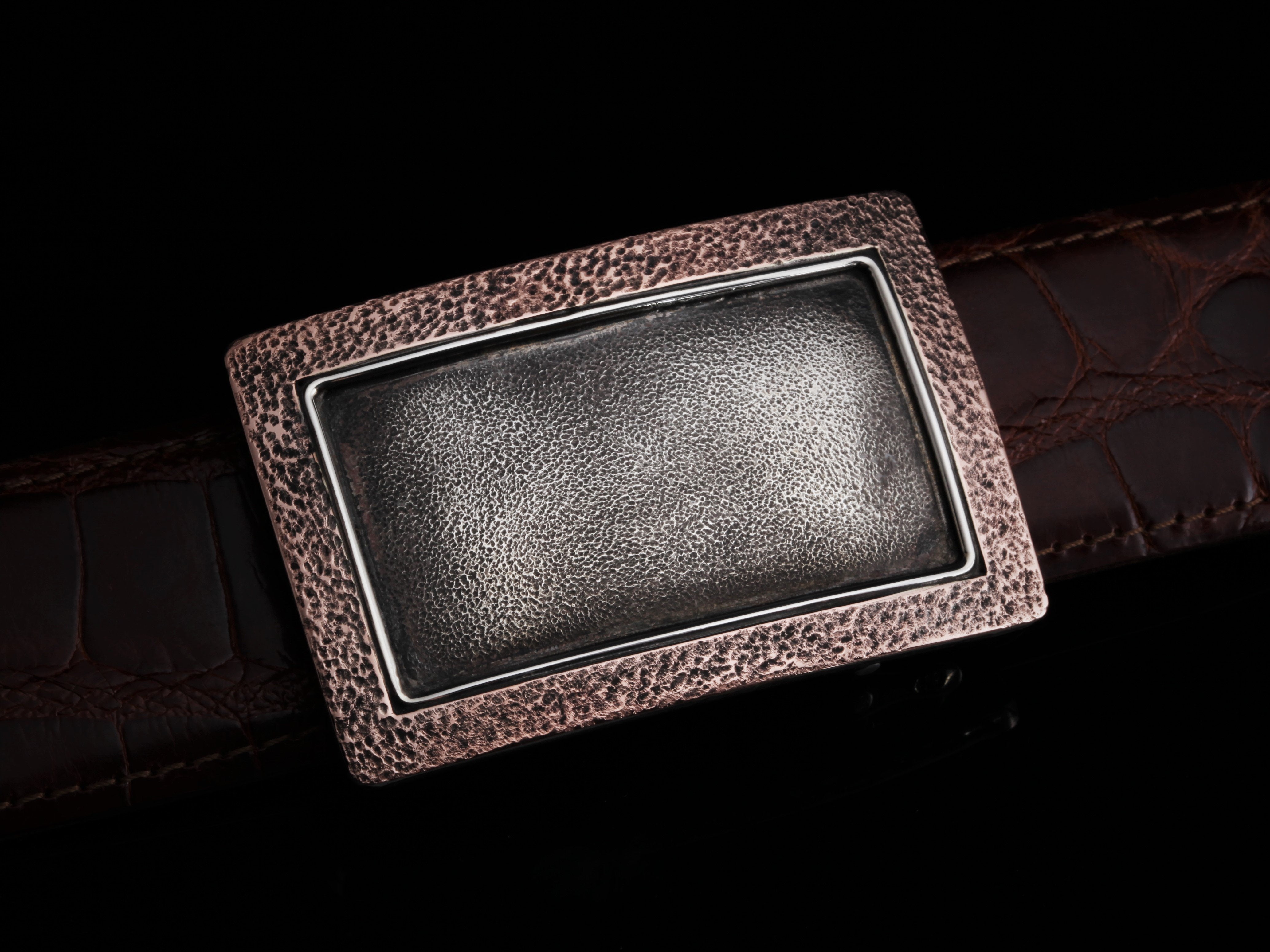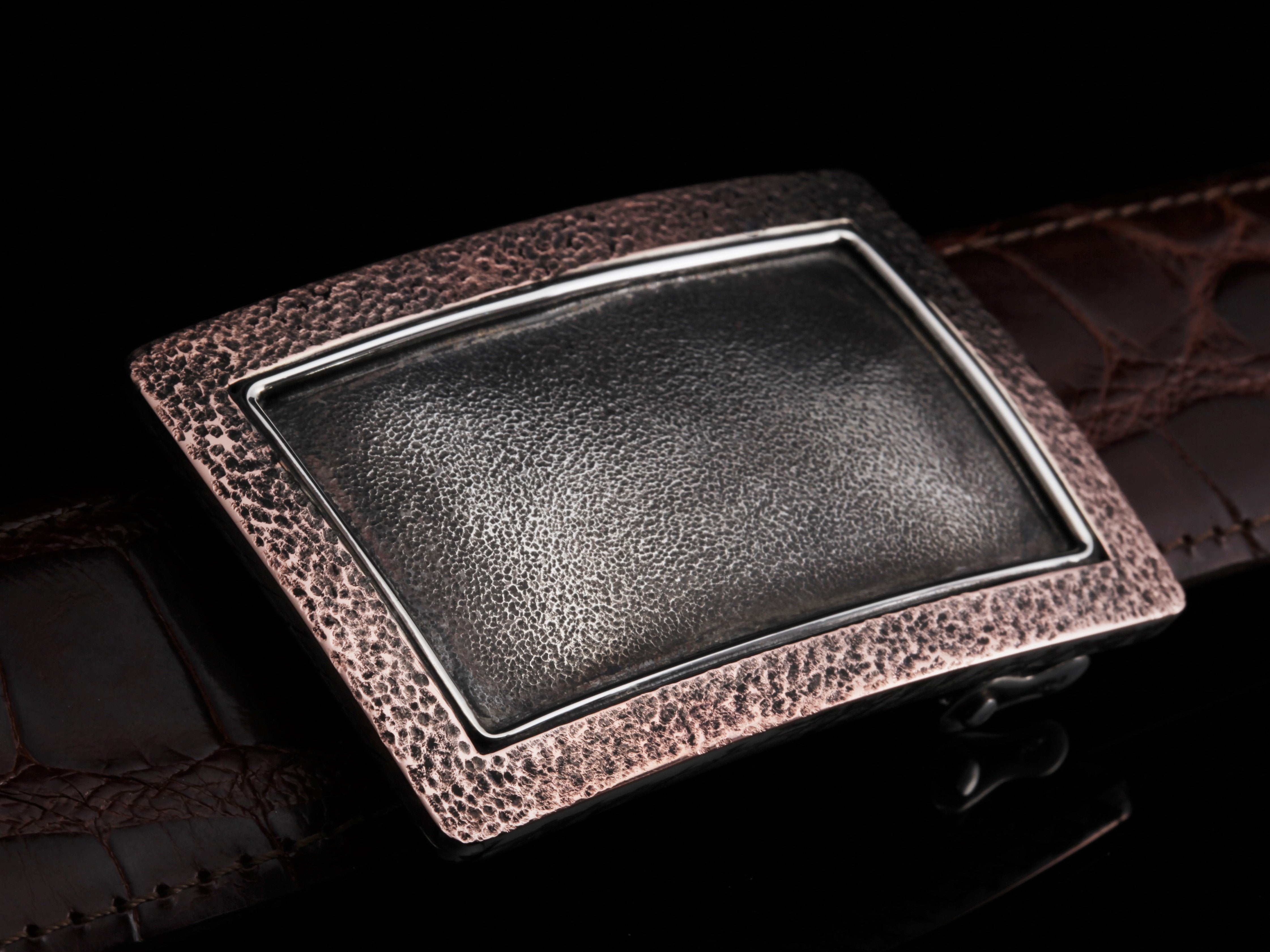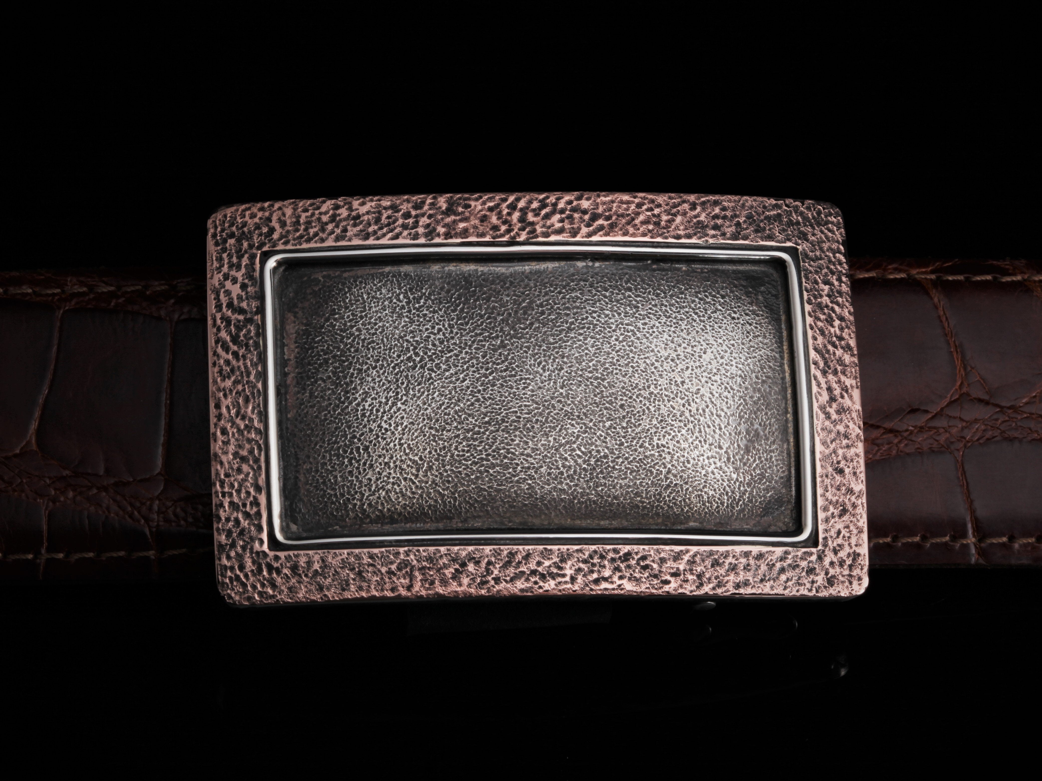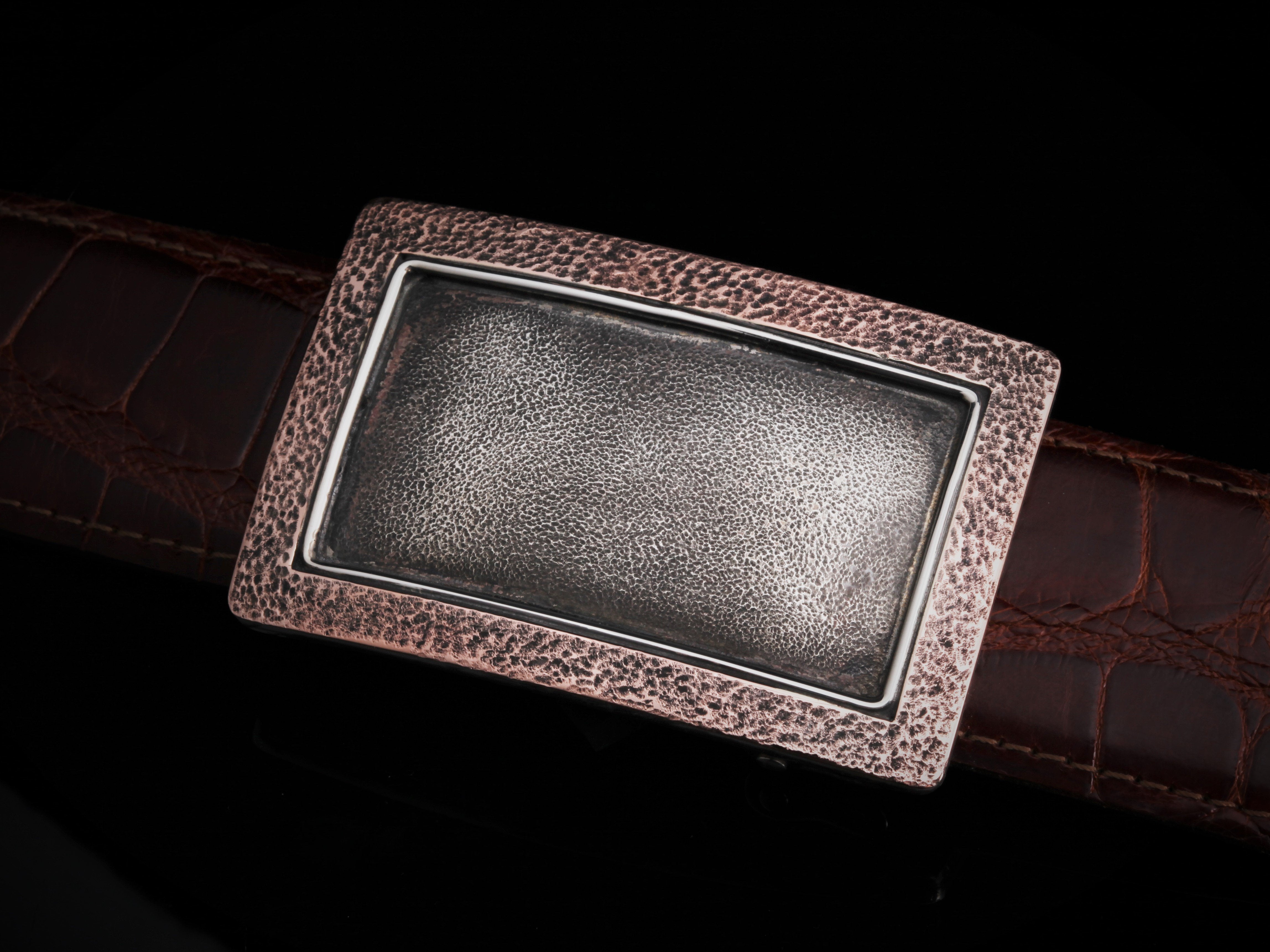 The Mason Miller by Comstock Heritage is a Sterling silver "Mason" style buckle that blends texture and tone for a clean, balanced design. Both the border and center feature a hand-hammered finish, with the smaller Sterling silver center plate framed by a wider 14k rose gold hammered border. A final antiqued treatment enhances the depth and highlights the handcrafted detail.