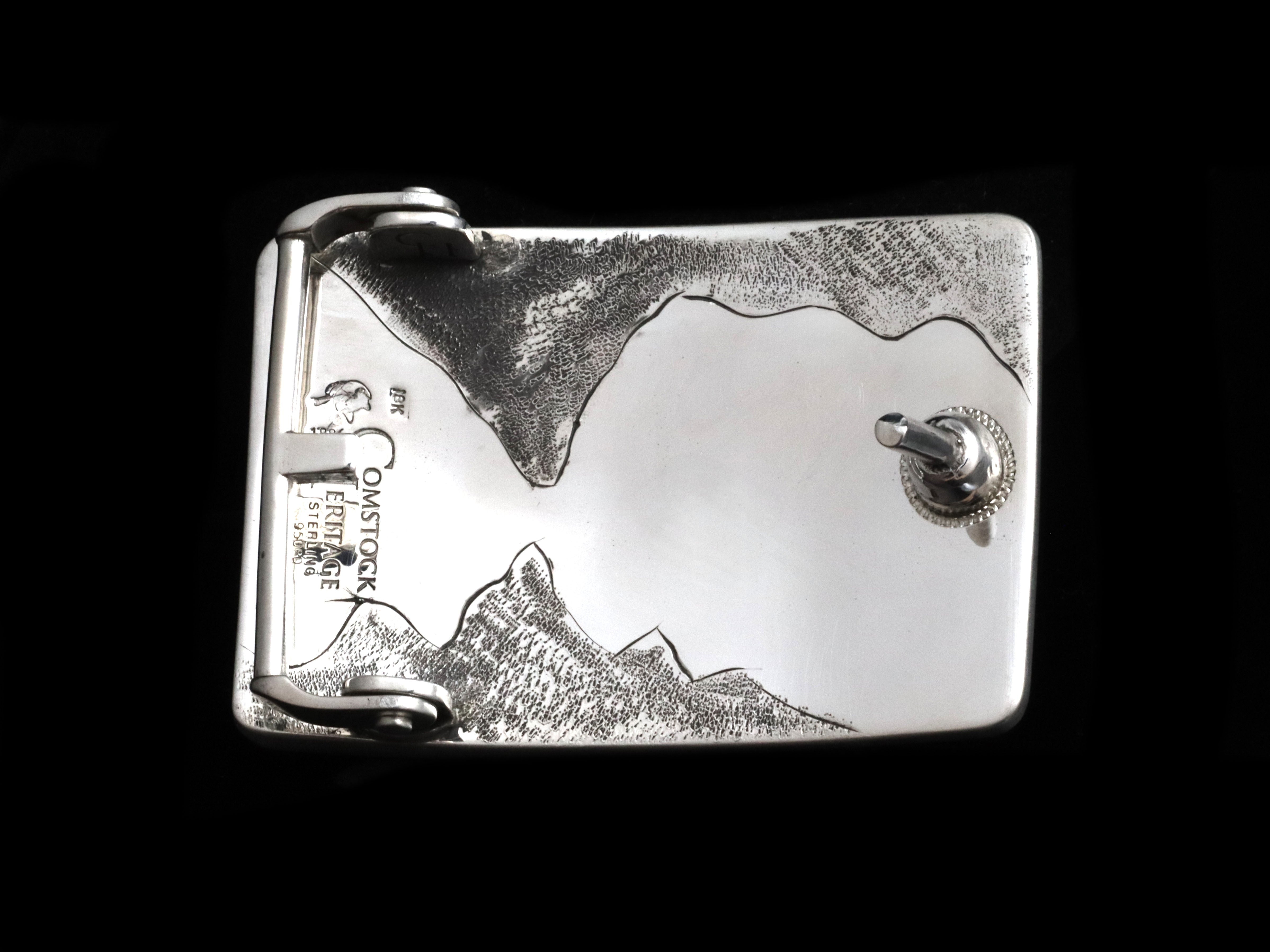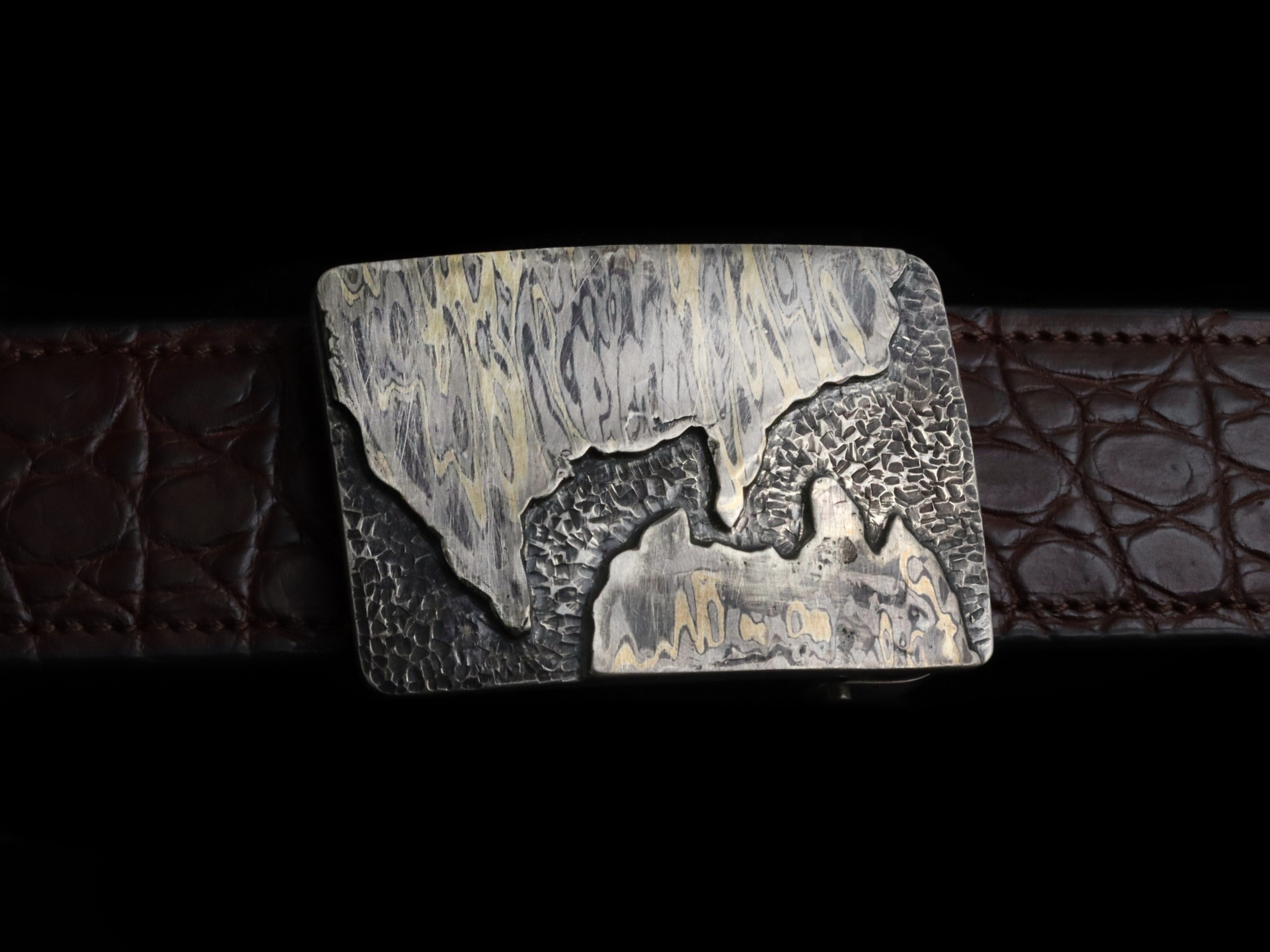 The Mason Passage by Comstock Heritage is a remarkable fusion of art and color, showcasing the beauty of an age-old technique known as Mokume Gane. Two hand-cut pieces of Mokume Gane are layered, creating a striking passage that invites exploration. The sterling silver base is adorned with K-style hand engraving, featuring thousands of tiny cuts that appear random yet create a dynamic sense of motion. This intricate craftsmanship is enhanced by an antiqued finish, giving the piece a darker, more sophisticated look. The Mason Passage is not just a piece of jewelry; it's a testament to artistry and tradition.