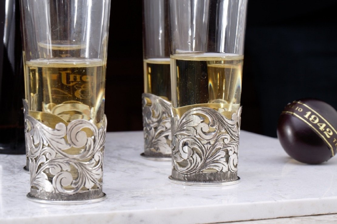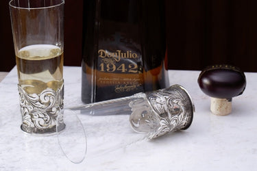 Our hand crafted filigree Sterling silver Shot glasses are an impressive addition to anyone's personal bar. This pattern is drawn by hand as it elegantly scales the side of the glass, and is then crafted from the ground up. Our craftsmen meticulously hand cut each piece of Sterling out and remove it, little by little, to create the see through experience. Exquisite, with glass insert as to better see the spirit.
