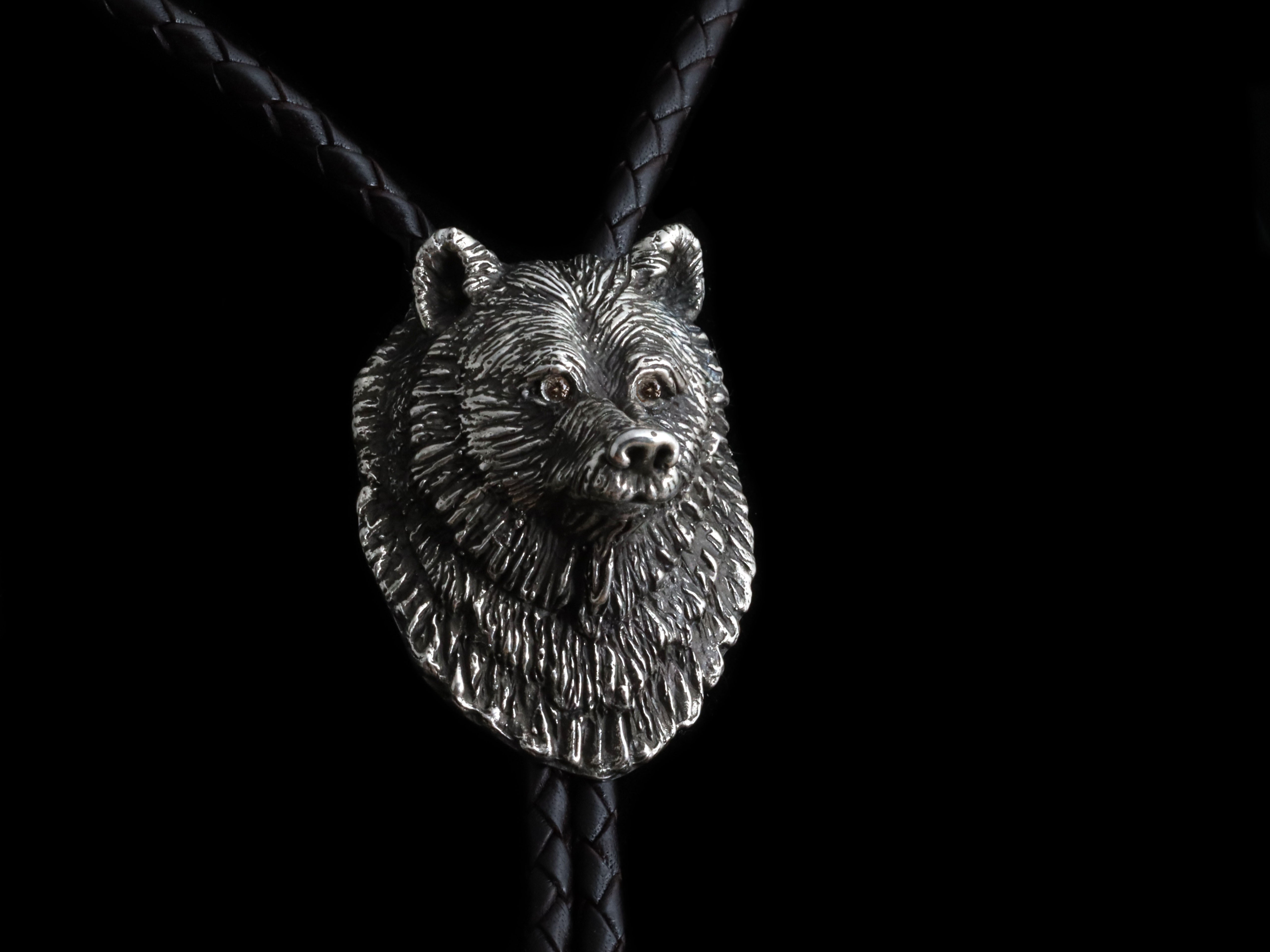 The Bear Bolo by Comstock Heritage is a finely crafted solid sterling silver piece featuring a detailed, heavy bear figure. In this version, we have added a pair of cognac diamonds to the eyes. Designed for both durability and style, it includes a full back and a secure bolo finding, making it easy to pair with cords or strings of your choice. A classic design that highlights expert craftsmanship, this bolo is a classic addition to any collection.