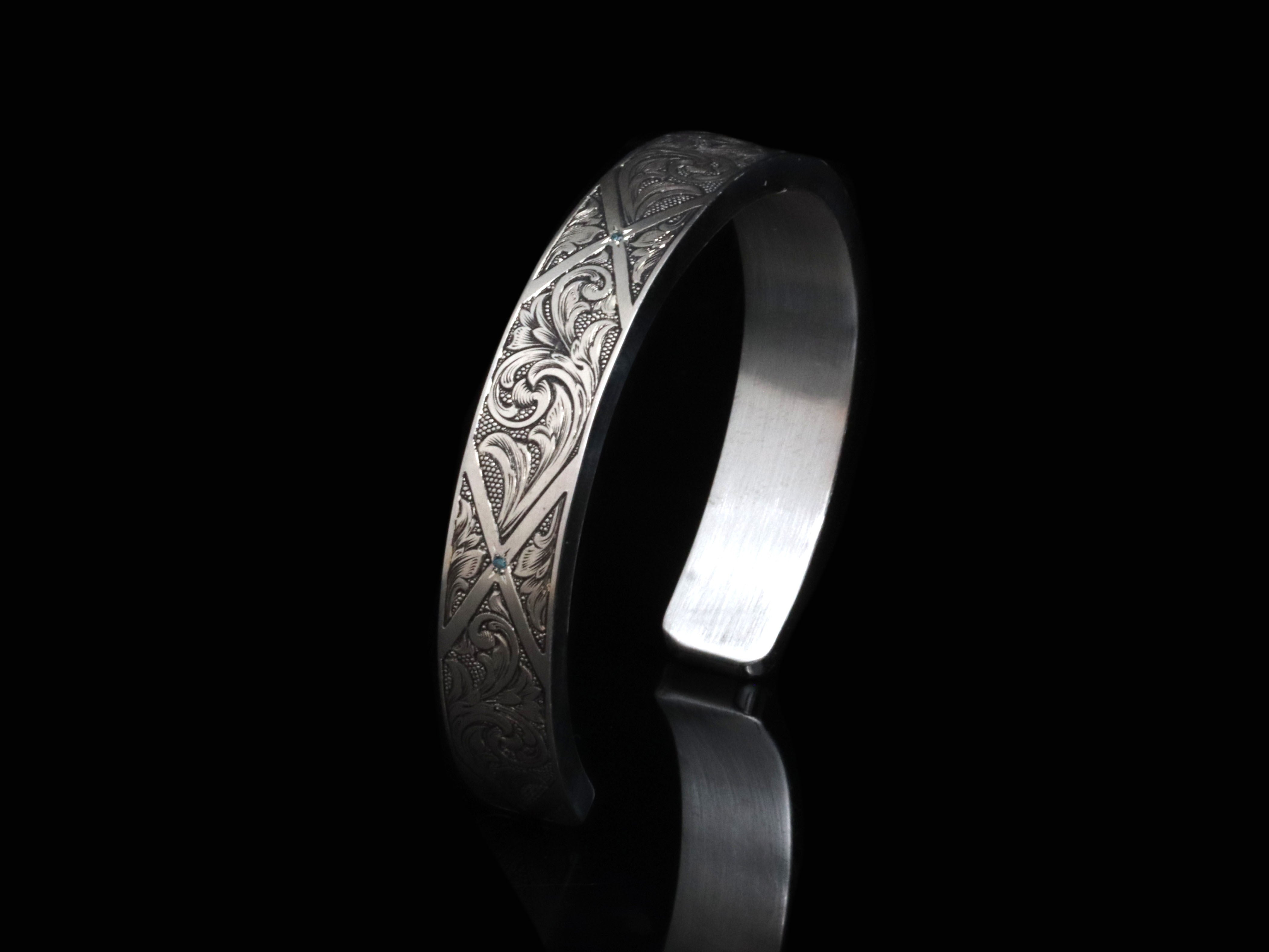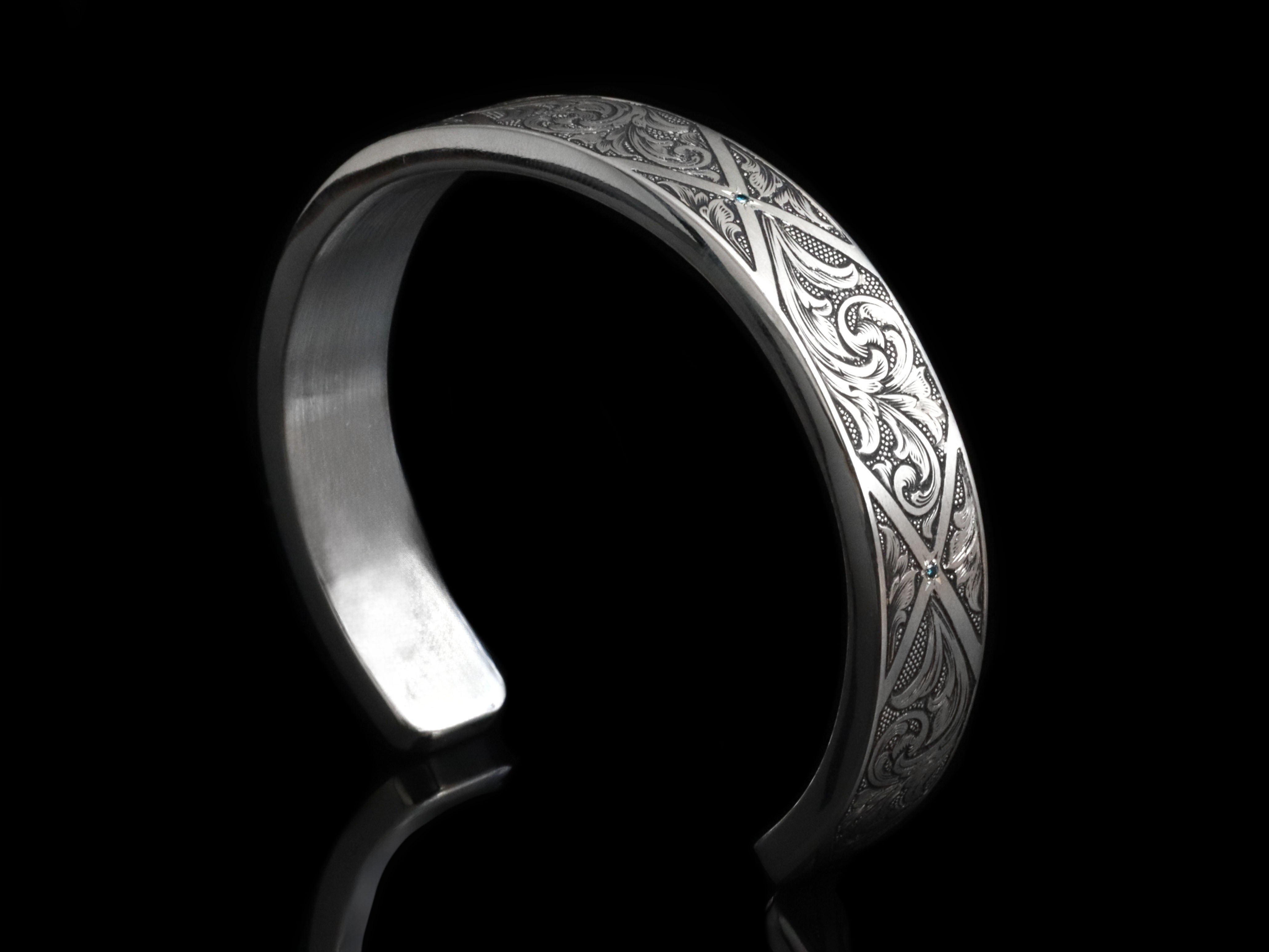The Sammut Cuff by Comstock Heritage is part of an exciting new line in collaboration with Sammut Designs. This Sterling silver ⅝” bracelet features a beautifully flowing engraved pattern, executed with precision. Blue diamonds sit in the apex of each cross section for a little glint as you show off your wrist.
