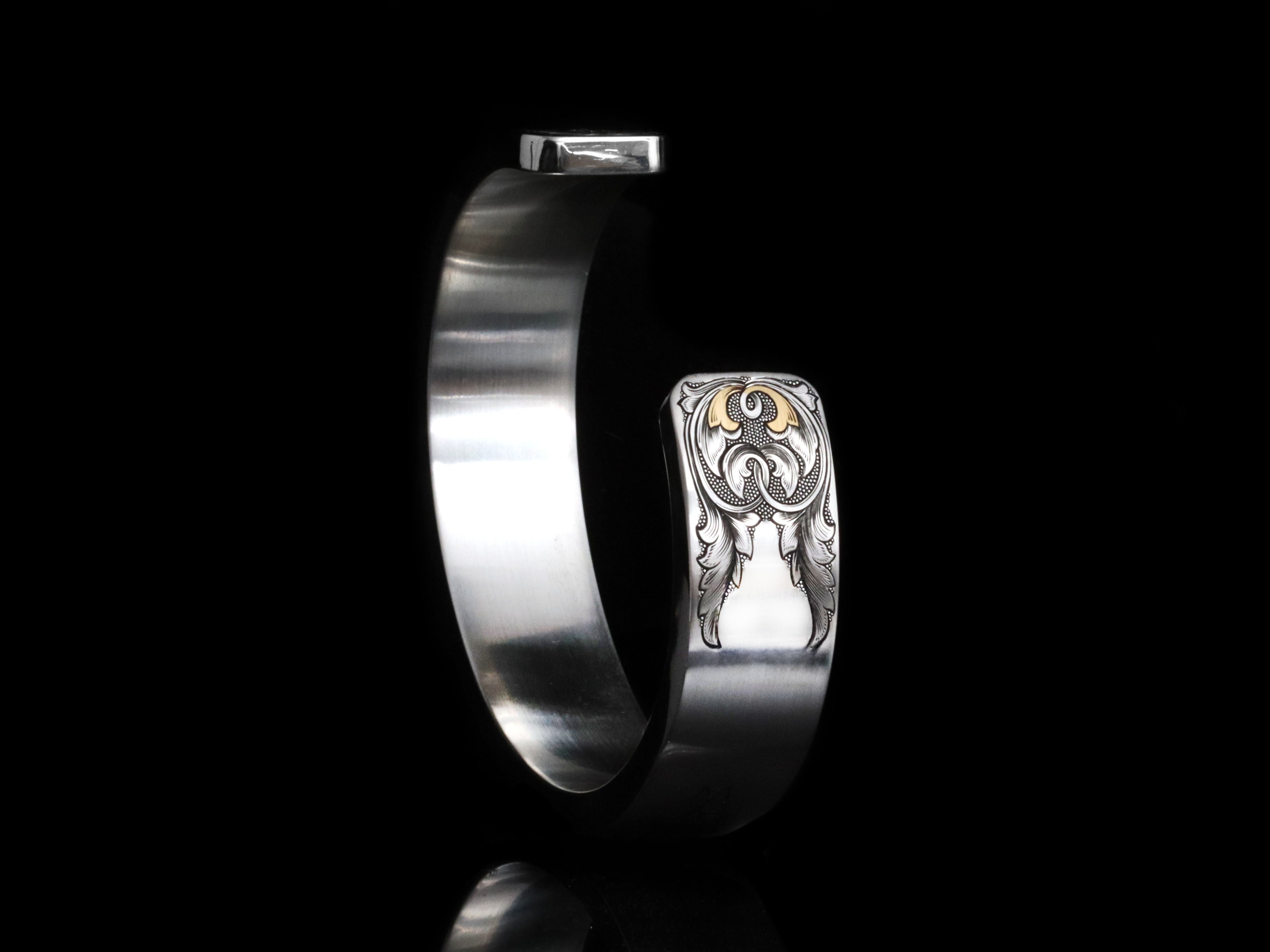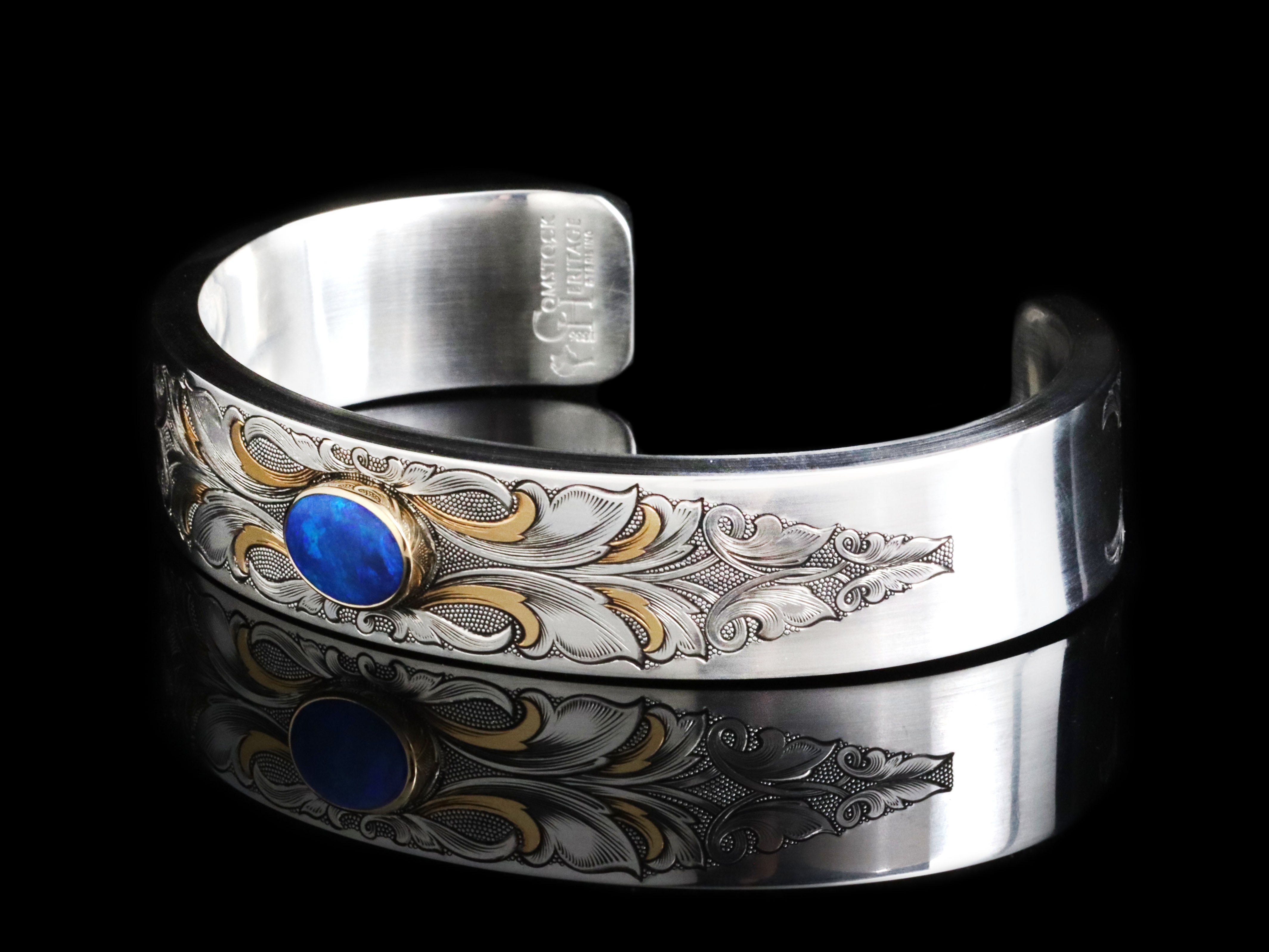 The W. Sammut Cuff, Blue Opal by Comstock Heritage is part of an exciting new line in collaboration with W. Sammut Designs. This Sterling silver bracelet features a beautifully flowing engraved pattern, executed with precision and artistry. Within the intricate engraving with hand inlaid 24k yellow gold, all surrounding an Australian Blue Opal. Slightly adjustable for a comfortable fit.