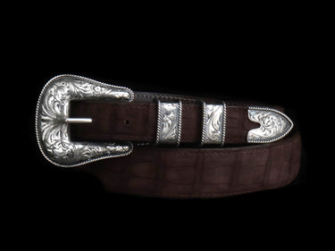 The Jachens Rope by Comstock Heritage is a 1" classic-shaped, Sterling silver four-piece buckle set with a traditional Western look. The main buckle features hand engraving, with coordinating patterns on the keeper and tip. The whole set is then framed by a hand wrought, solid Sterling silver rope edge. An antiqued finish gives the set added contrast and vintage character.