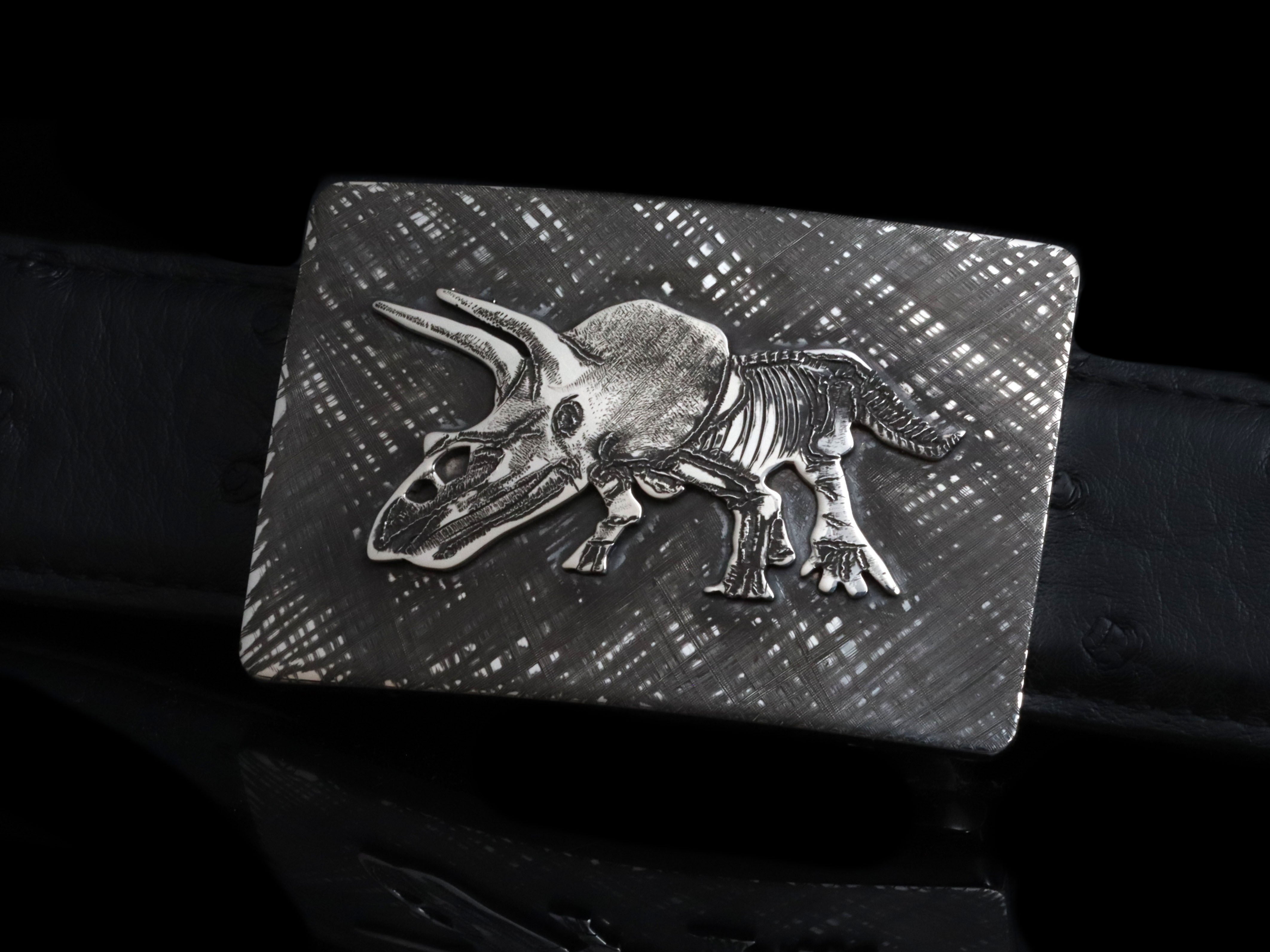 Created for a dear friend, the Mason Florentine Triceratops by Comstock Heritage is a Sterling silver Mason-shaped buckle with gently rounded corners, combining structured detail with incredible detail. At the center is a hand cut, Sterling silver triceratops based off the "Big John" fossil discovered in South Dakota's Hell Creek geological formation in 2014. Surrounding the dinosaur, Florentine hand engraving adds intricacy and visual interest, while an antiqued dark finish gives the buckle a classic, weathered appearance.