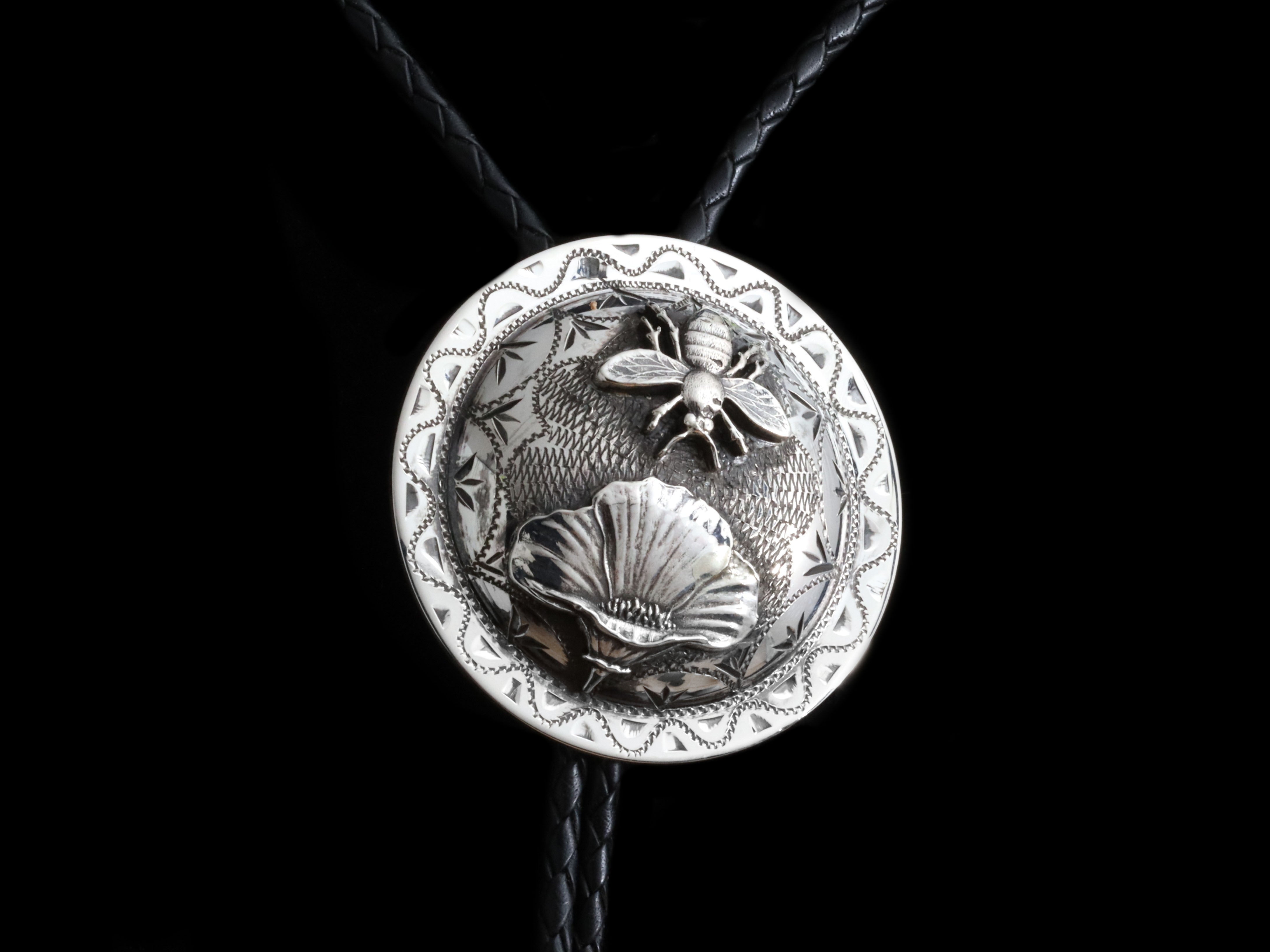 The Poppy & Bee Bolo by Comstock Heritage is a finely crafted solid sterling silver piece featuring a detailed field scene. In this version, we have added a pair of cognac diamonds to the eyes. Designed for both durability and style, it includes a full back and a secure bolo finding, making it easy to pair with cords or strings of your choice. A classic design that highlights expert craftsmanship, this bolo is a classic addition to any collection.