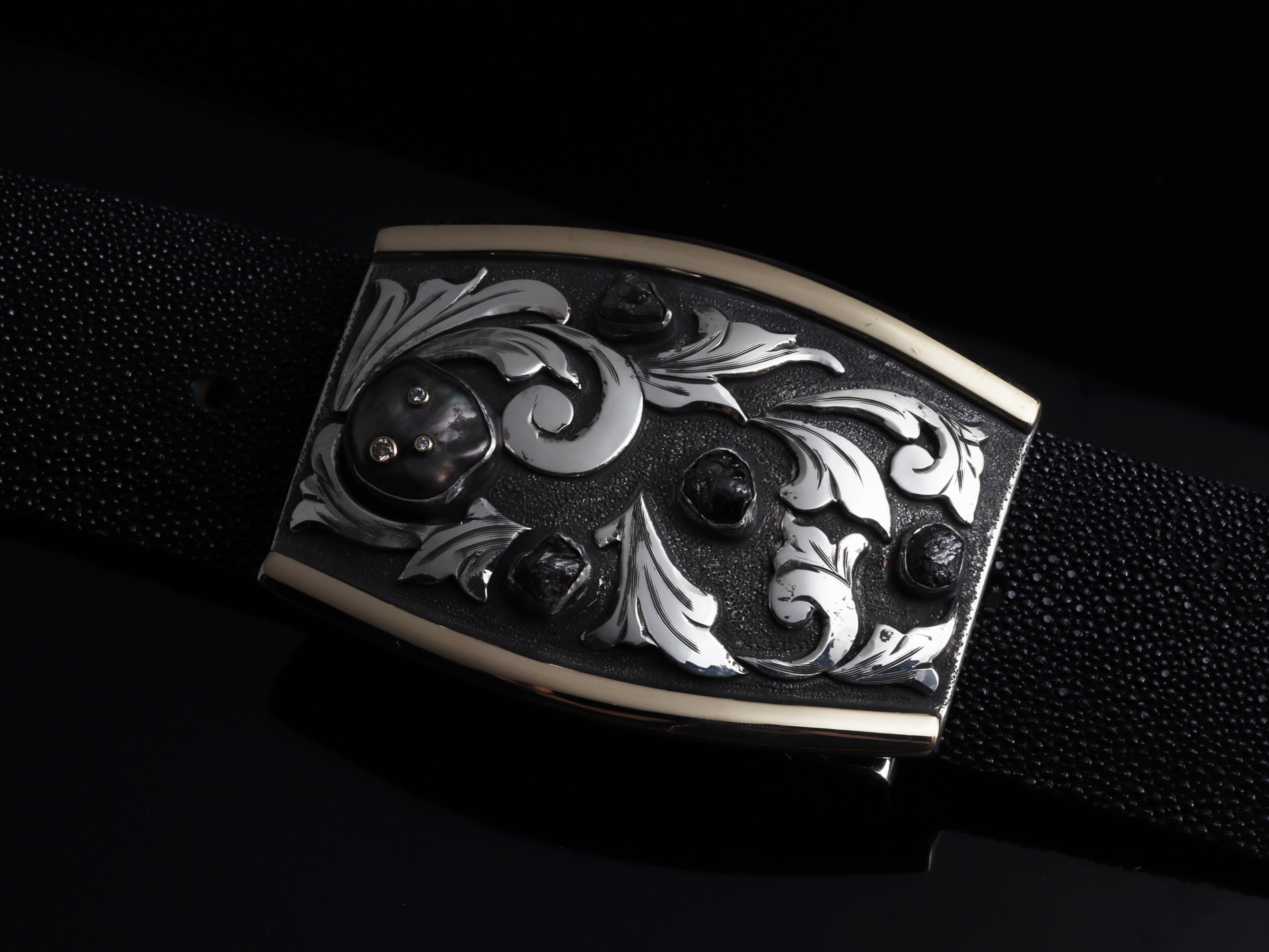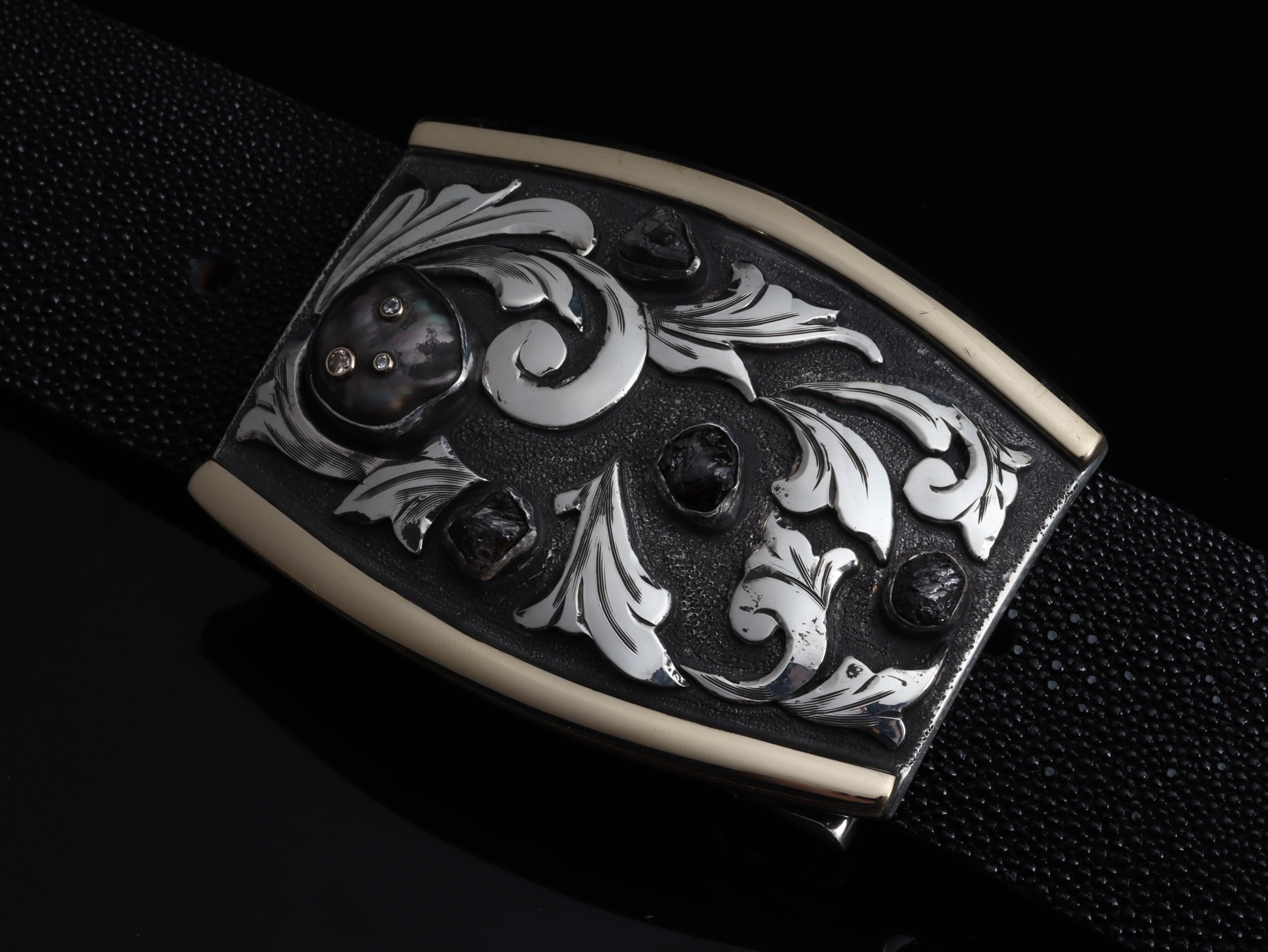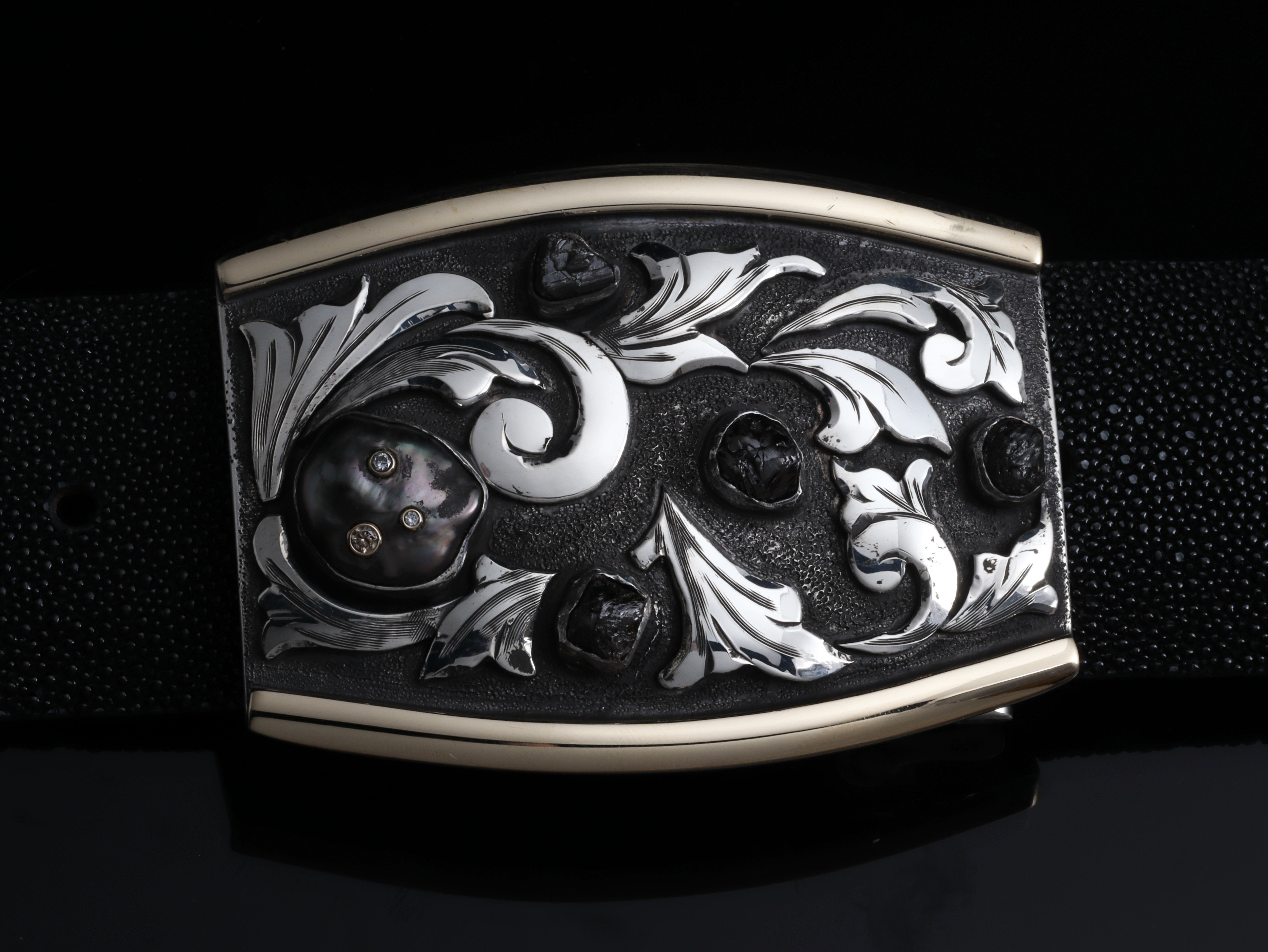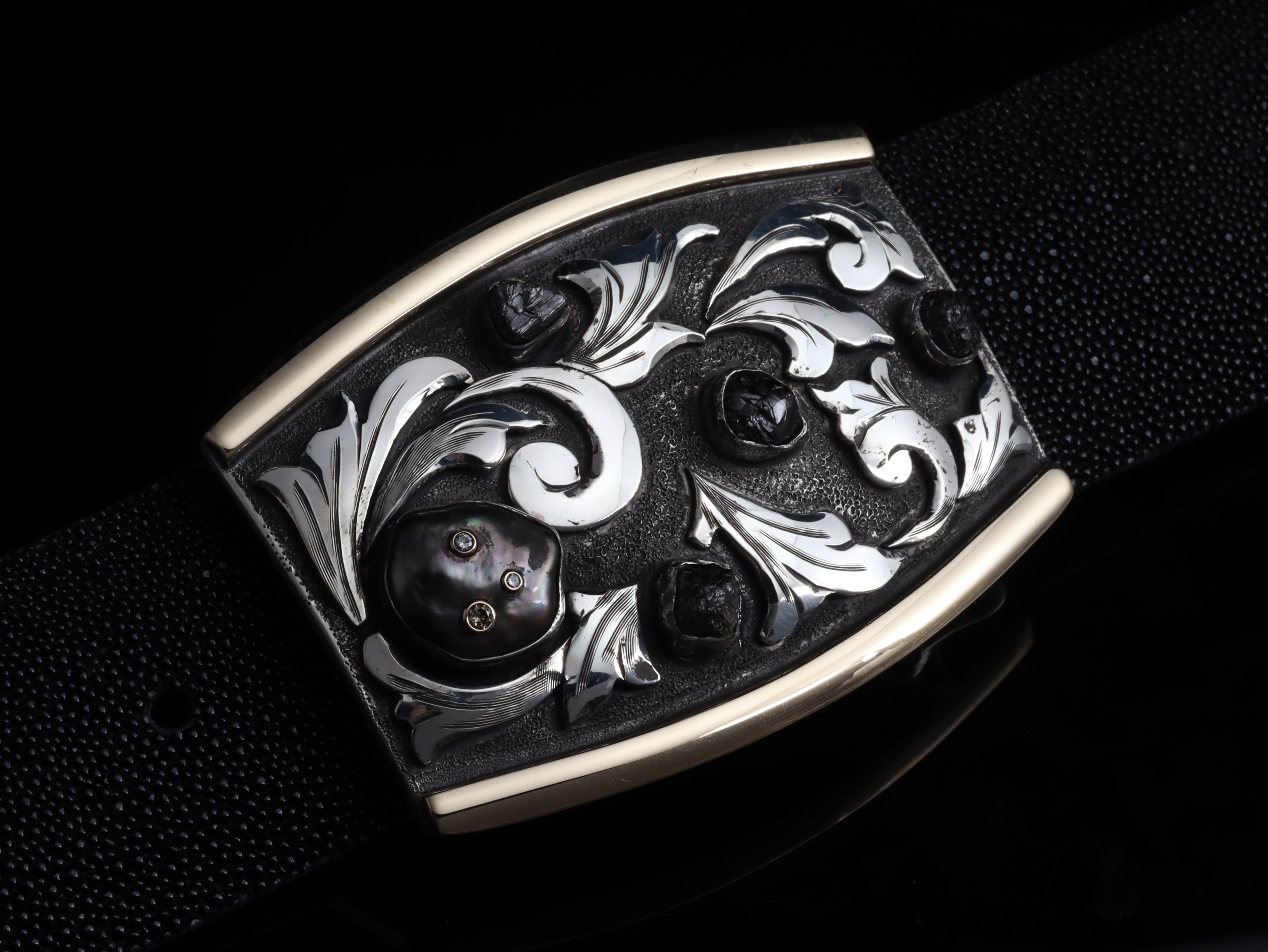 The Preston Black Pearl by Comstock Heritage is a Sterling silver "Preston" style dress buckle with plenty of flash and diamonds. A Sterling silver base holds matching Sterling hand cut overlays, 4 raw black diamonds, and a black pearl with 3 small diamonds inside. This piece is framed on the top and bottom by two pieces of 14k gold wire.