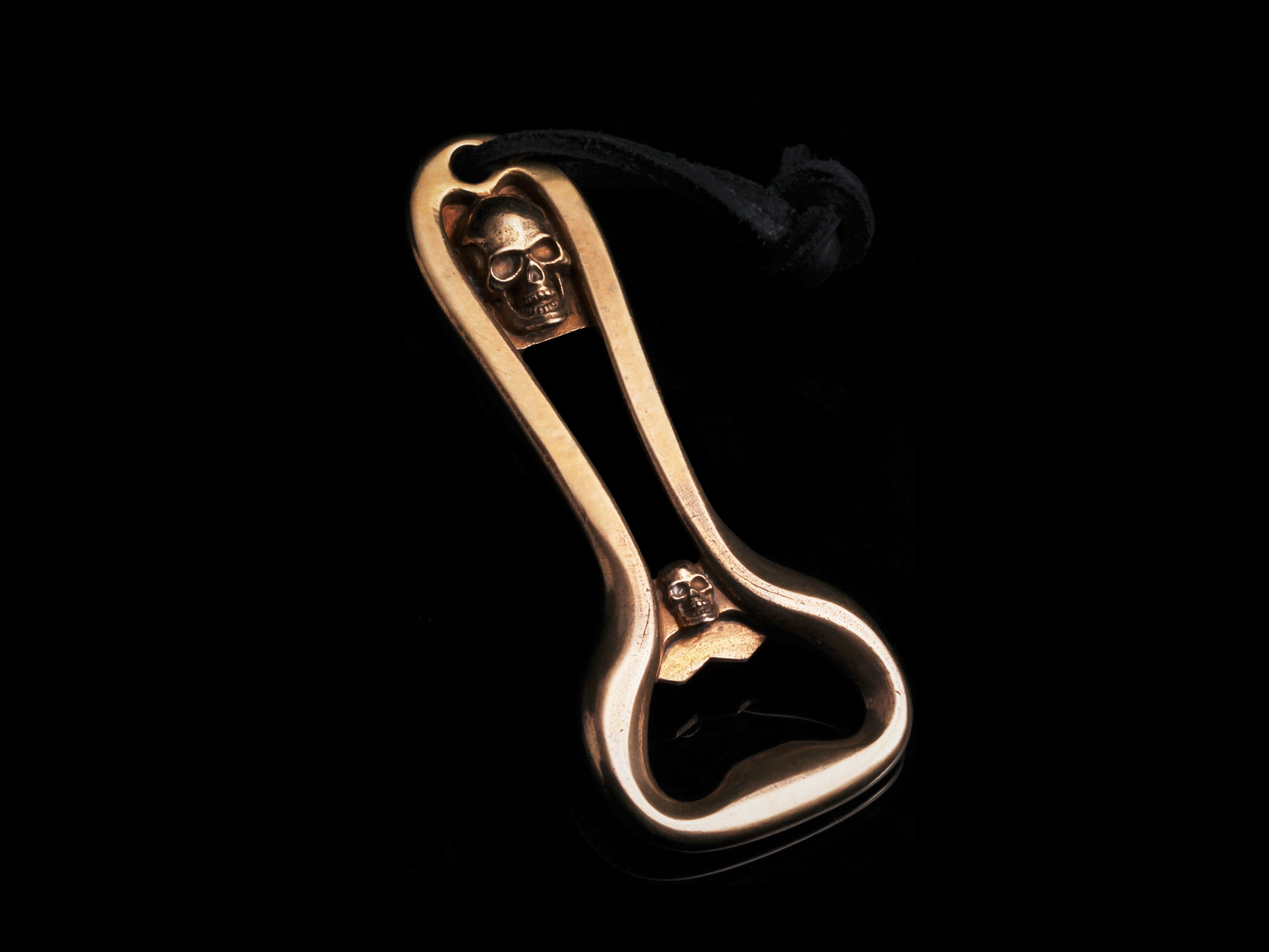 The Double Skull Bottle Opener by Jeff Deegan Designs is a hand cast bronze bottle opener with a leather cord. This skull bottle opener can be used with either hand as you open your bottle in style. Our handmade bronze skull bottle opener makes a great gift, even if it's just to yourself.