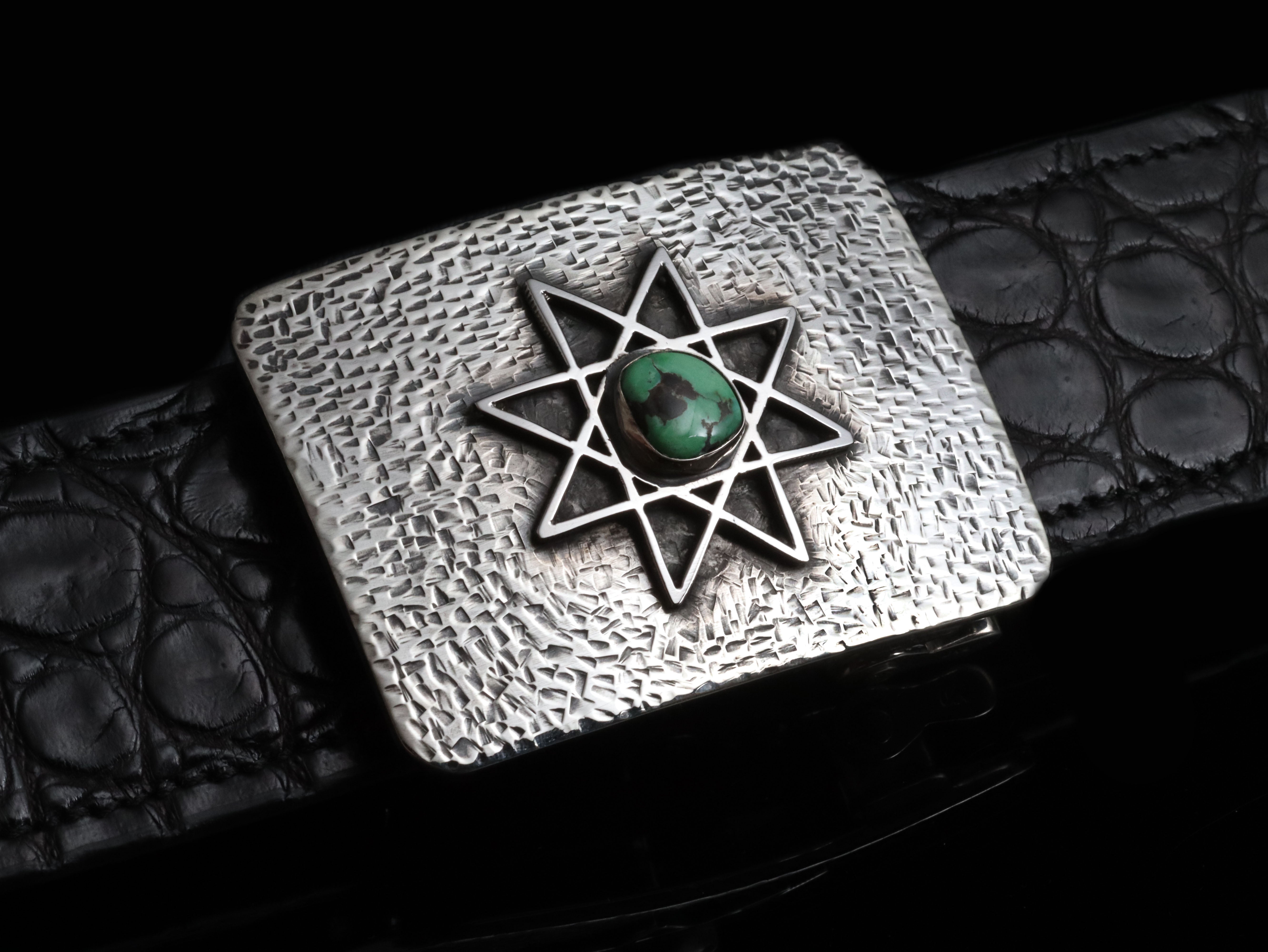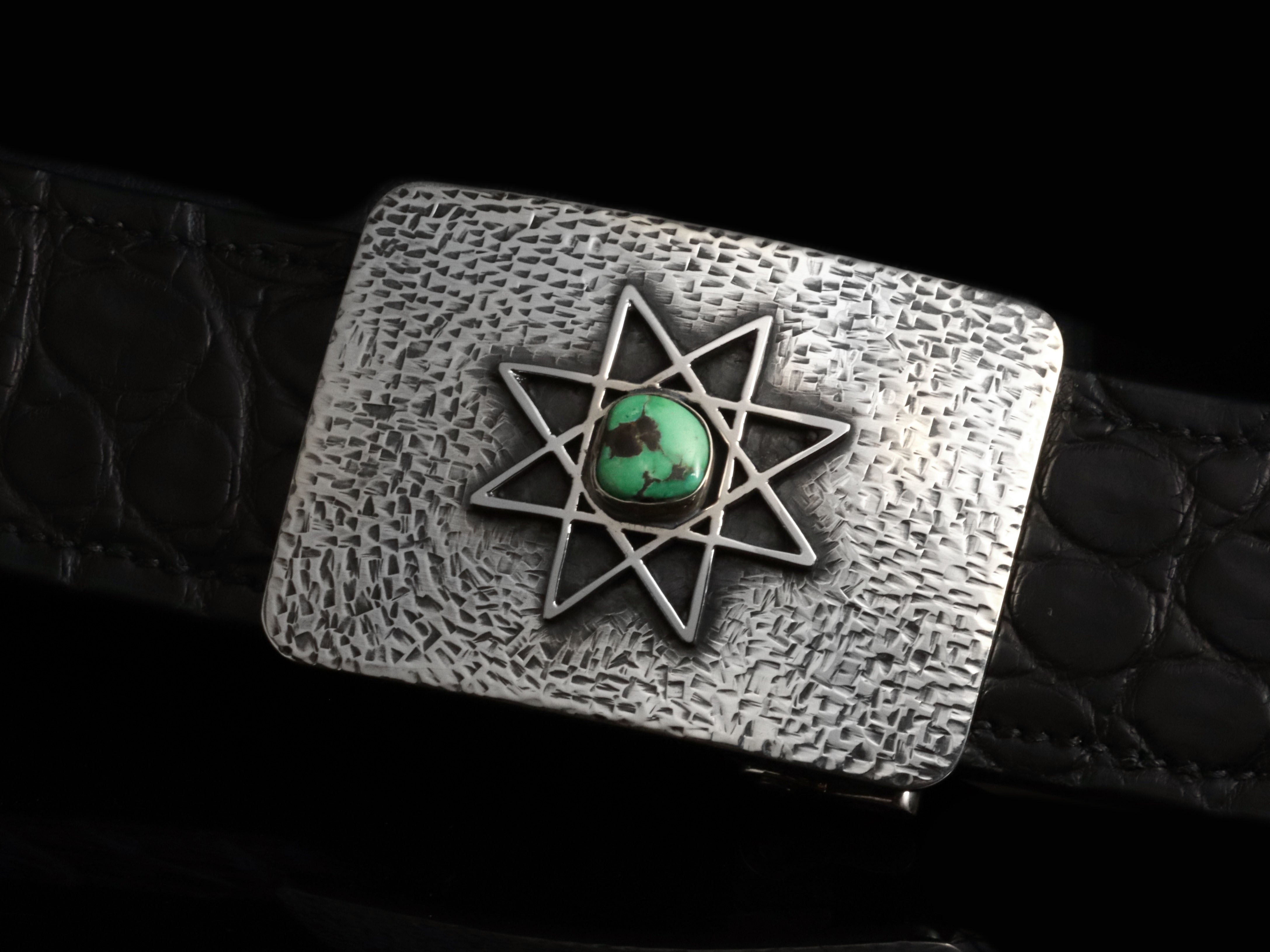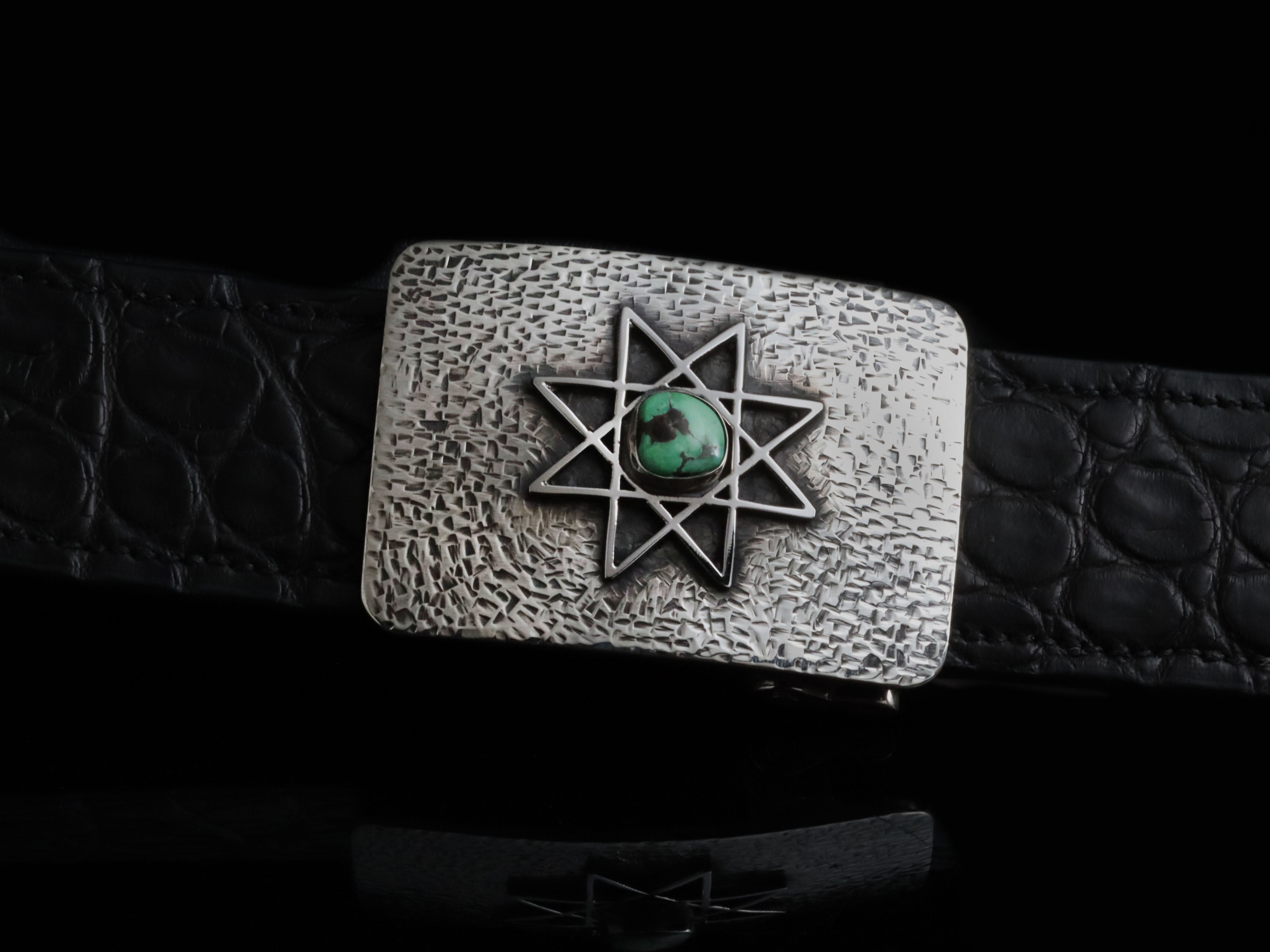 The Mesa Creation by Comstock Heritage is a thicker gauge Sterling silver "Mason" shape belt buckle with rounded corners that is hand made specifically for 1 ½" belt straps. This buckle then features "Kyle" style divot engraving, surrounding a hand sawn and formed Platinum creation symbol in the center. Color is added with a piece of green Carico Lake Turquoise.