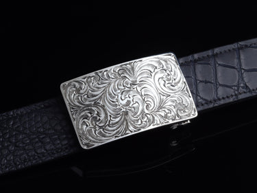 One of our most popular buckles, this understated piece by Comstock Heritage is perfect for those just starting their buckle collections, or for more formal occasions. It’s made from heavy-gauge, hand-engraved Sterling silver, and its rectangular face is adorned with beautiful, delicate scrollwork. This buckle can be paired easily blue jeans or be worn with dressier slacks.