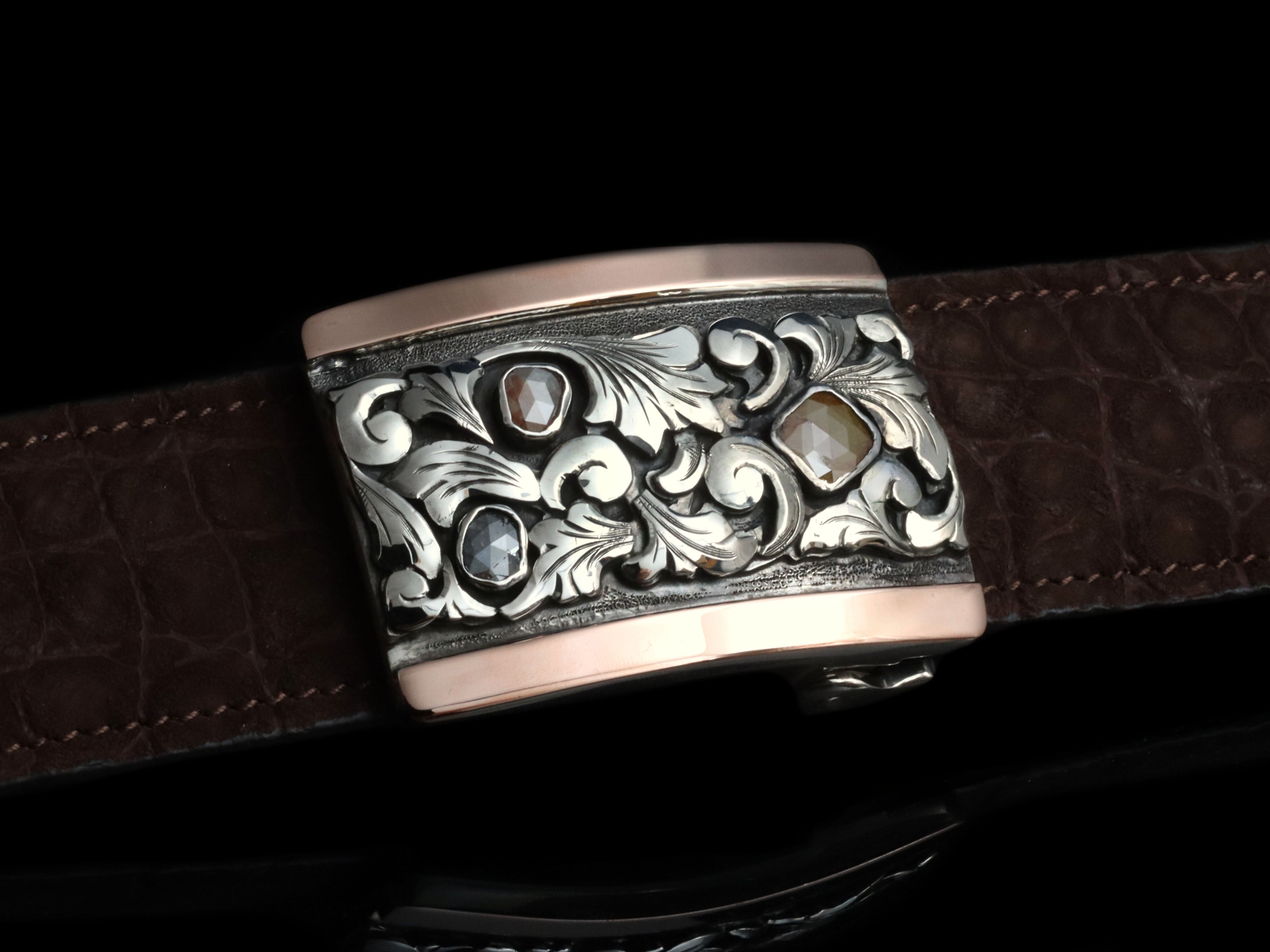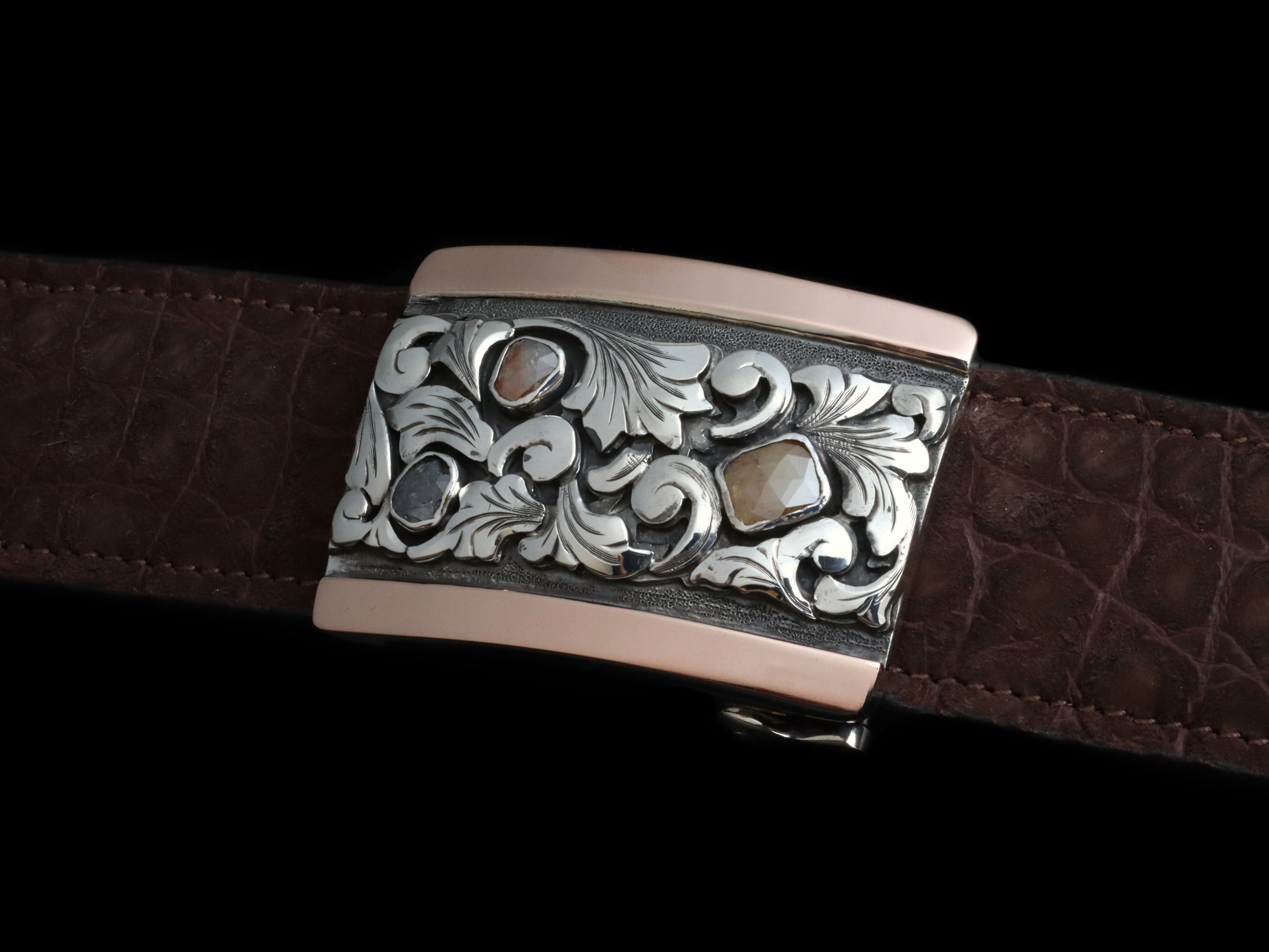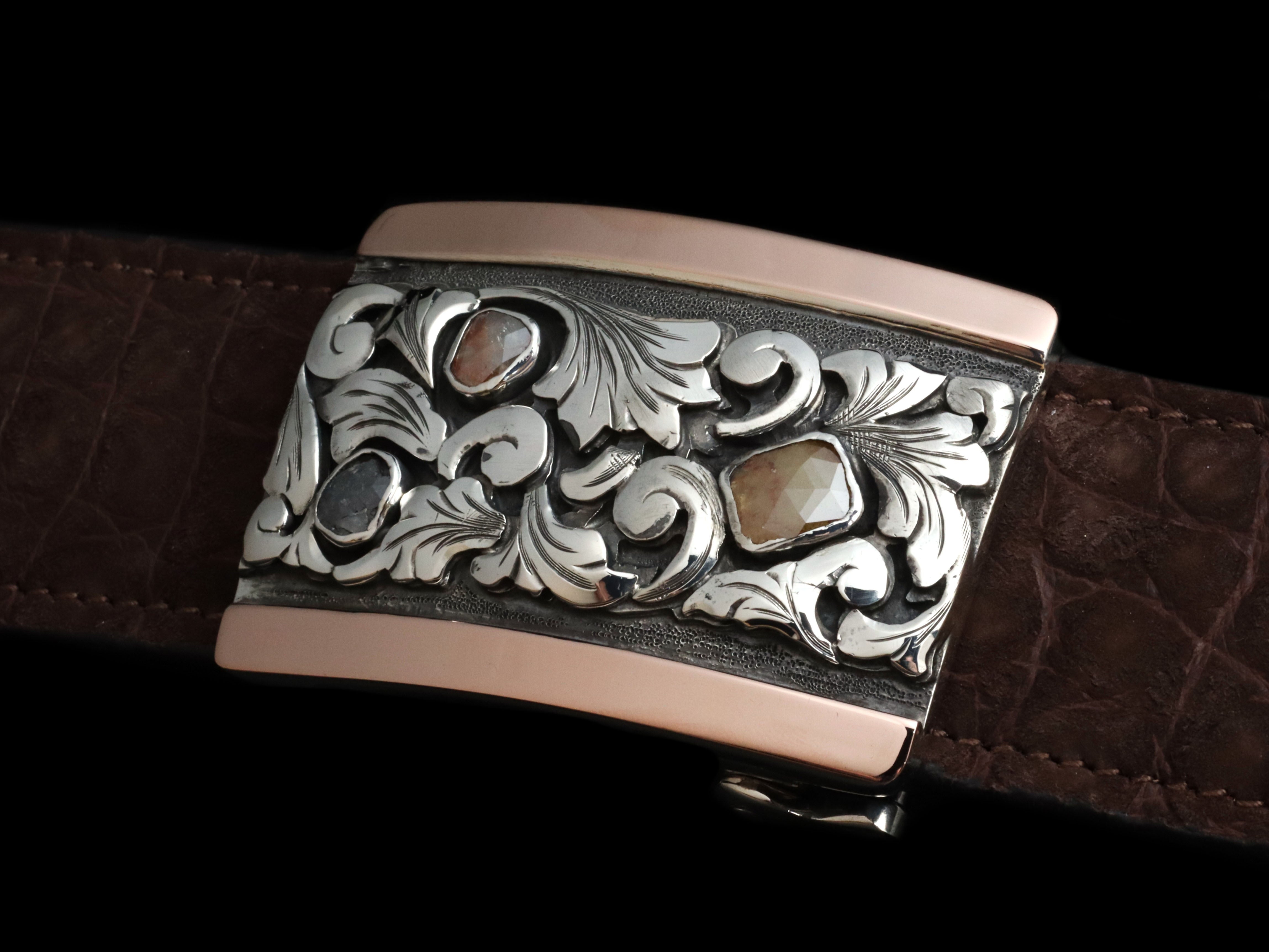 The Mason Quarry by Comstock Heritage is a heavy gauge Sterling silver rectangular belt buckle of substantial weight and full of gold. The center of this piece has hand cut Sterling silver overlays, painstakingly placed around rose cut raw diamond slices. 14k rose gold top and bottom bars act as frames, flanking the silver and diamonds.
