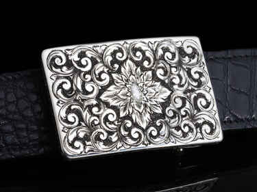 The Mason Shaw, Marquis Diamond by Comstock Heritage features a rectangular Mason-style buckle with deep, hand-carved gun engraving that moves organically across the silver. At the center sits a ½ ct marquis-cut white diamond, its clean, cool sparkle standing out against the lightly antiqued finish. The contrast between the stone and the engraved silver gives the buckle a quiet intensity and a sense of depth that feels both classic and modern.