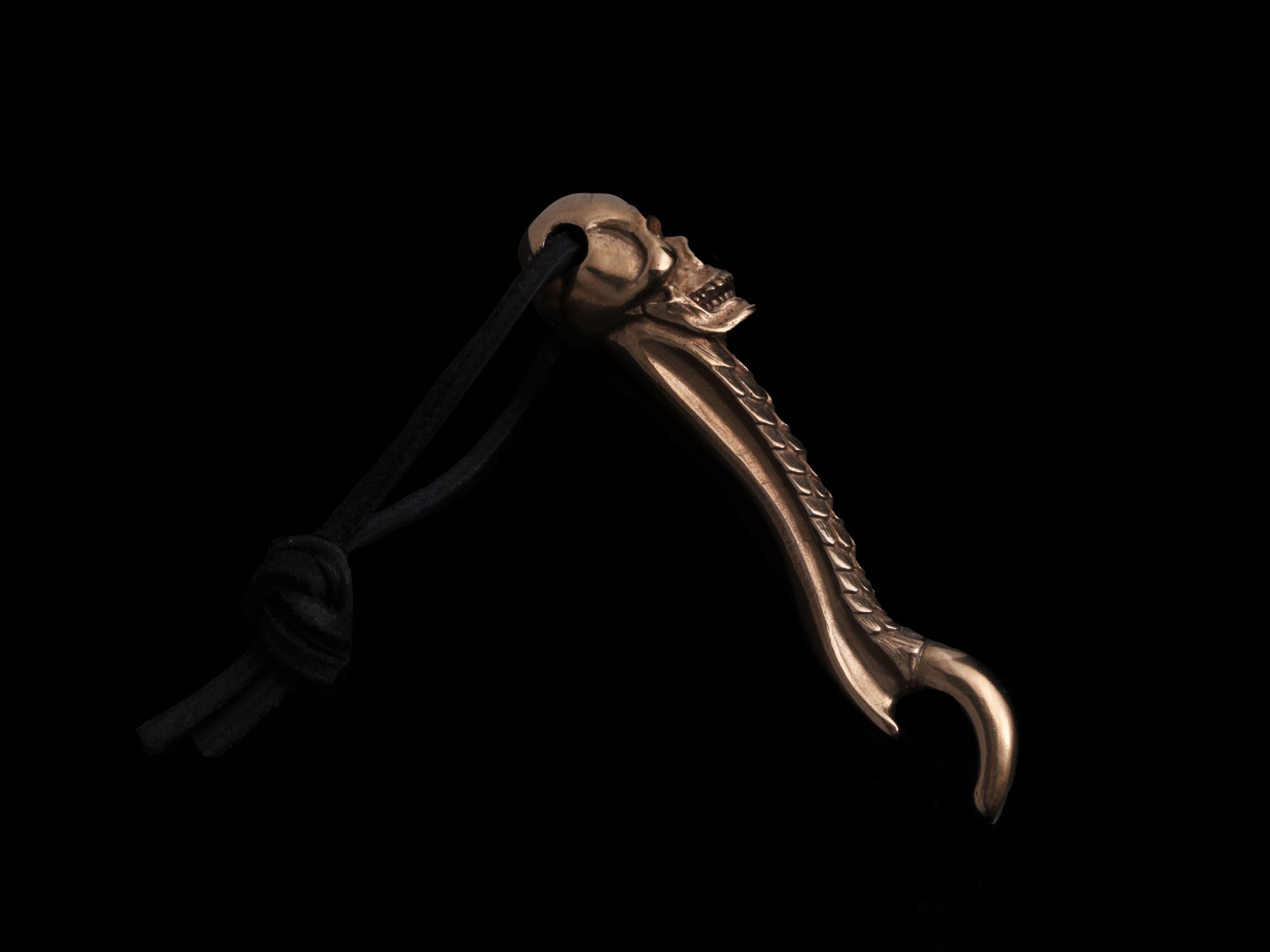 The Skull & Hook Bottle Opener by Jeff Deegan Designs is a hand cast bronze bottle opener with a leather cord. This bottle opener can be used with either hand as you open your bottle in style. The Double Skulls make a great gift, even if it's just to yourself.