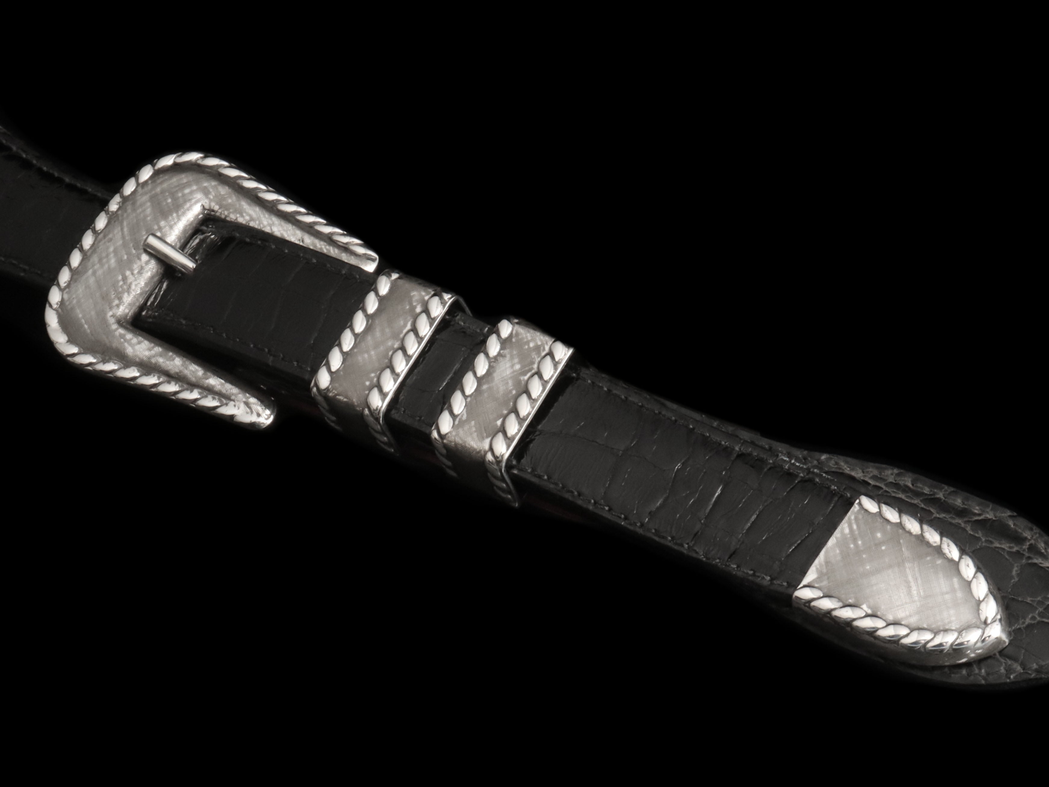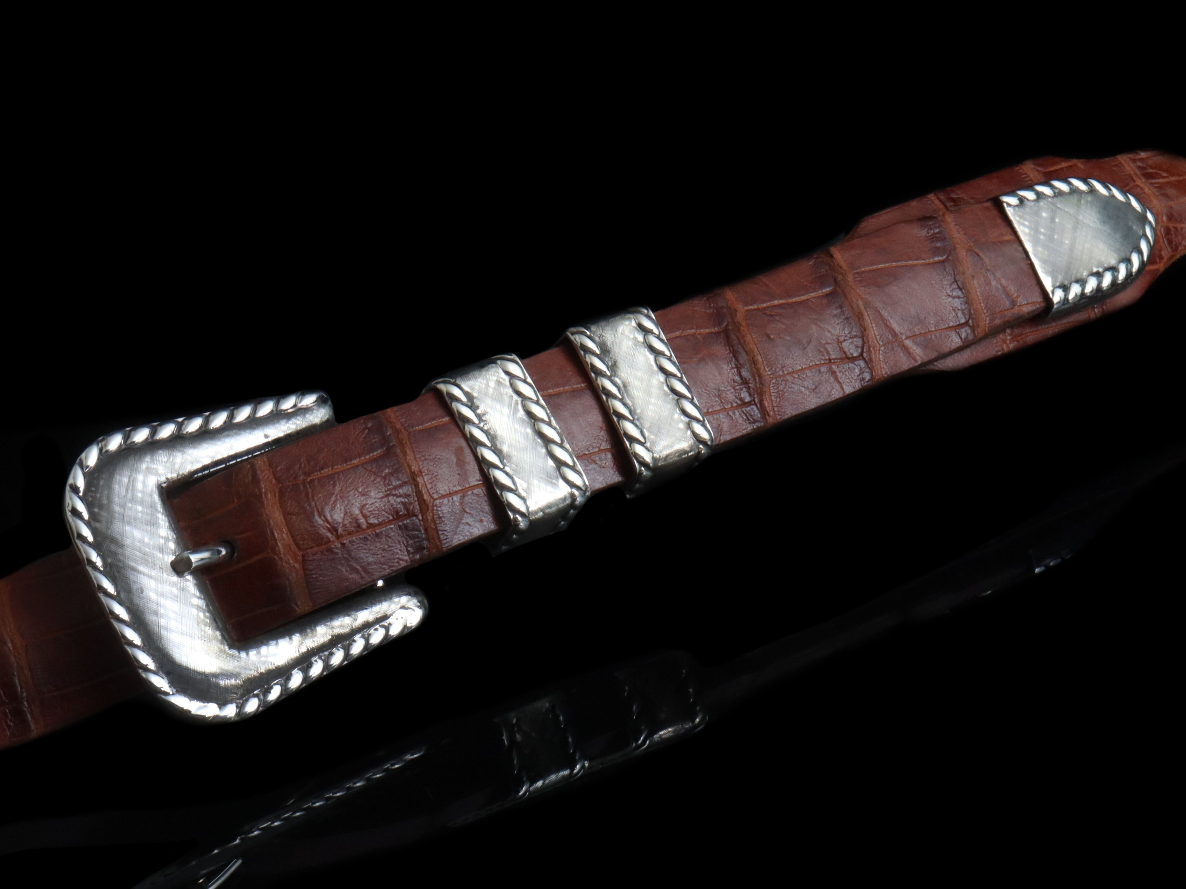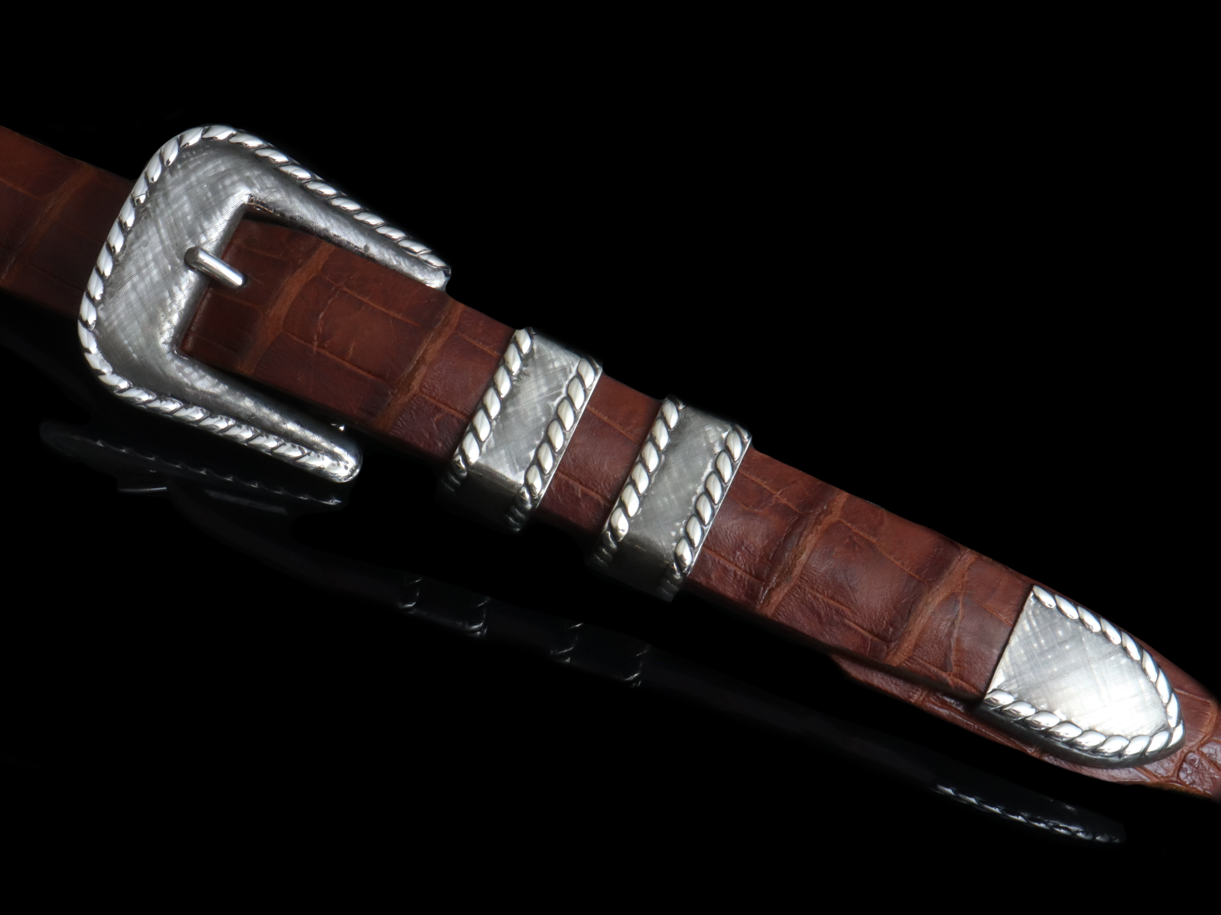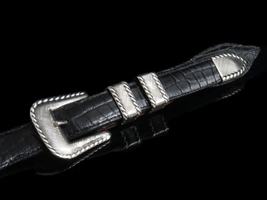 The Noah Florentine by Comstock Heritage is a 1" classic shaped Sterling silver 4 piece buckle set featuring a hand stamped Sterling silver rope that frames detailed Florentine style hand engraving. It is then all antiqued for a darker finish.