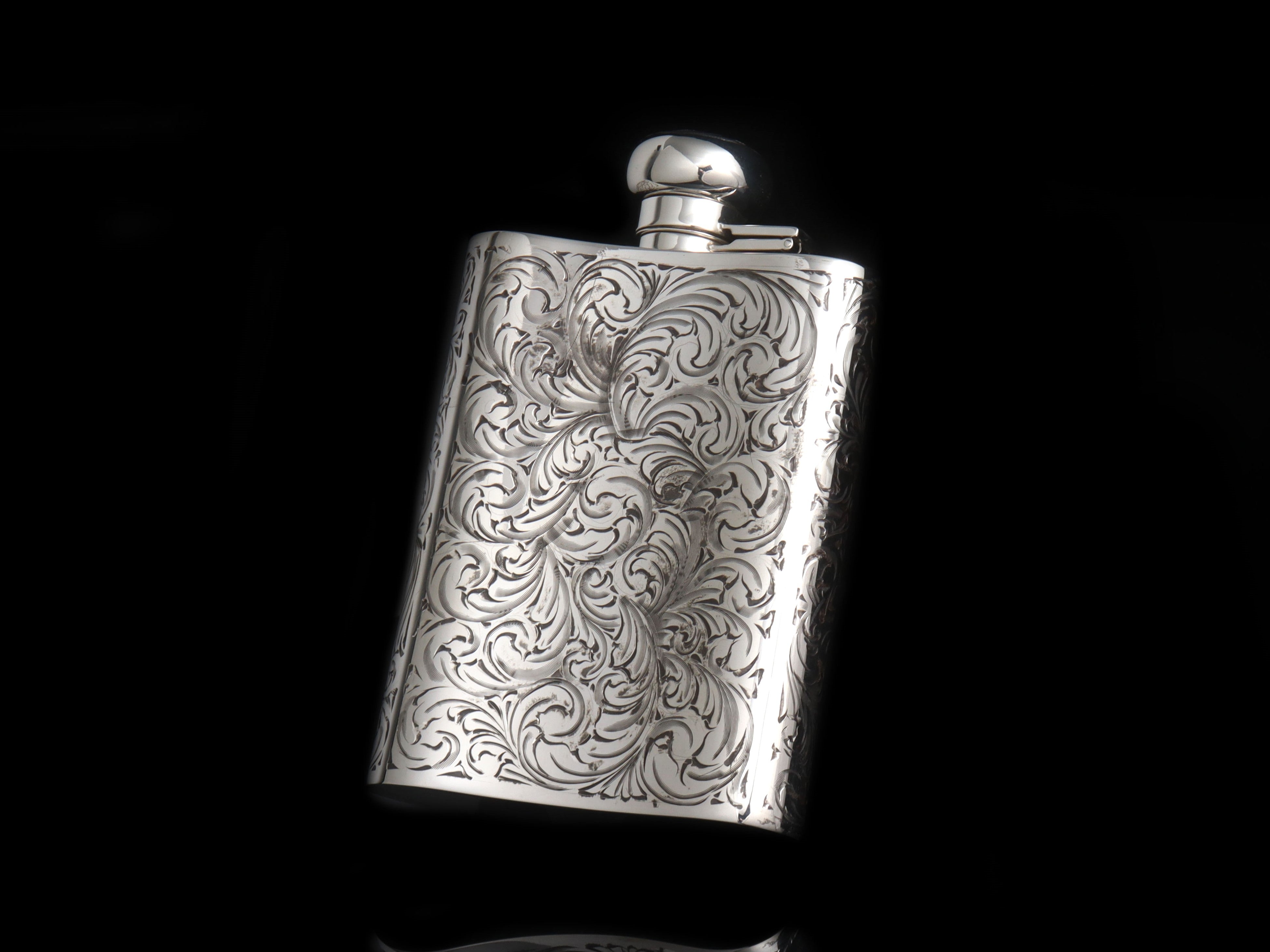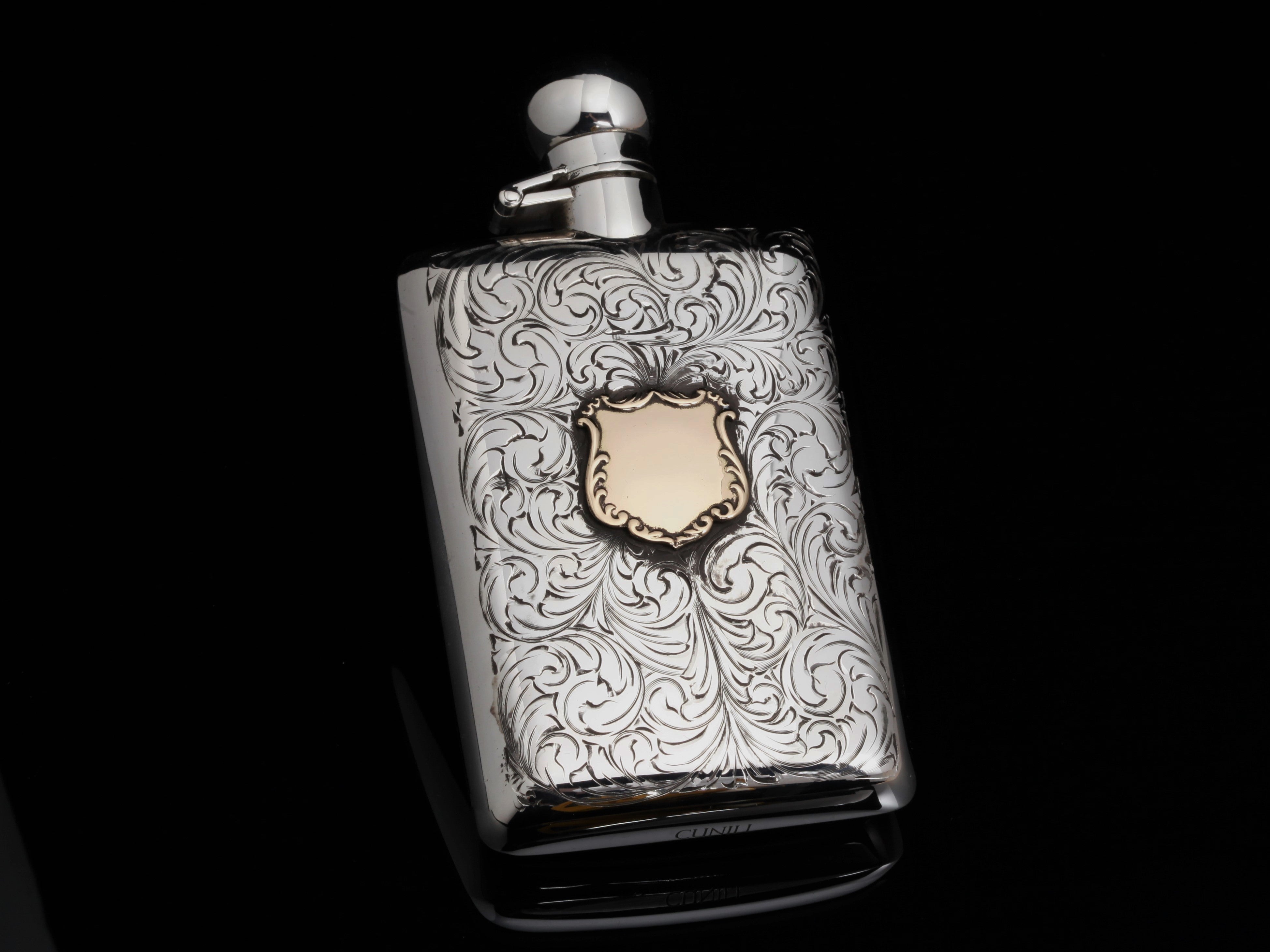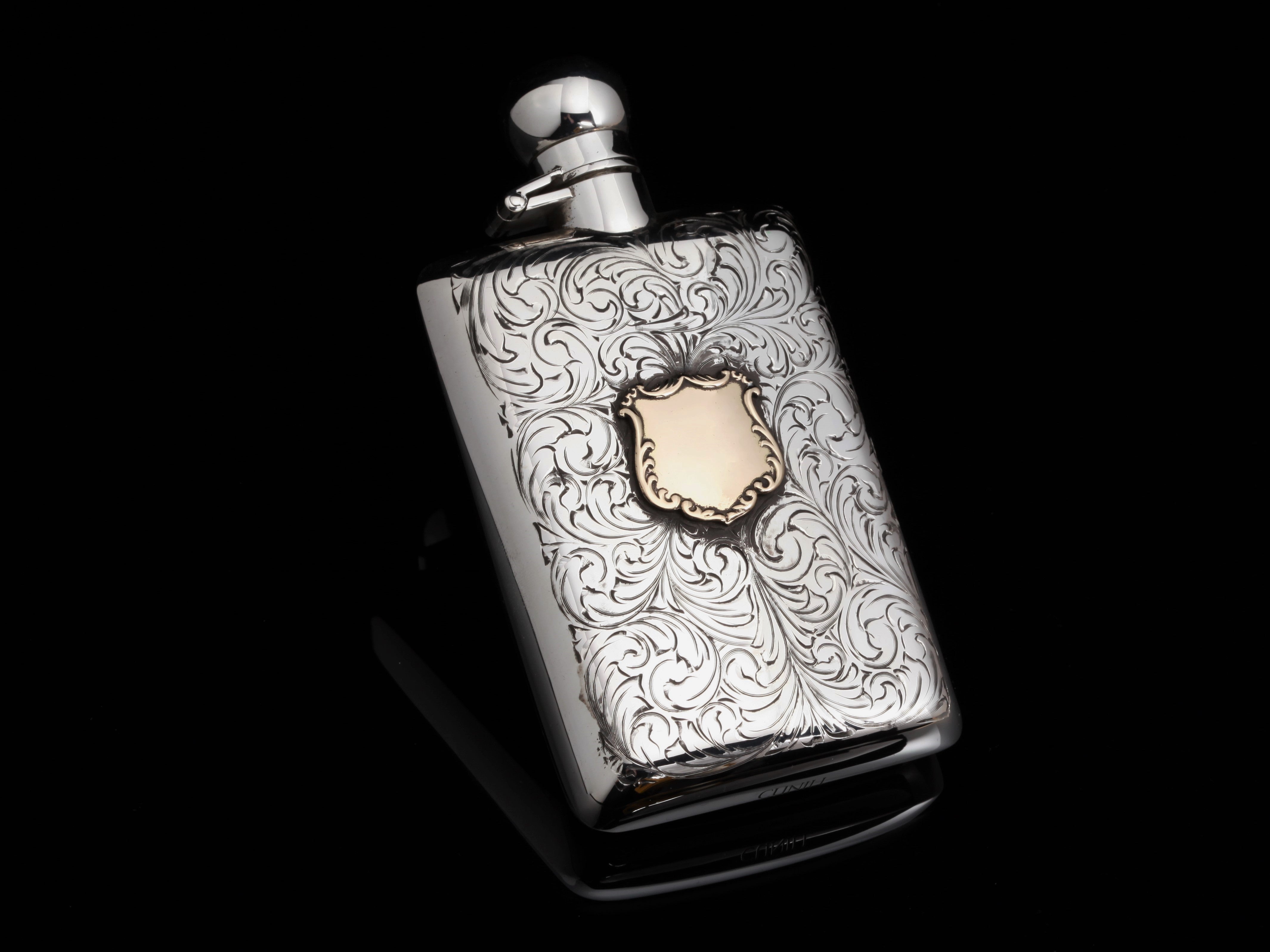 At approximately 4" tall, this 4oz hand made sterling silver flask is large enough to "get you through" even the most dull events or for slipping into your pocket whilst enjoying the outdoors. Handmade, the flask has a captive top which ensures the lid will never be lost, is meticulously engraved and given a 14k rose gold shield before it is antiqued to produce this distinguished finish. For maintenance purposes, any liquid should be emptied after use and the inside should be washed with hot soapy water.