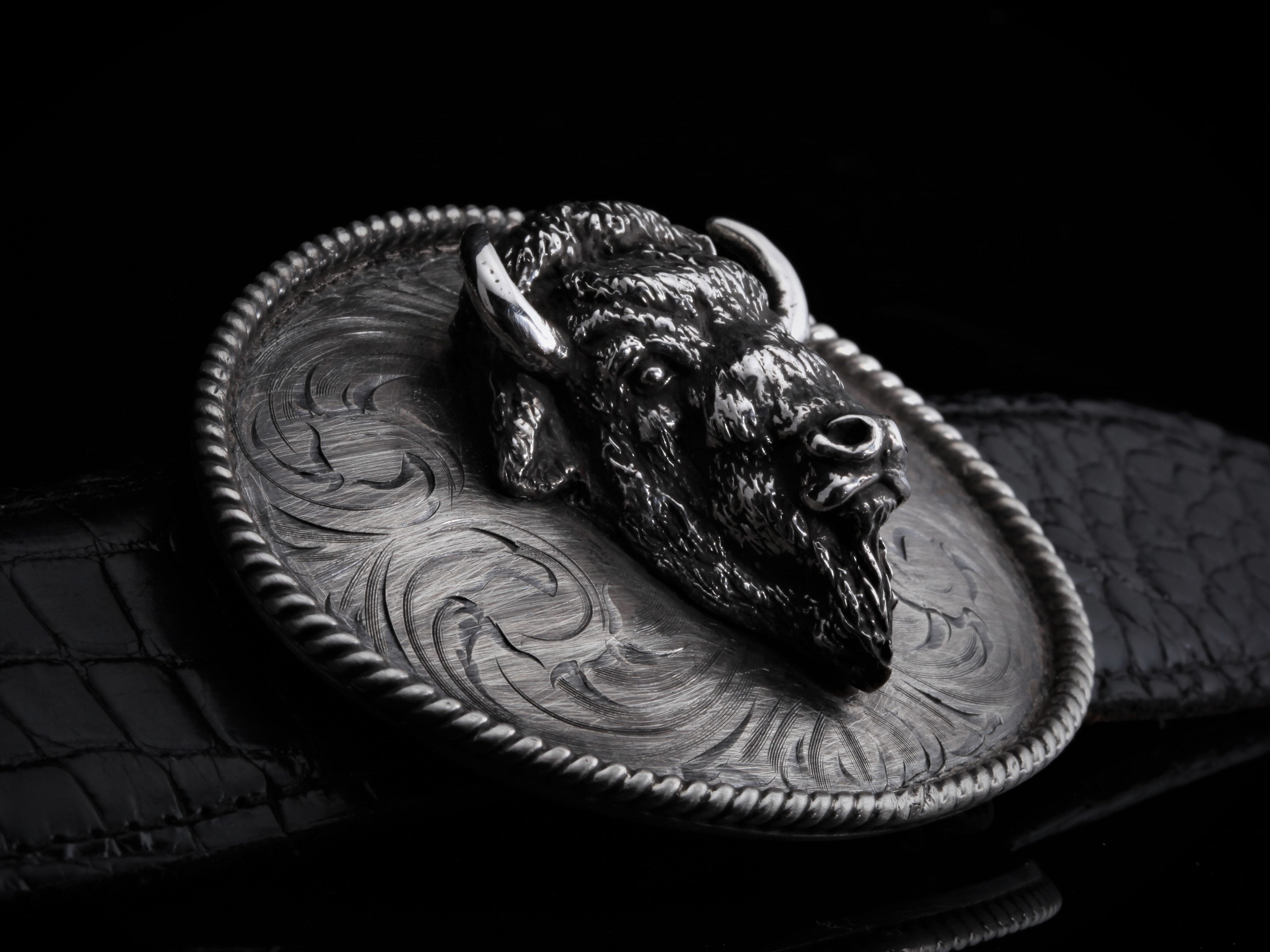 The ASR50 Buffalo by Comstock Heritage is a heavy gauge Sterling silver oval buckle featuring hand engraving and a roped edge surrounding a large Sterling silver hand cast buffalo figure. This buckle is then antiqued for a unique finish.