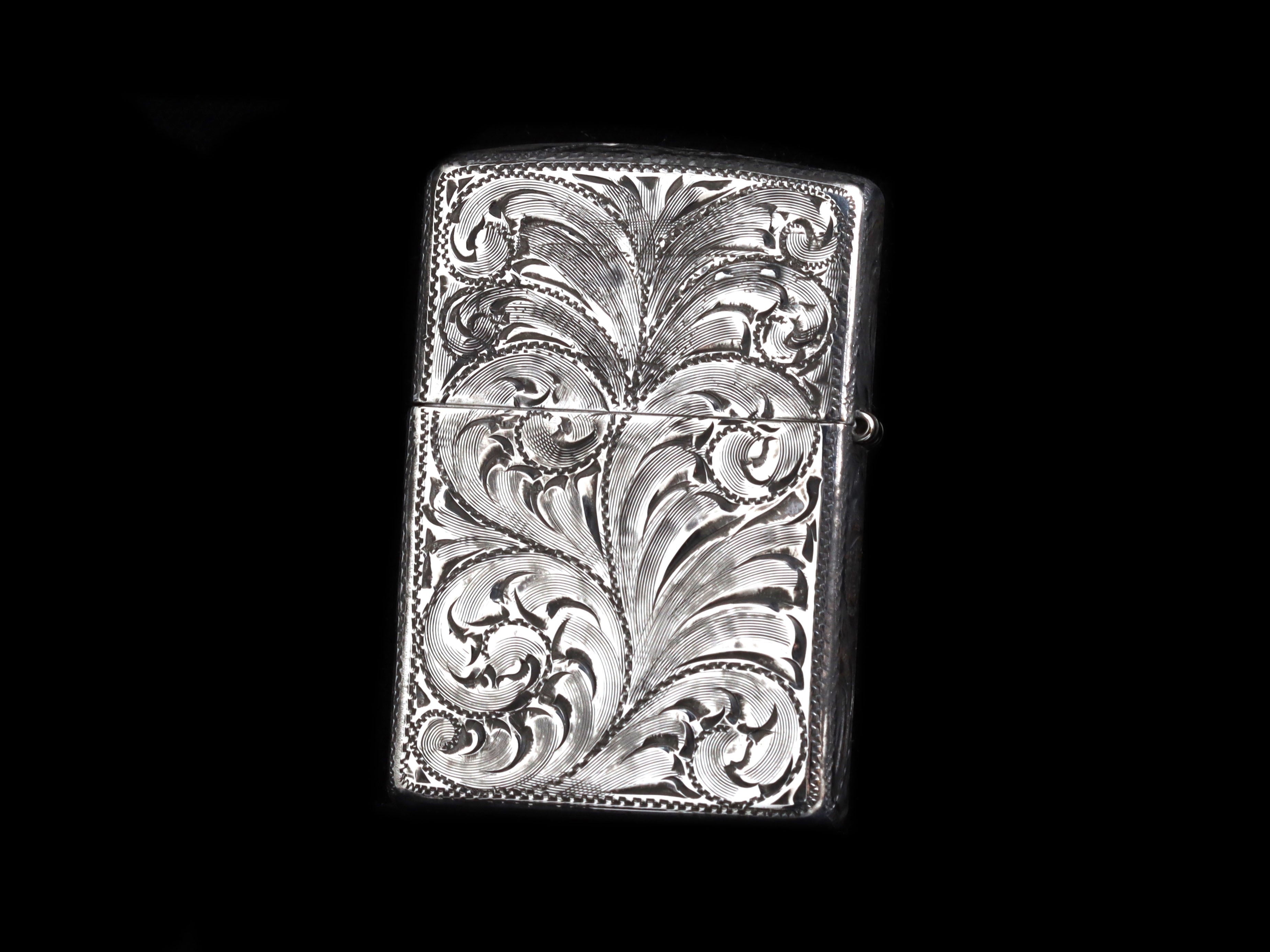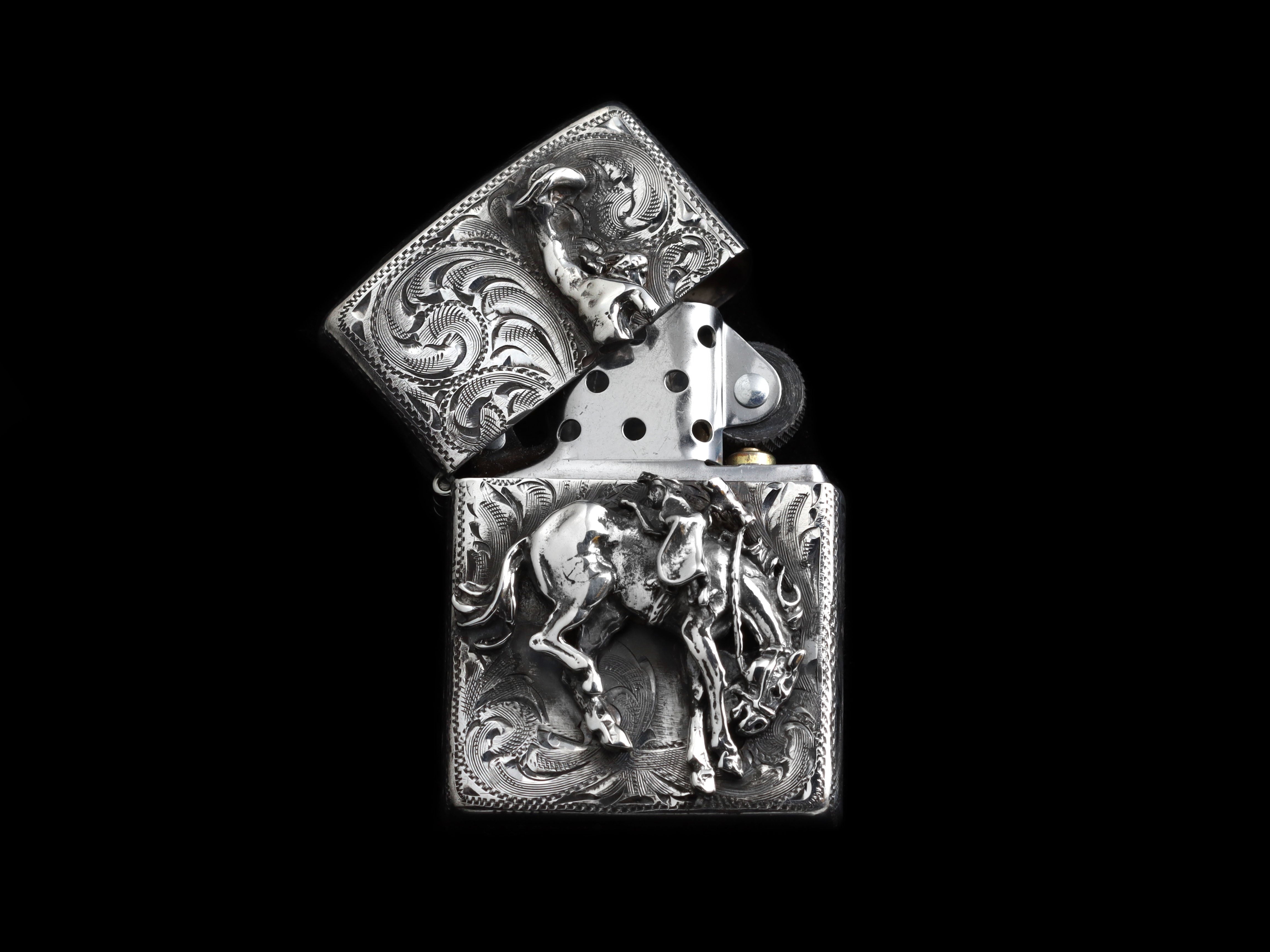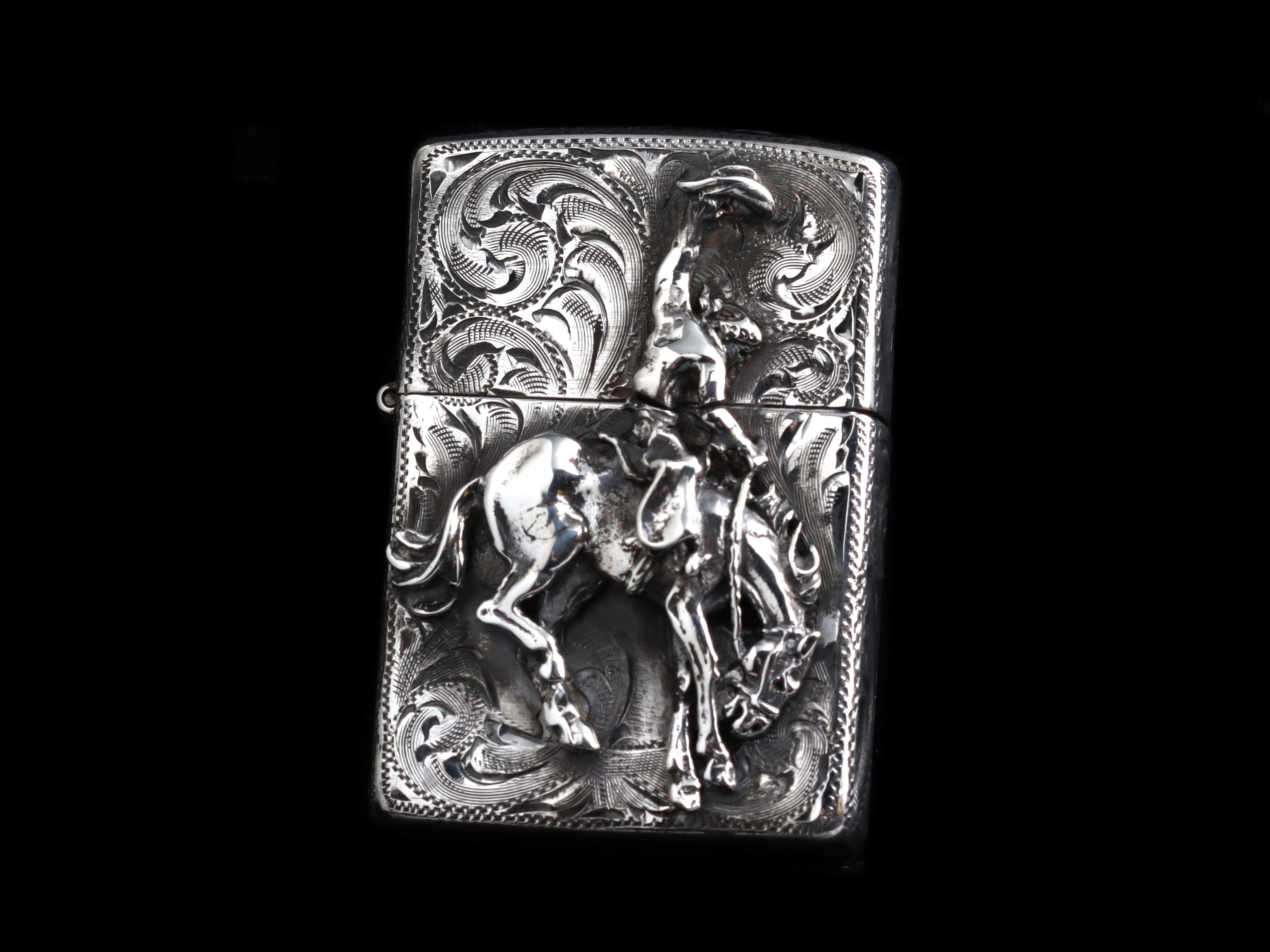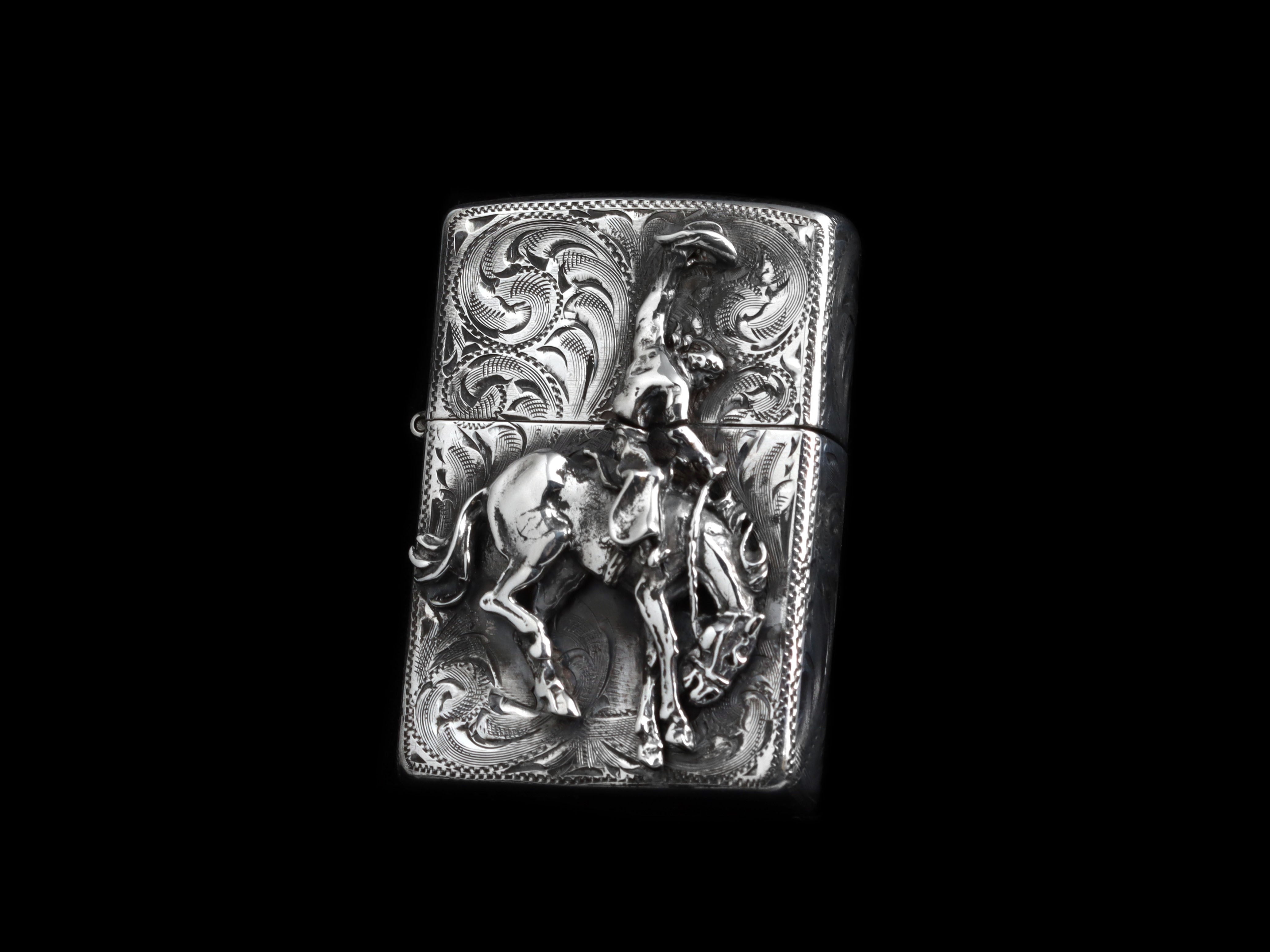 The Bronc Lighter by Comstock Heritage is a refillable Sterling silver lighter that captures the energy of a classic rodeo moment. A thick, hand-cast Sterling silver bronc and rider take center stage, complete with a flying hat mid-ride. The surrounding surface is finished with detailed hand-etched engraving, adding texture and movement to this compact, functional piece.