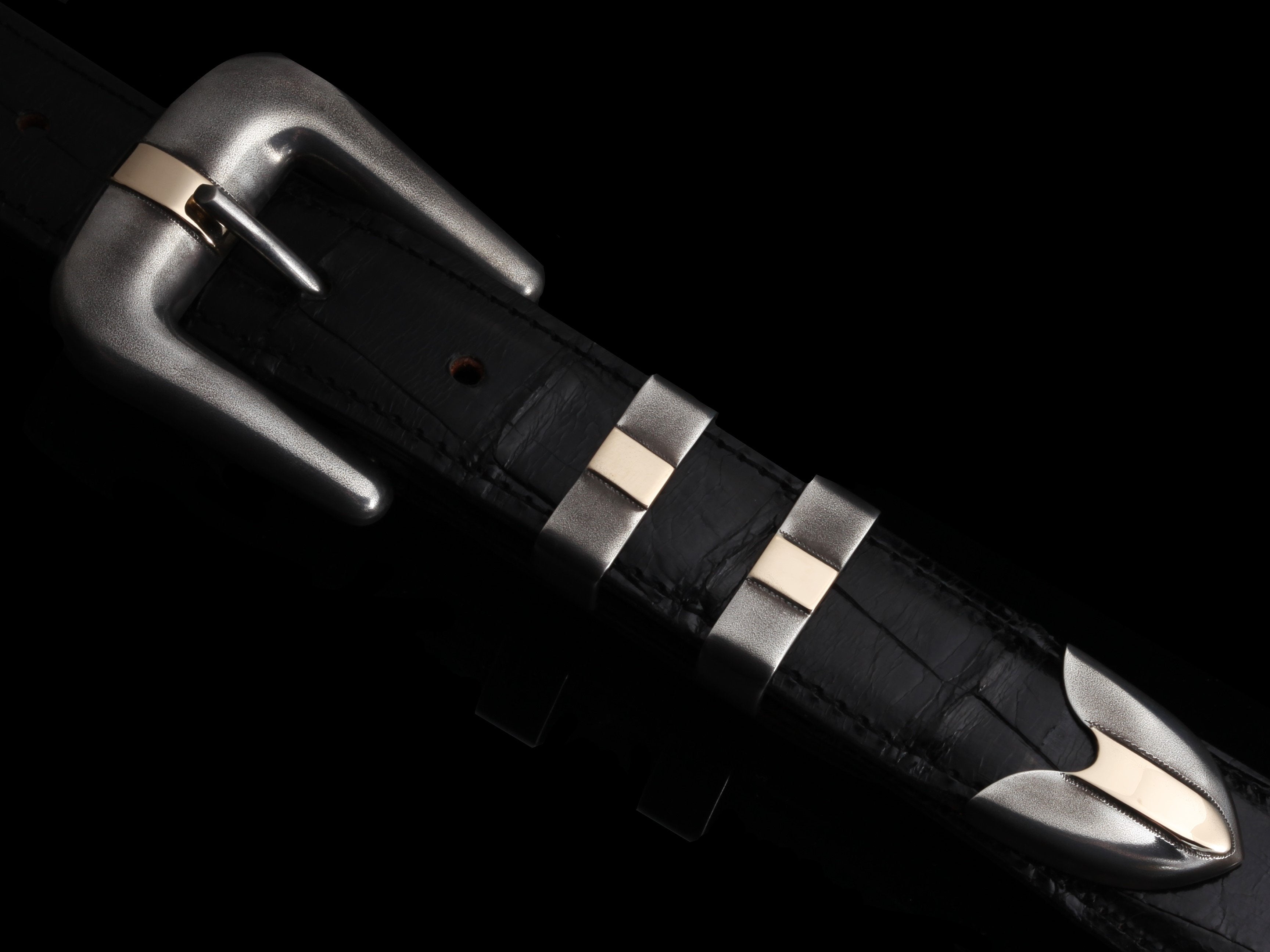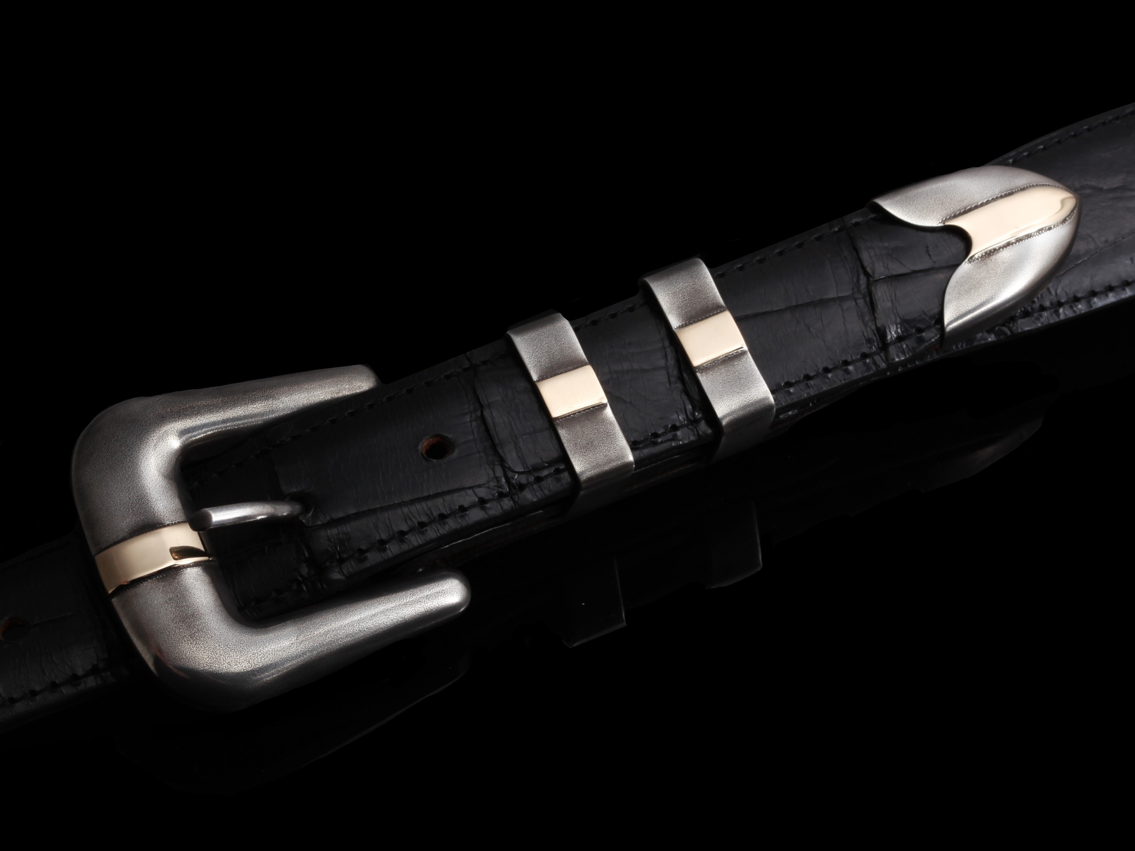 The JWT GBP by Comstock Heritage is a Sterling silver 1" hand crafted "JW" style 4 piece buckle set. This set features an antiqued finish and 4 pieces of 14k Rose or Yellow Gold overlay on each piece. The contrast between the gold and the dark silver make this set a fun take on a classic shape.
