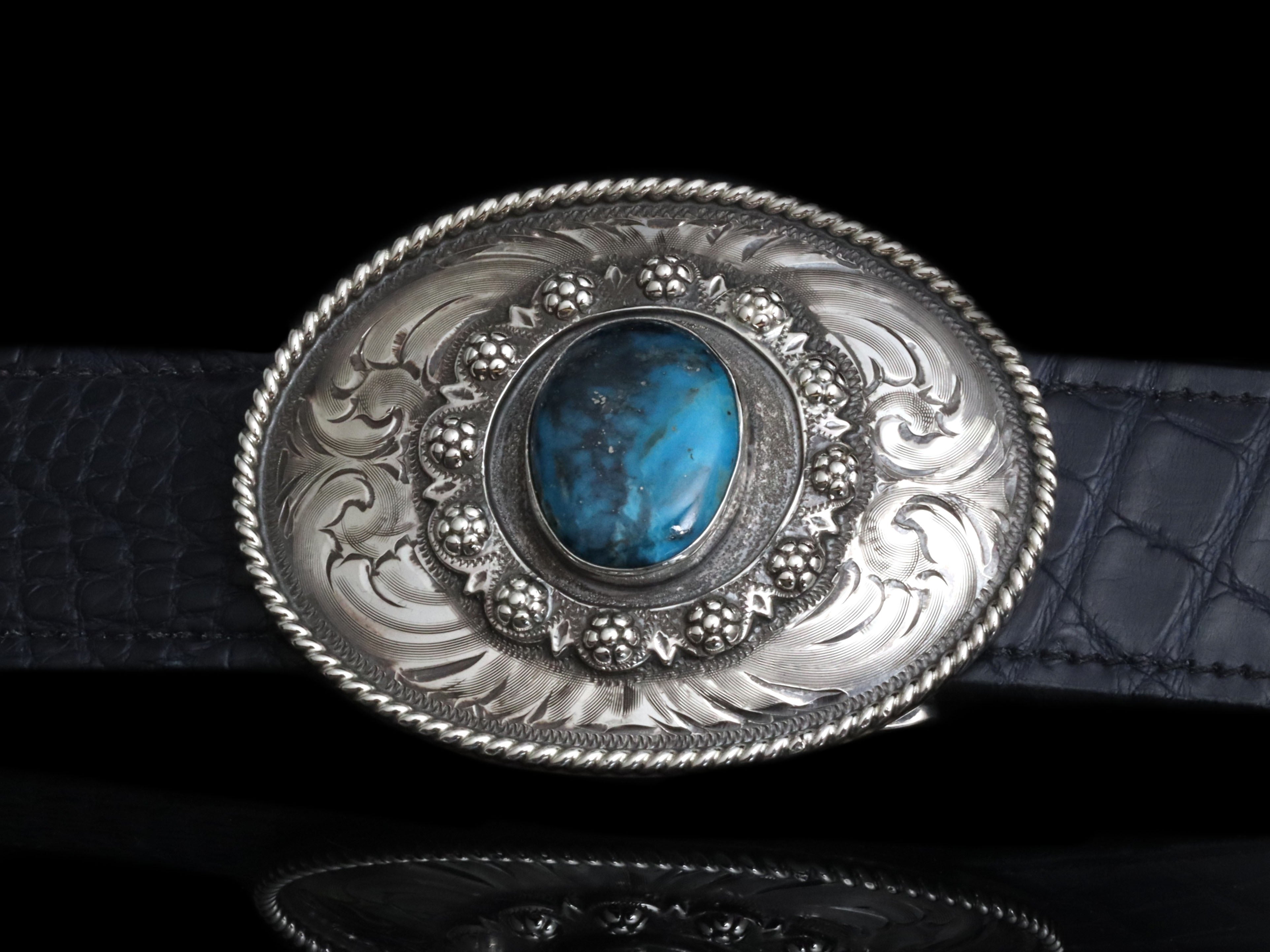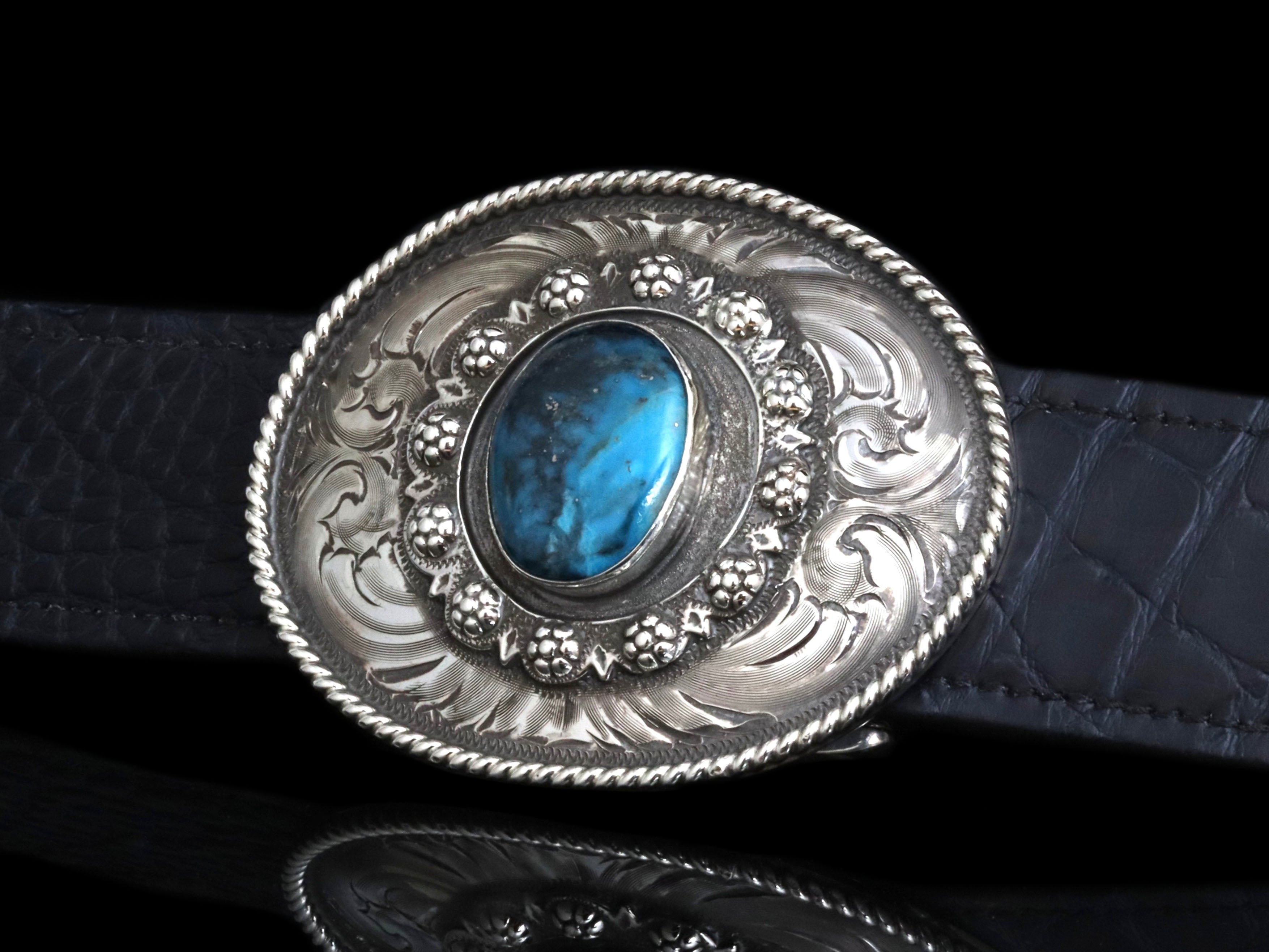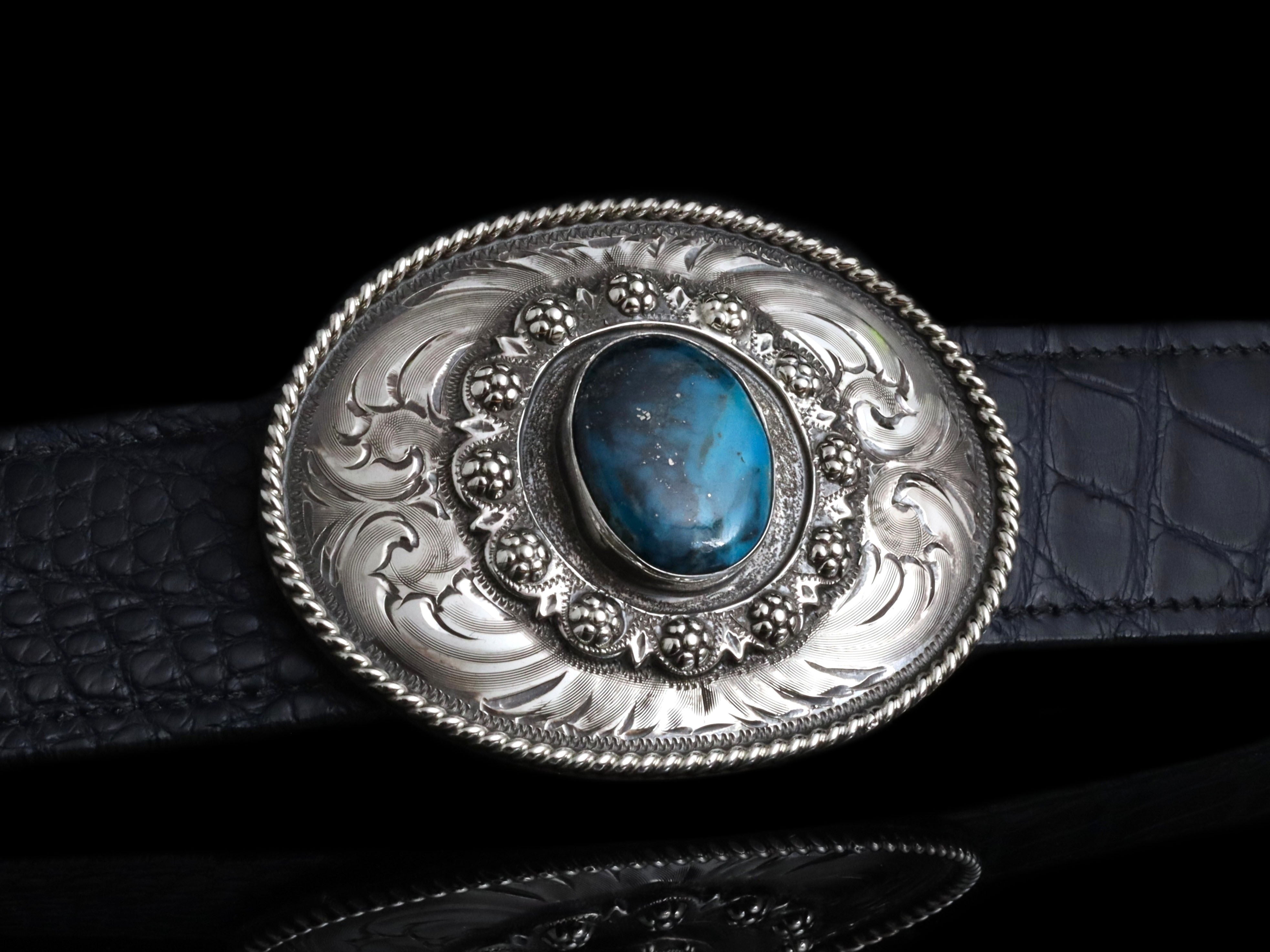 The AQR50 Scroll With Turquoise by Comstock Heritage is a Sterling silver AQ50-shaped buckle that blends classic design with a touch of vibrant color. At its center, a large piece of Kingman Turquoise sits within a finely detailed berry concho base, adding depth and contrast to the Classic scroll style hand-engraved oval background. The entire design is framed by a hand-wrought Sterling silver rope edge, bringing a timeless Western aesthetic to this standout piece.