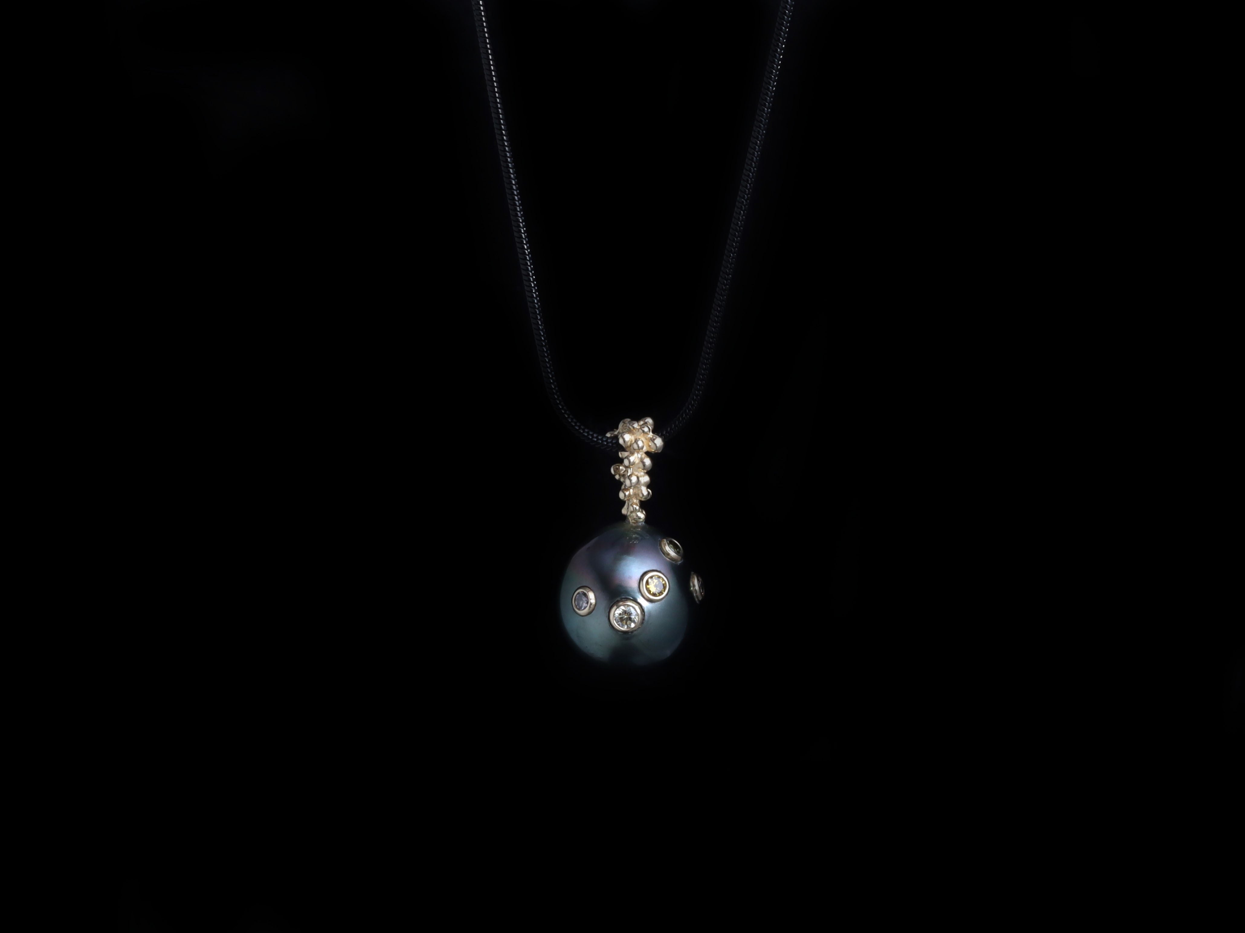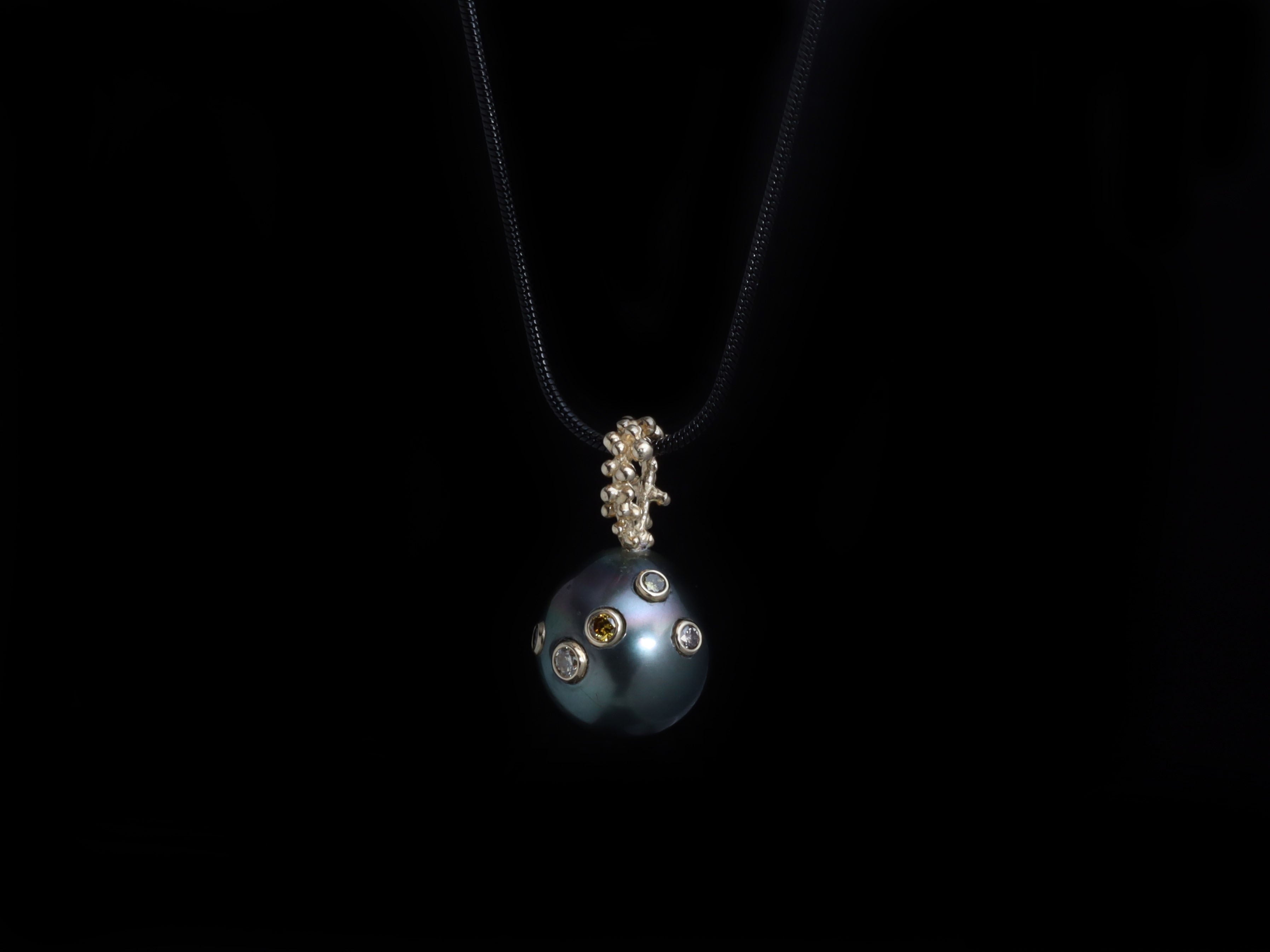The Diamond Drop Pearl is a lustrous 13.8mm dark grey Tahitian pearl with a peacock overtone, that has been embellished with 5 glittering natural multi-color diamonds. Each diamond is set in a 14k yellow gold bezel, matching the hand crafted gold bubble bail. The perfect ocean minded pendant that can be dressed up with multiple necklaces, or stand alone and shine. Made in the US with sustainable materials including a natural pearl from Tahiti.
