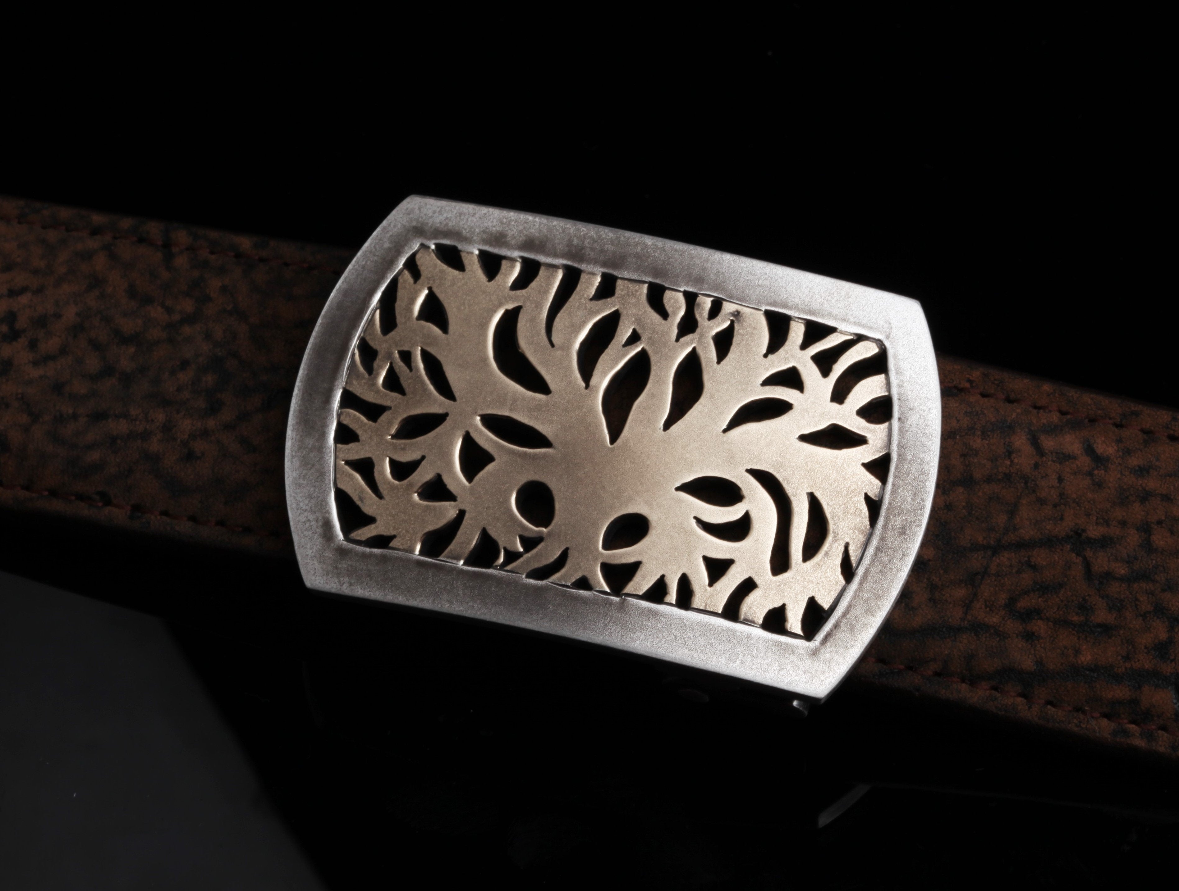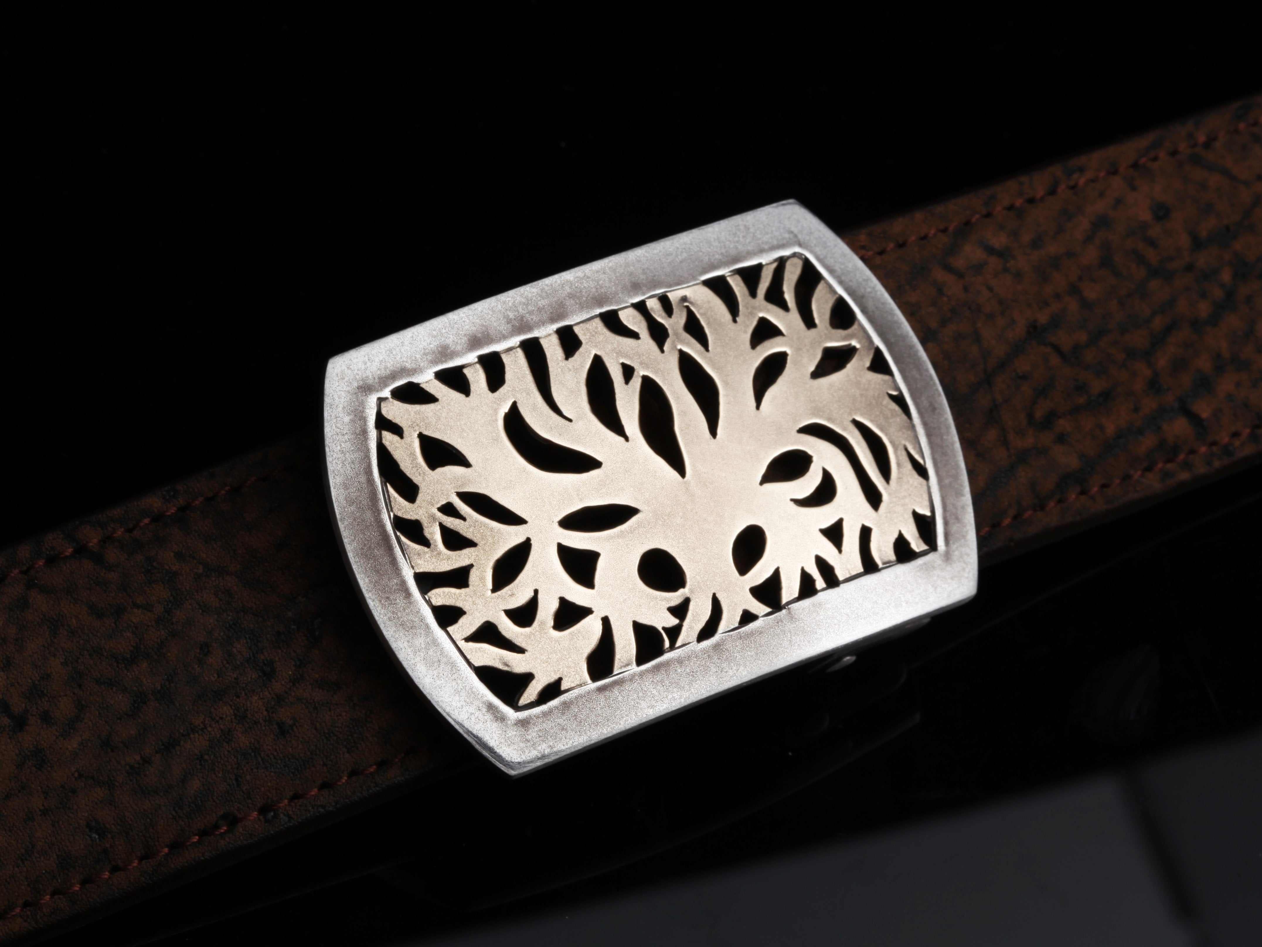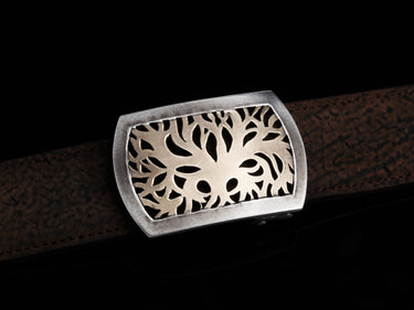 The Halogen Arborist by Comstock Heritage is a new age take on nature. Starting with a Sterling silver hand cut "Halogen" shape base, our master craftsman flush set a matching hand cut 14k yellow gold inlay of an organic looking tree. This piece is then antiqued for a dark finish.