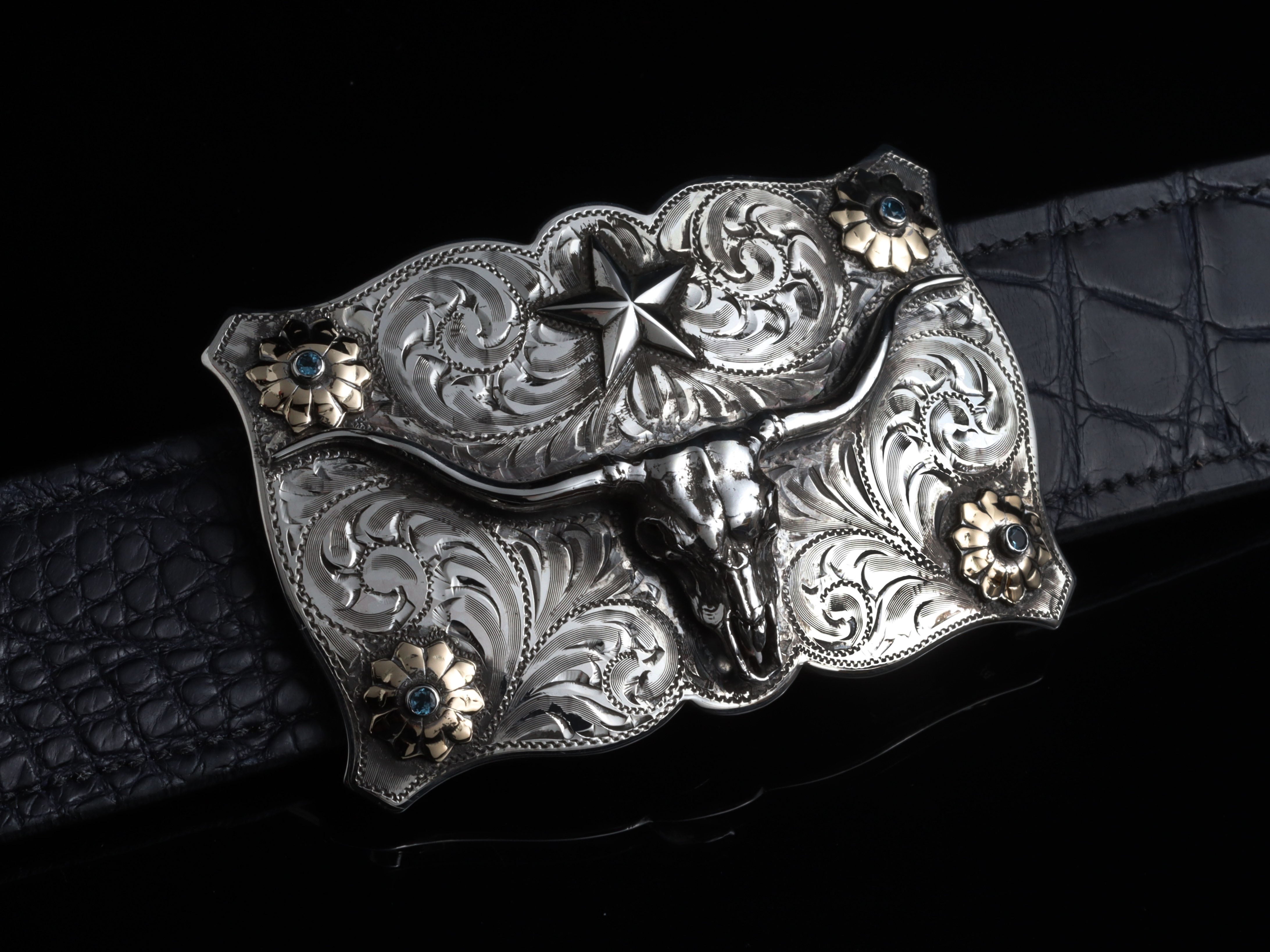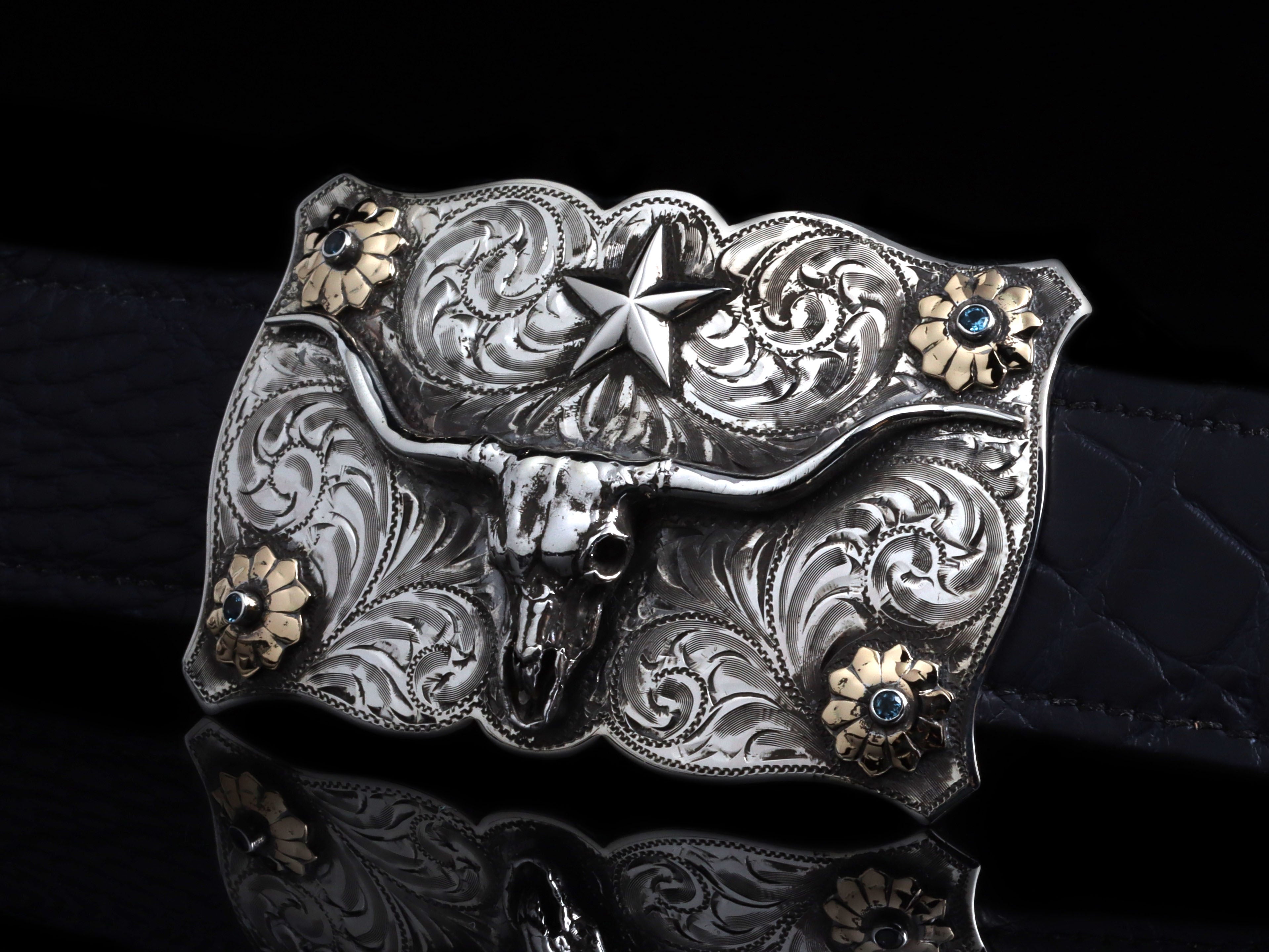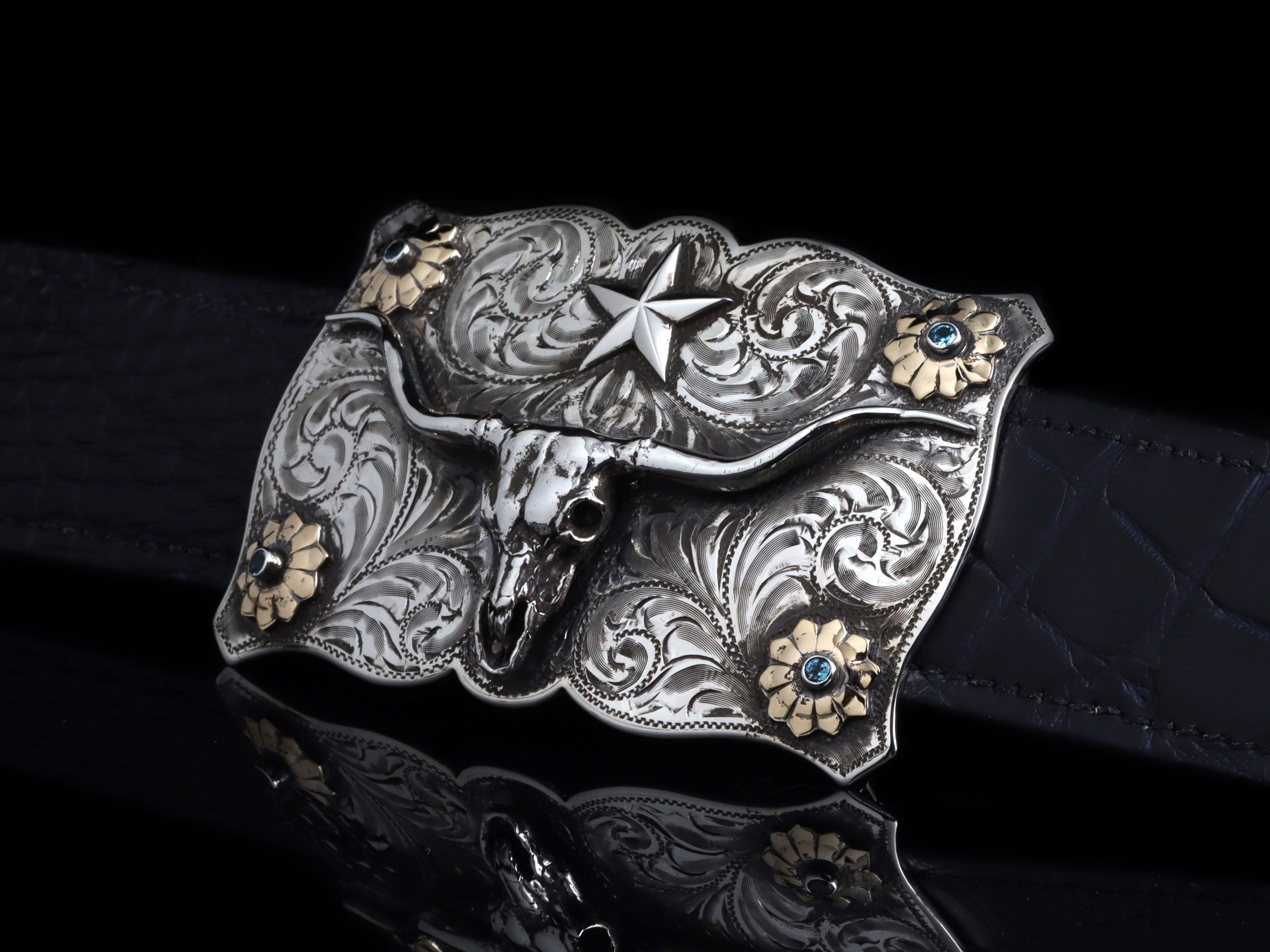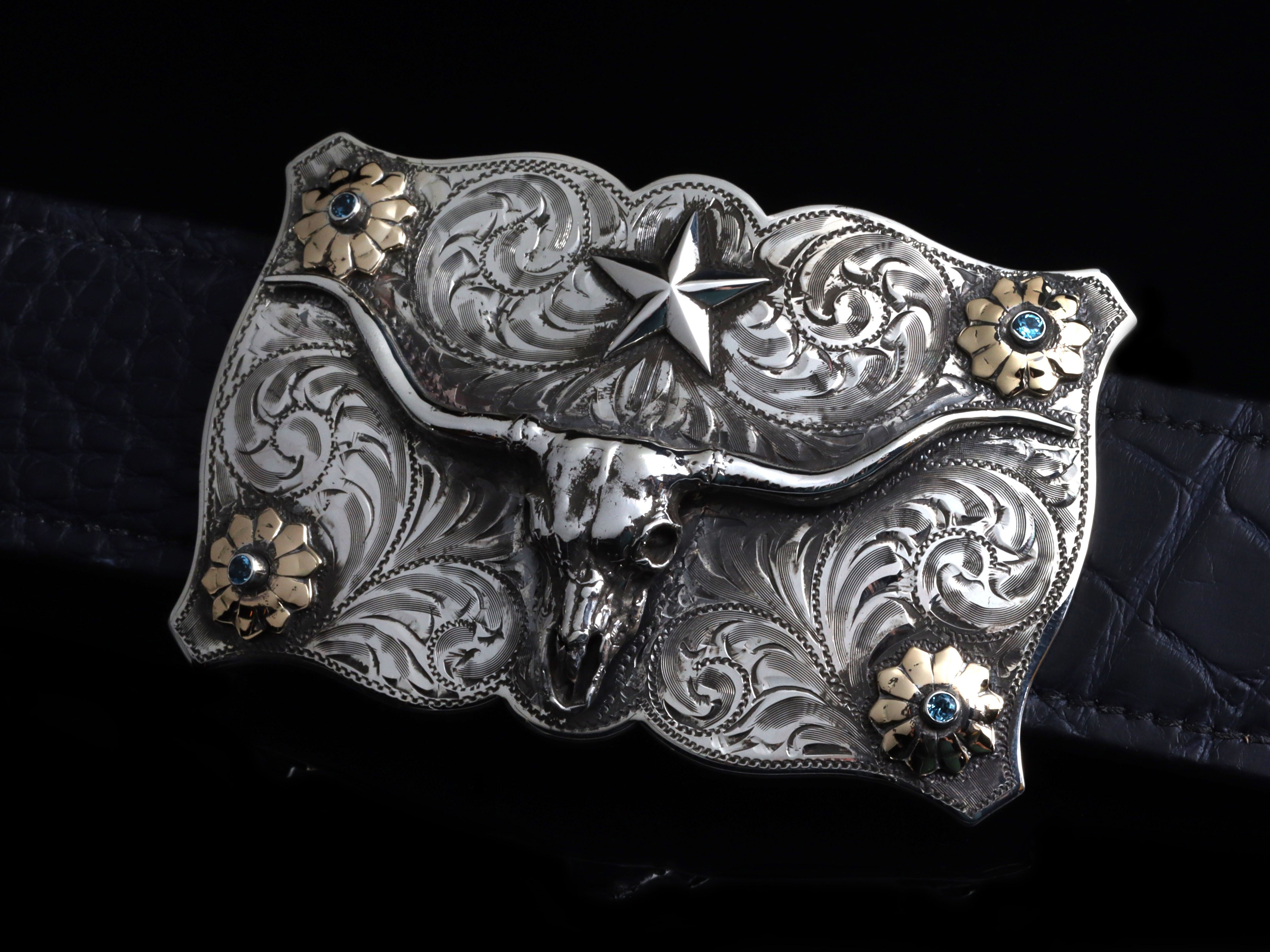The Lonestar Steer Skull & Stones by Comstock Heritage is a Sterling silver "Lonestar" shape Sterling silver buckle that fits up to a 1 ½" belt strap. This unique shape hosts a hand cast Sterling silver steer skull figure and star in the center and four colorful flowers in the corners. Blue Montana sapphires sit in the center of 14k yellow gold flowers and the whole scene is surrounded by hand cut scroll engraving.