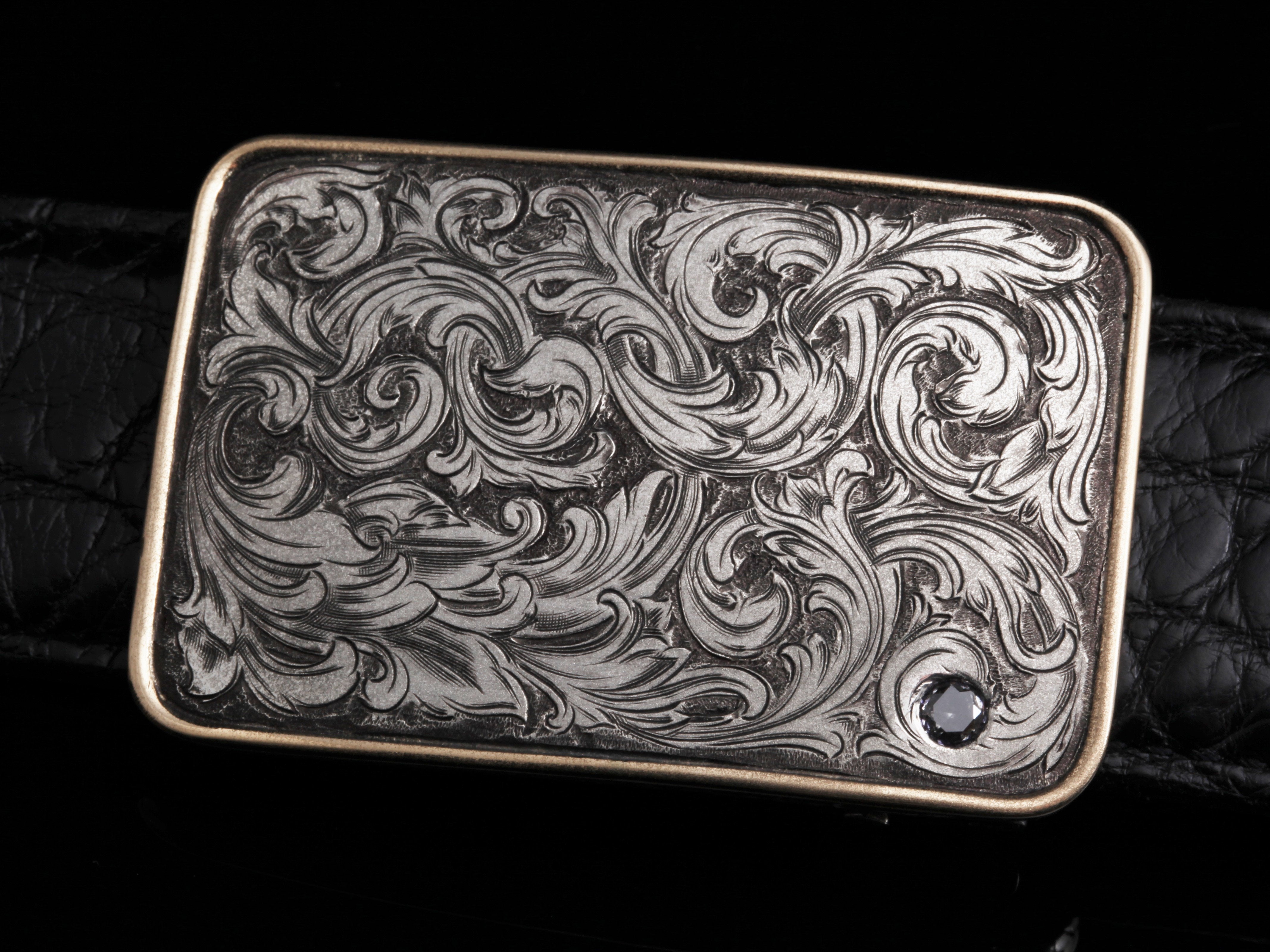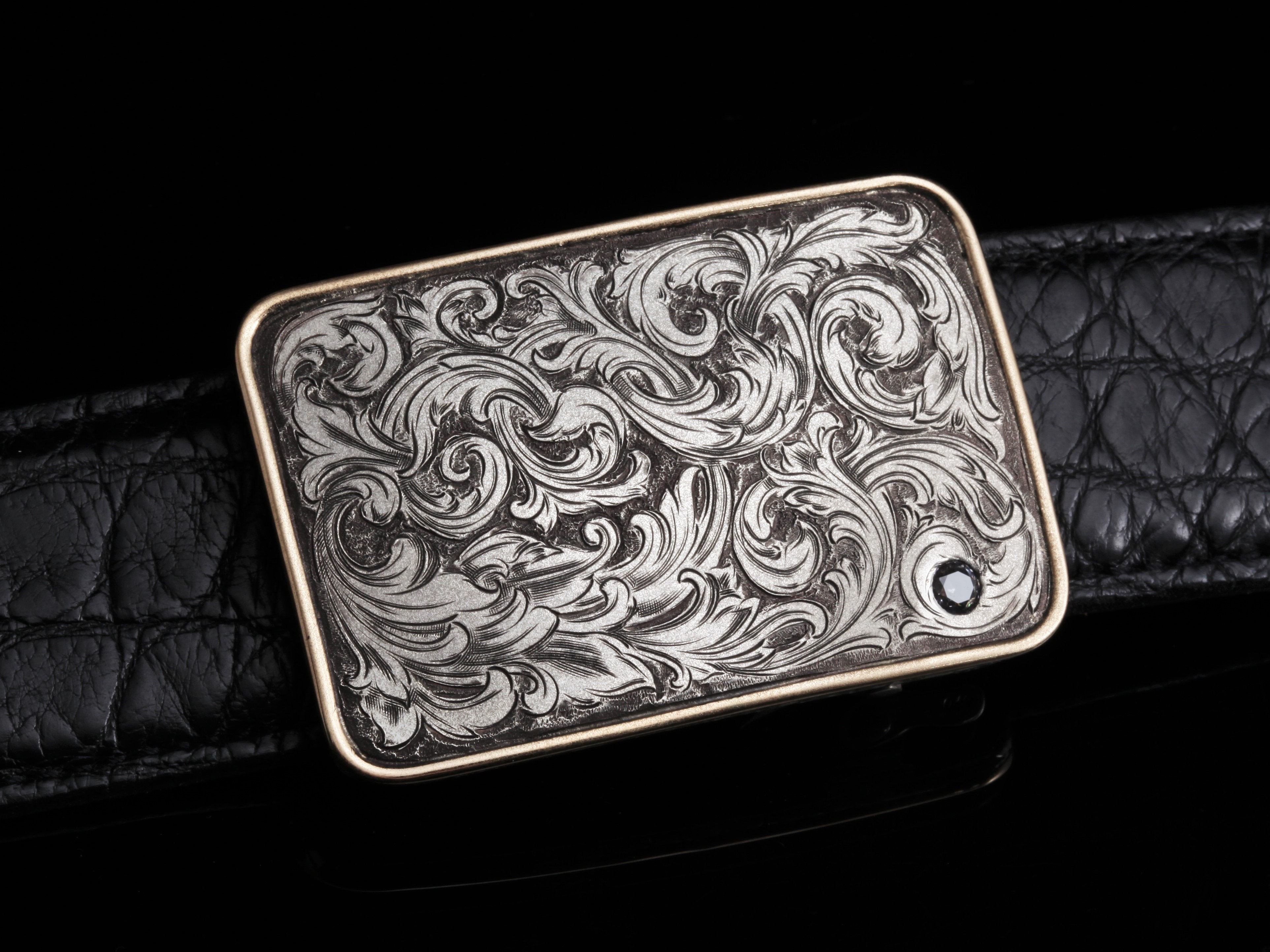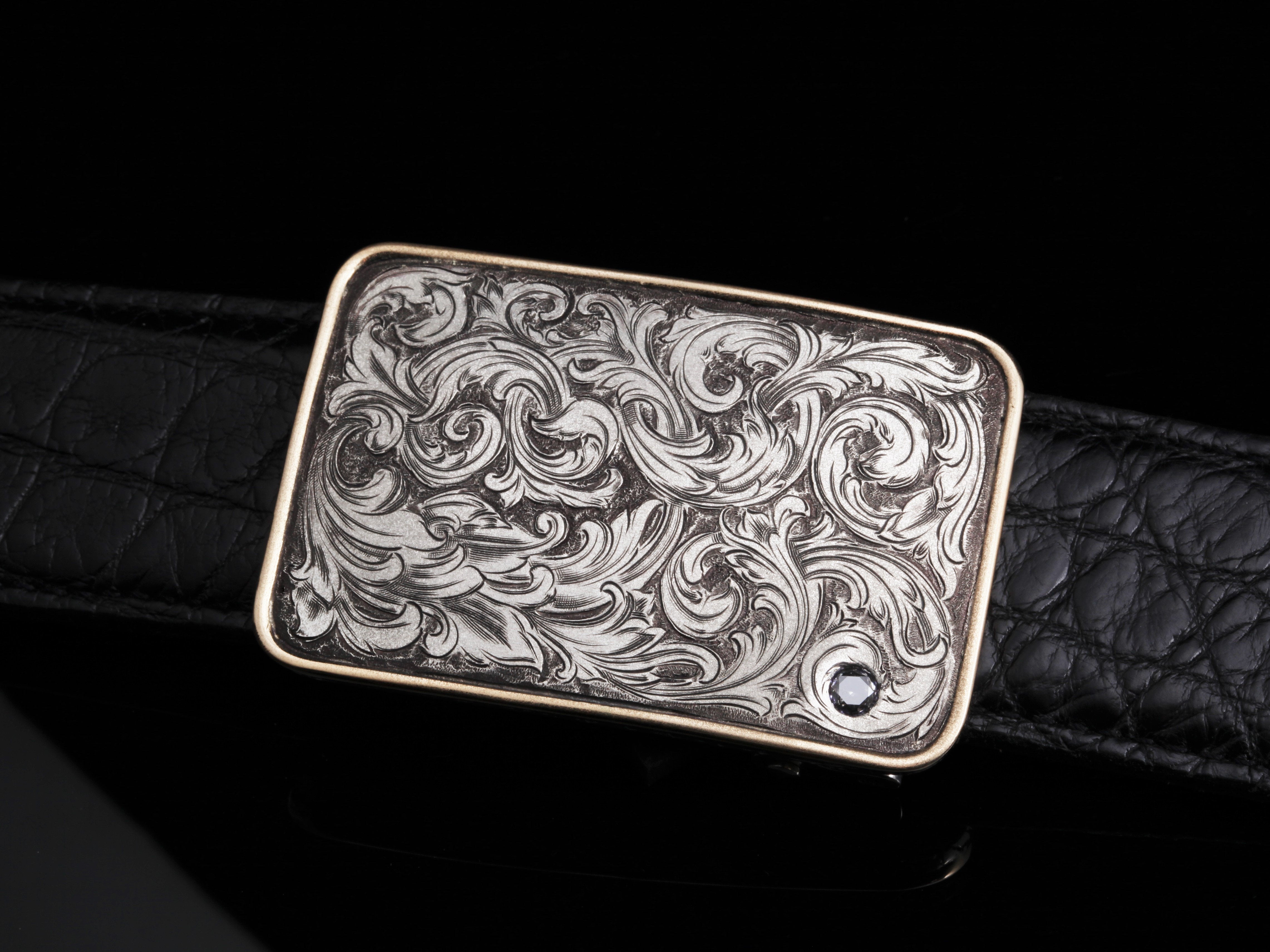 The Mason Barber by Comstock Heritage is a "Mason" style belt buckle inspired by a renowned U.S. Treasury engraver, lending a historical nod to its detailed design. The surface features meticulous note-style hand engraving with a pebble finish for added depth. A .5tcw gray diamond sits prominently on the face, adding a refined touch. The entire piece is framed in 14k gold round wire, tying the elements together with elegance and contrast.