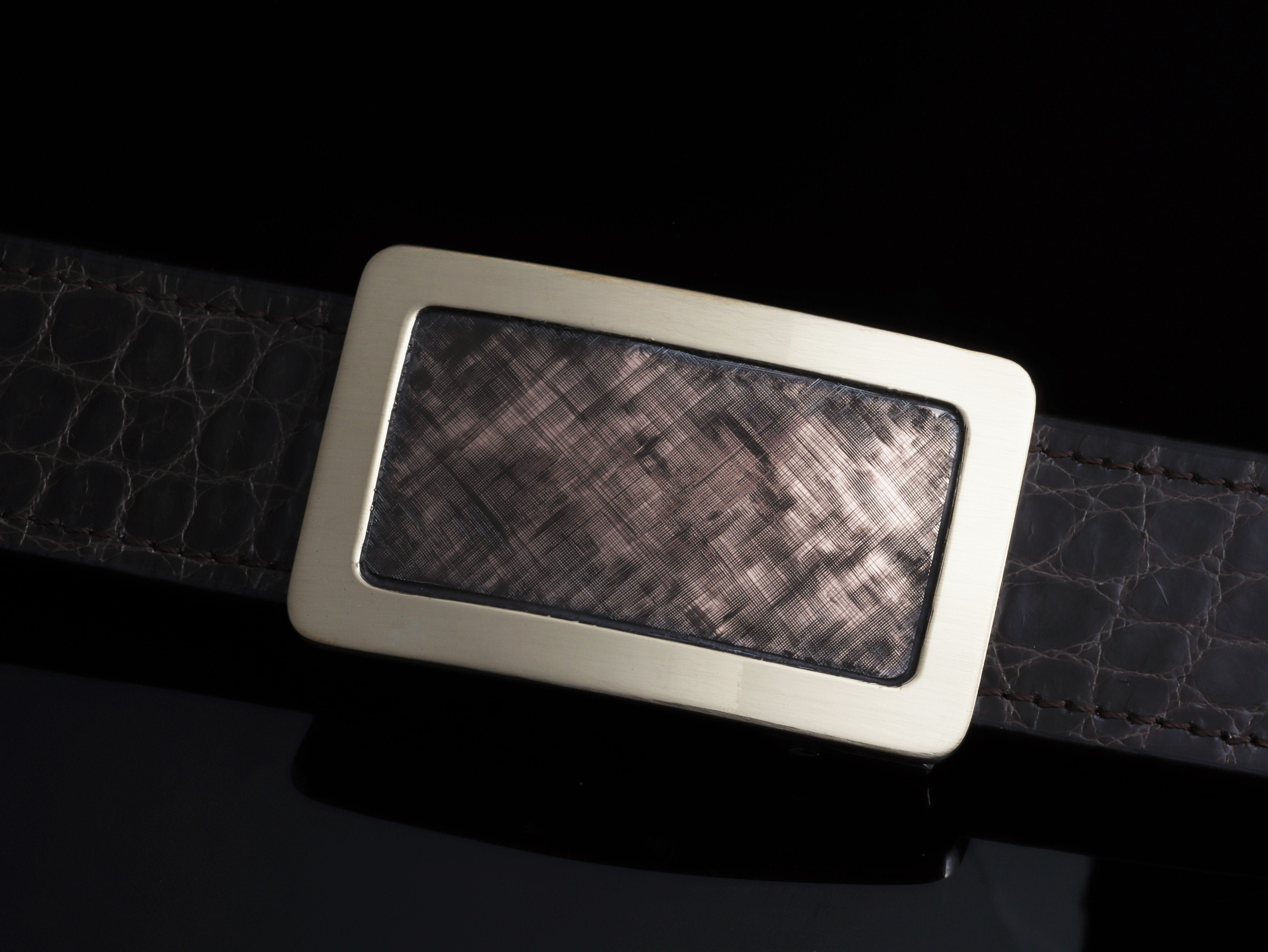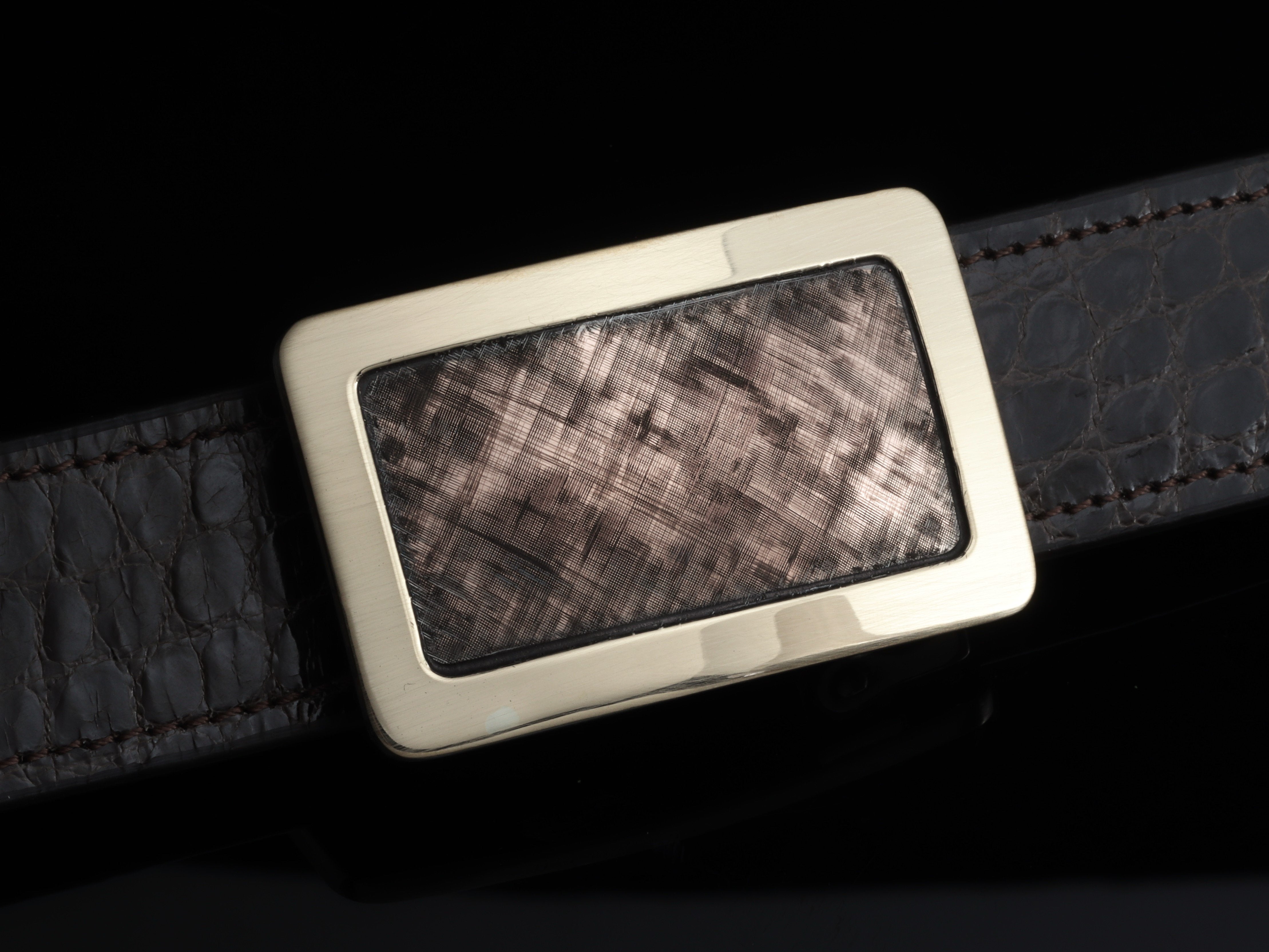 The Mason Scott by Comstock Heritage is a heavy gauge Sterling silver "Mason" shape belt buckle, that appears to be made of solid gold. This buckle has a 14k yellow gold wide border that has been hand formed around a 14k rose gold center that has been embellished with Florentine engraving.