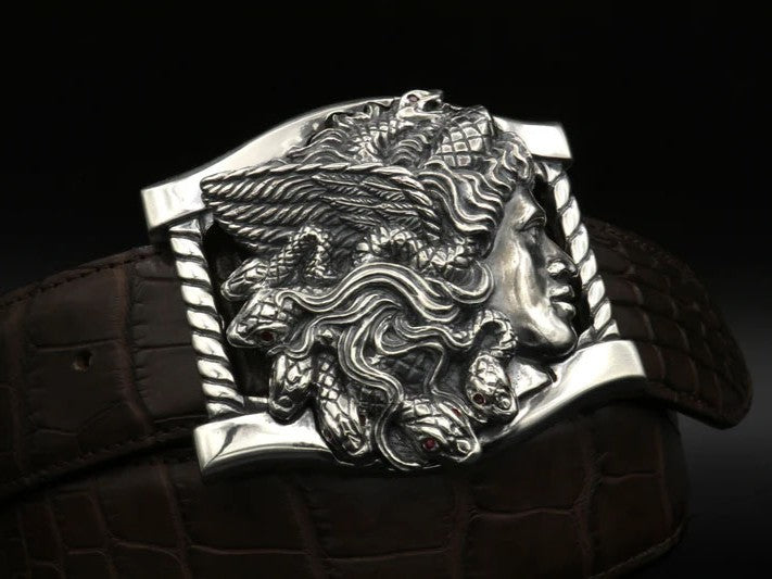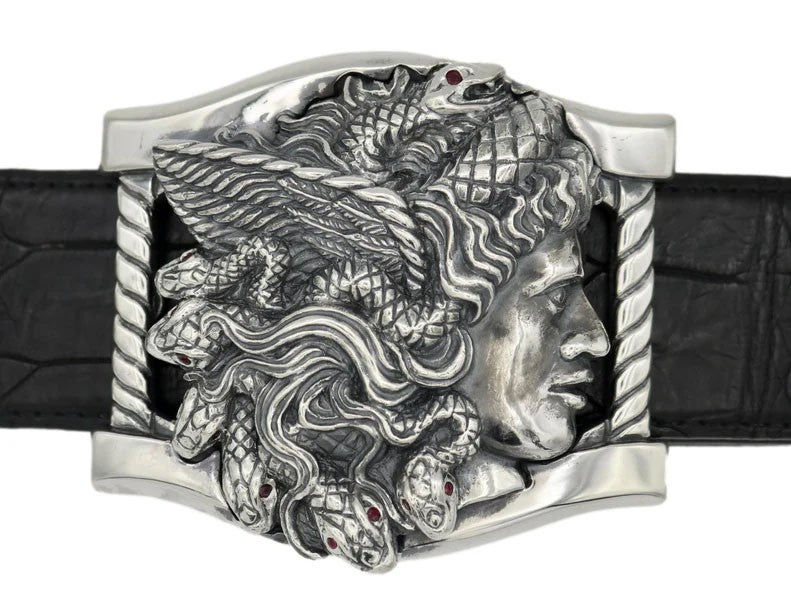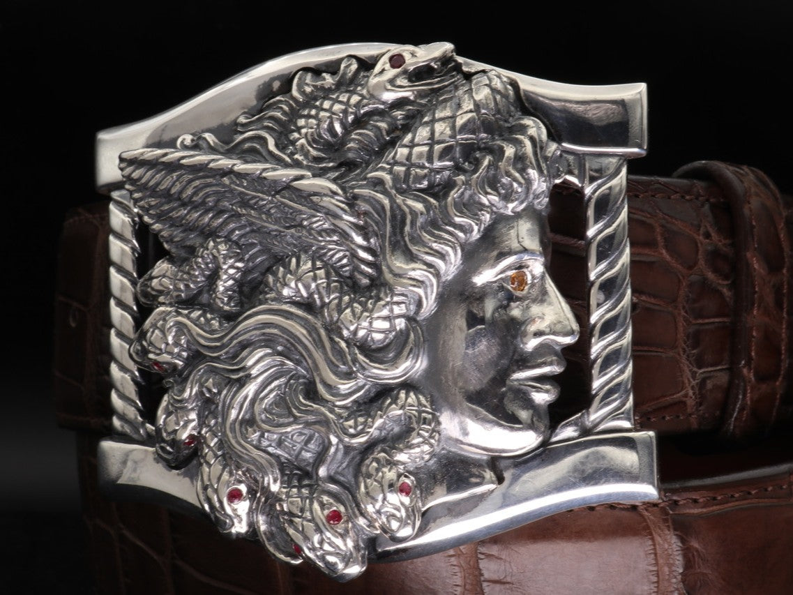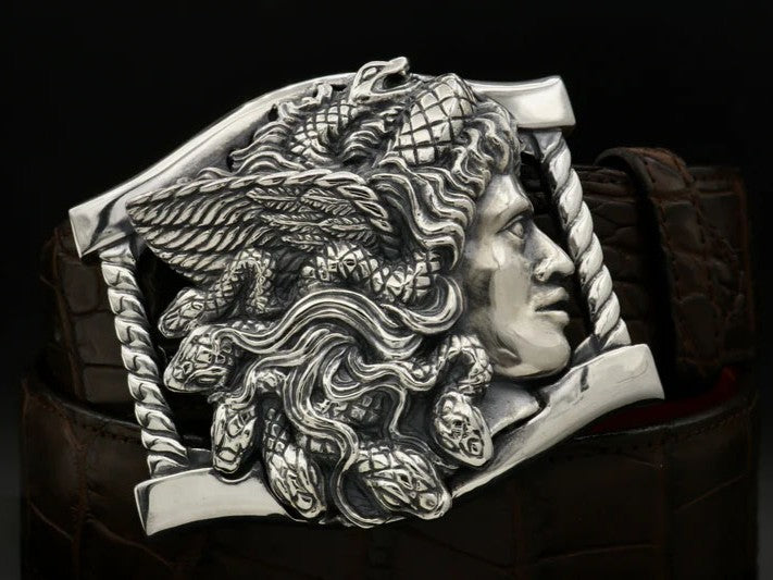 The Medusa buckle by Jeff Deegan draws inspiration from Greek mythology and the legend of the beautiful yet doomed Gorgon. Crowned with serpents and endowed with formidable power, Medusa’s gaze was said to turn all who looked upon her to stone. Even after her defeat by Perseus, her image endured — most notably upon the shield of Athena, where it served as a symbol of protection and enduring strength.