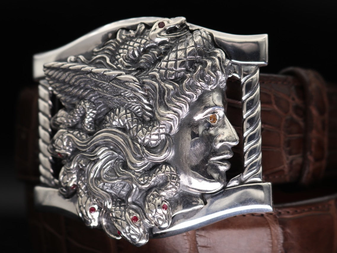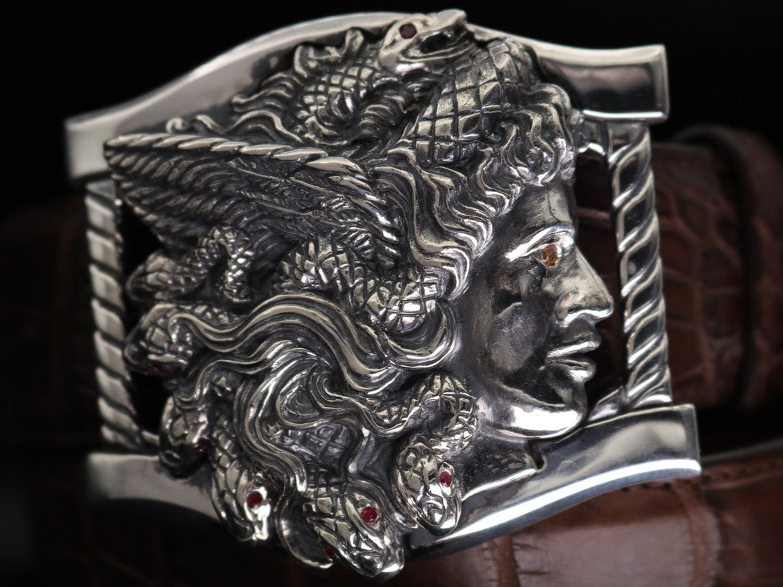 This custom interpretation of the Medusa buckle is rendered in sterling silver and set with twelve rubies, placed within the eyes of each serpent. The stones, measuring approximately 2–2.5 mm, introduce a subtle depth of color that enhances the sculptural detail while reinforcing the enduring symbolism of strength and protection associated with the Medusa motif. Medusa herself has a hand set cognac diamond for her eye.