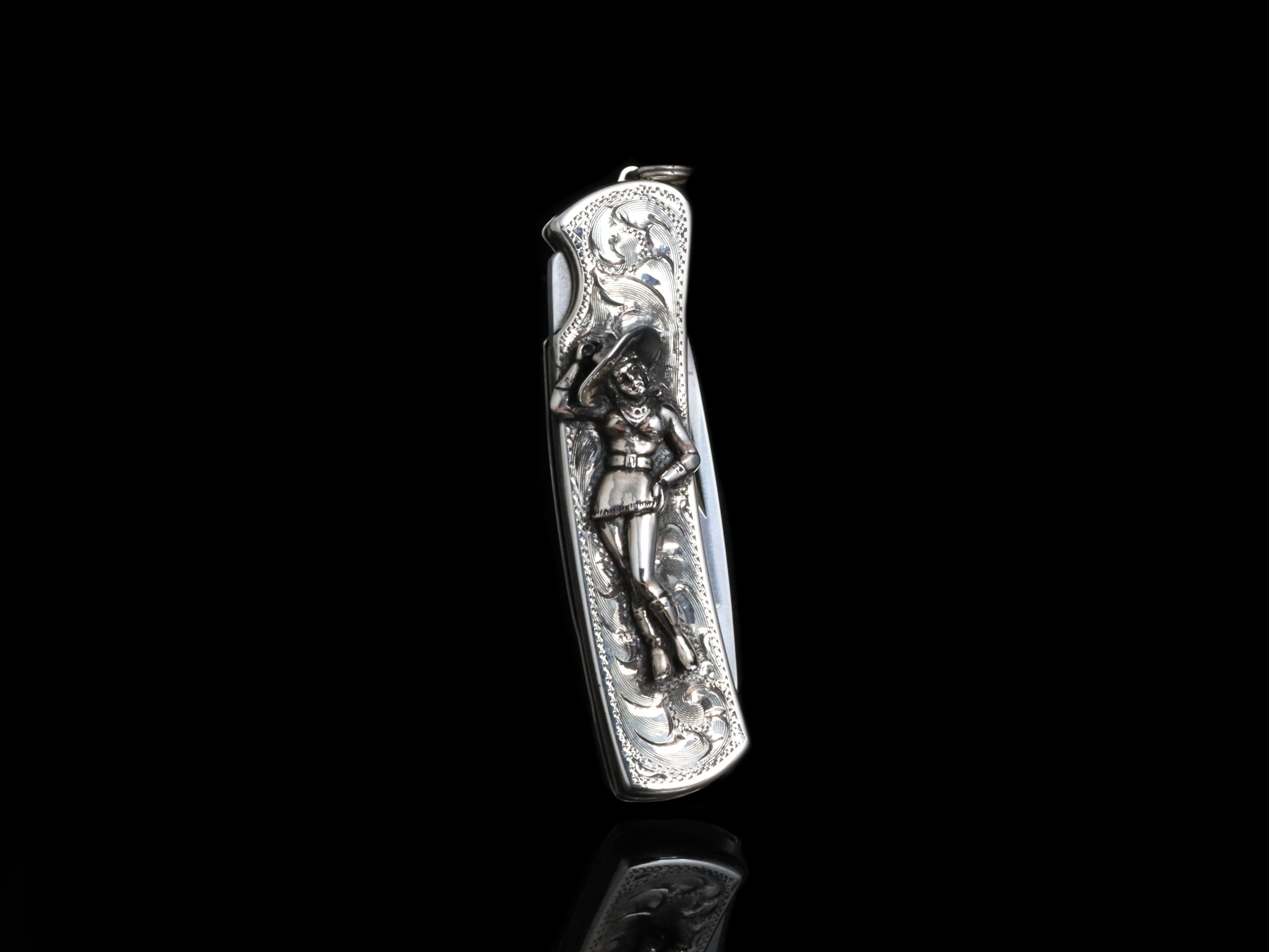 The Miss Rodeo Buck Knife by Comstock Heritage is a fun gift to keep in your pocket. We have added Sterling silver sides to a classic buck knife along with hand engraving and our classic Miss Rodeo figure. We can also add a logo, initials or brand in the center for added color or detail. Contact our Custom Concierge at custom@comstockheritage.com