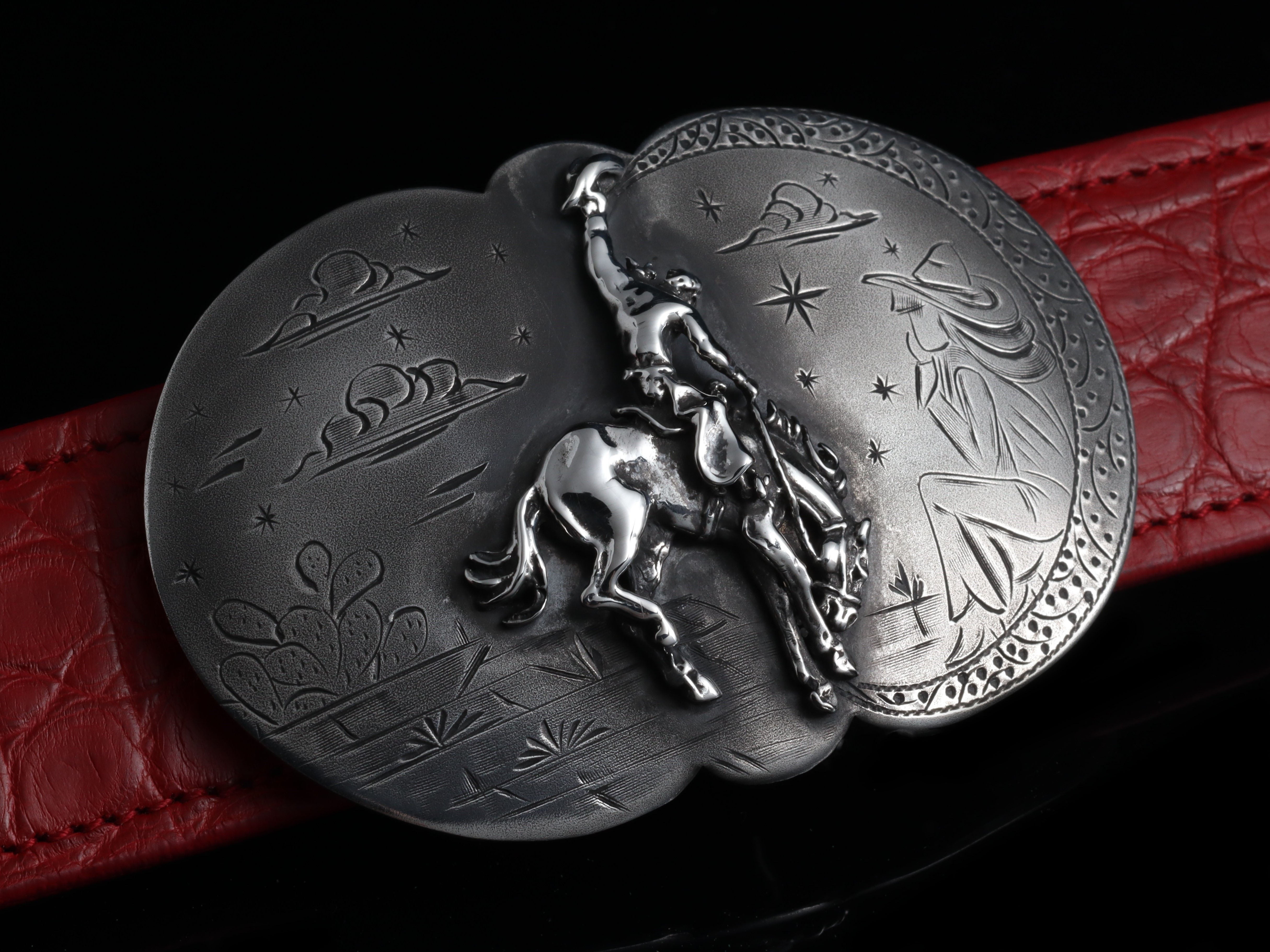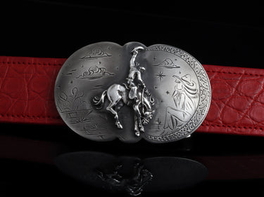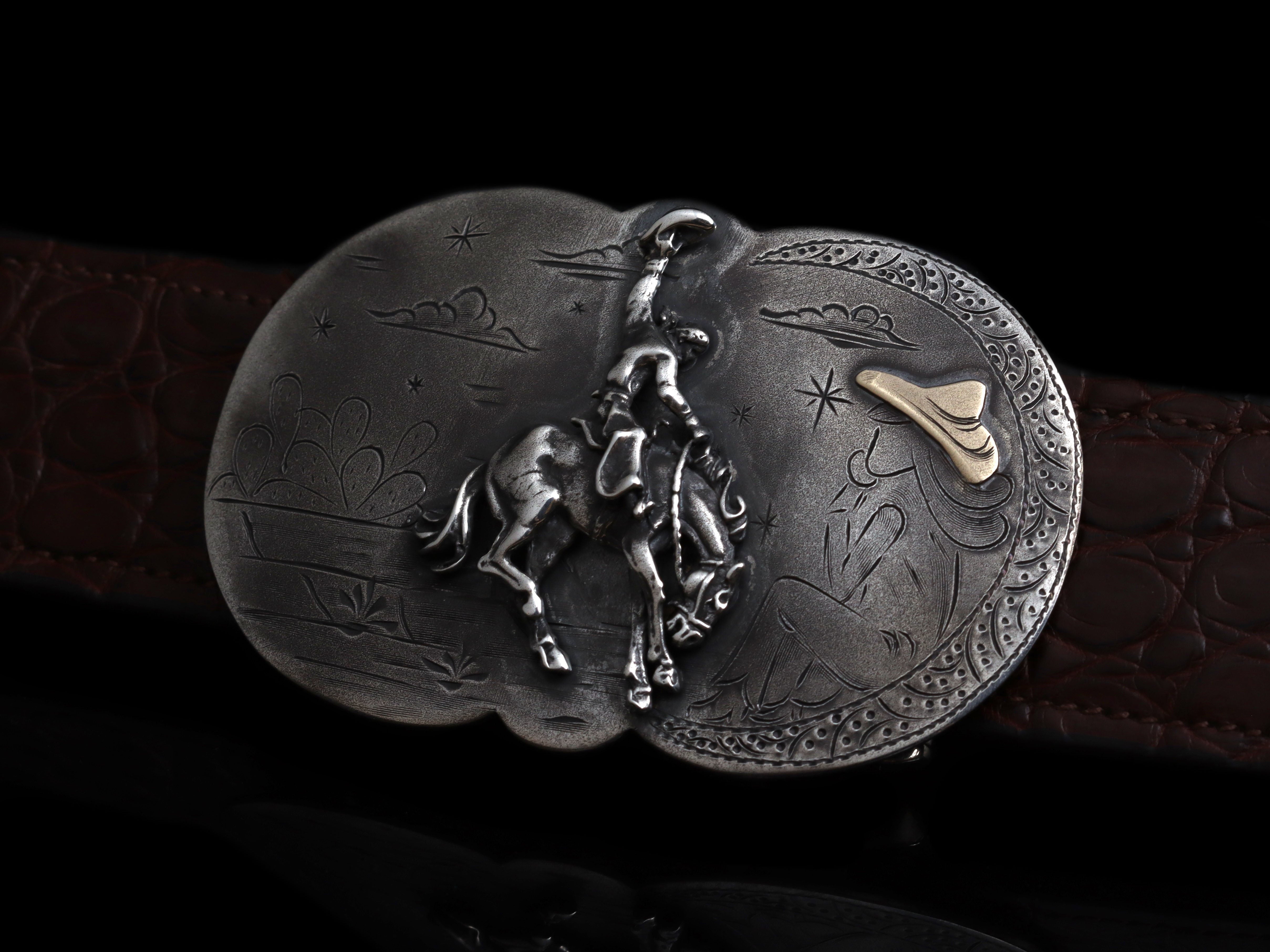 A 100% hand-wrought Sterling silver belt buckle featuring a cowboy and bronc motif set on a subtly detailed backdrop scene. Comstock's legendary craftsmanship is on full display here, with particularly impressive attention to the bucking horse’s musculature. No detail goes ignored—not even the sagebrush, cacti, tumbleweeds, or the gazing cowgirl watching. Heavy etching and buffing cap off a timeless aesthetic in this Western classic piece. You can choose from the original version, or the version where she is wearing a 14k yellow gold hat.