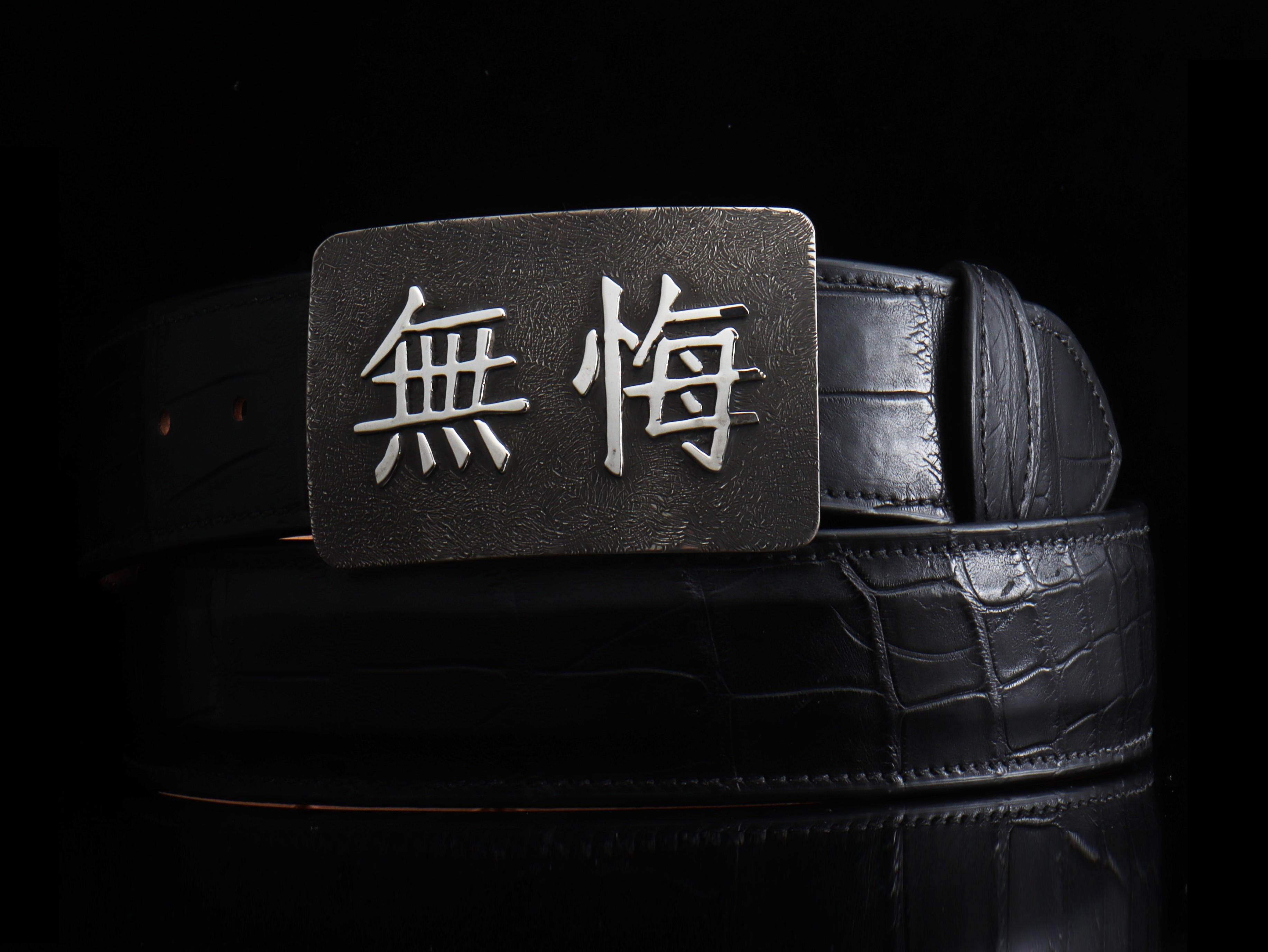 The No Regrets by Comstock Heritage buckle features "Poe" style engraving and its size accents the hand-etched, sterling’s stark look. This engraving has created the perfect backdrop for Japanese characters saying "No Regrets".