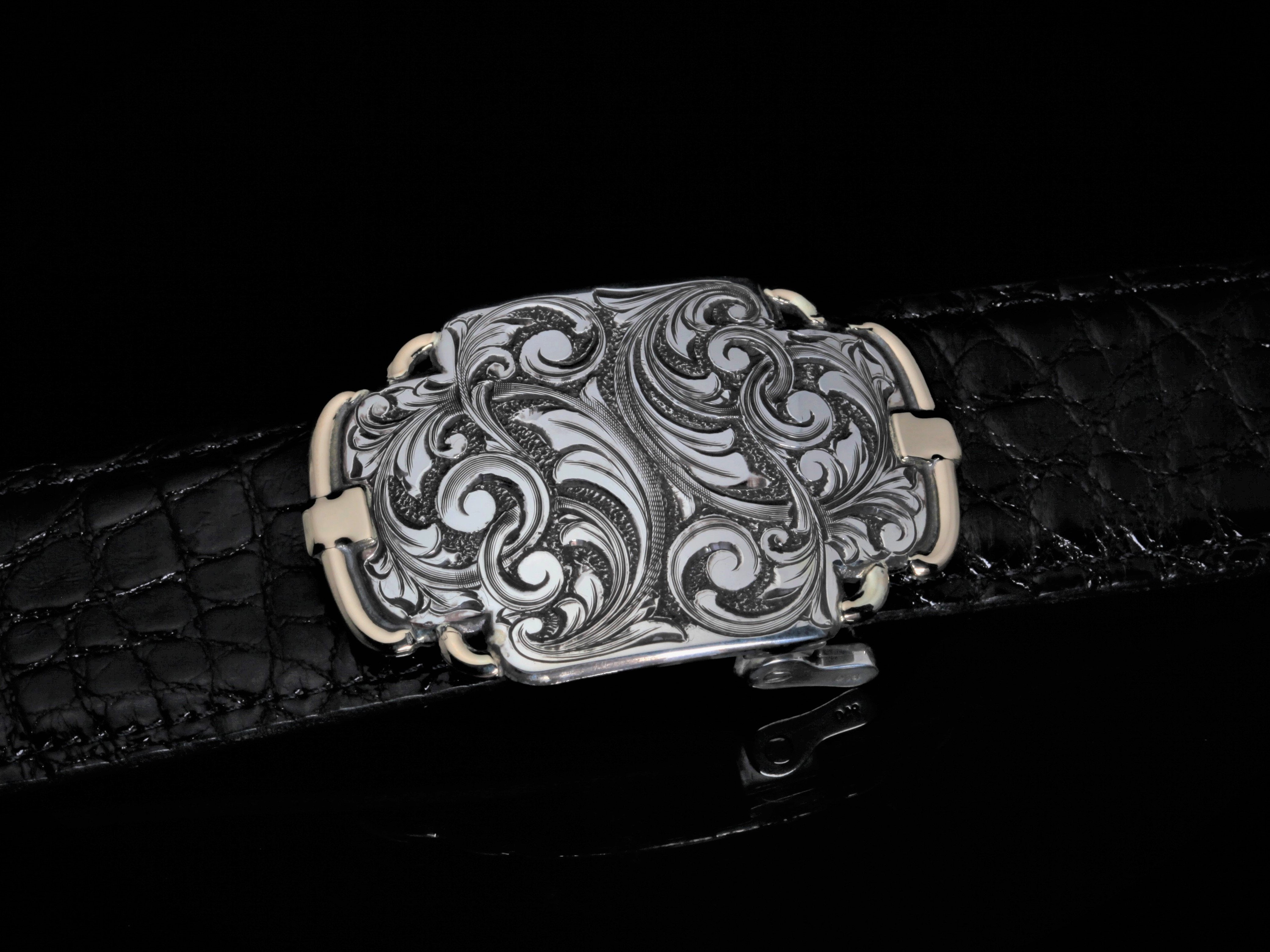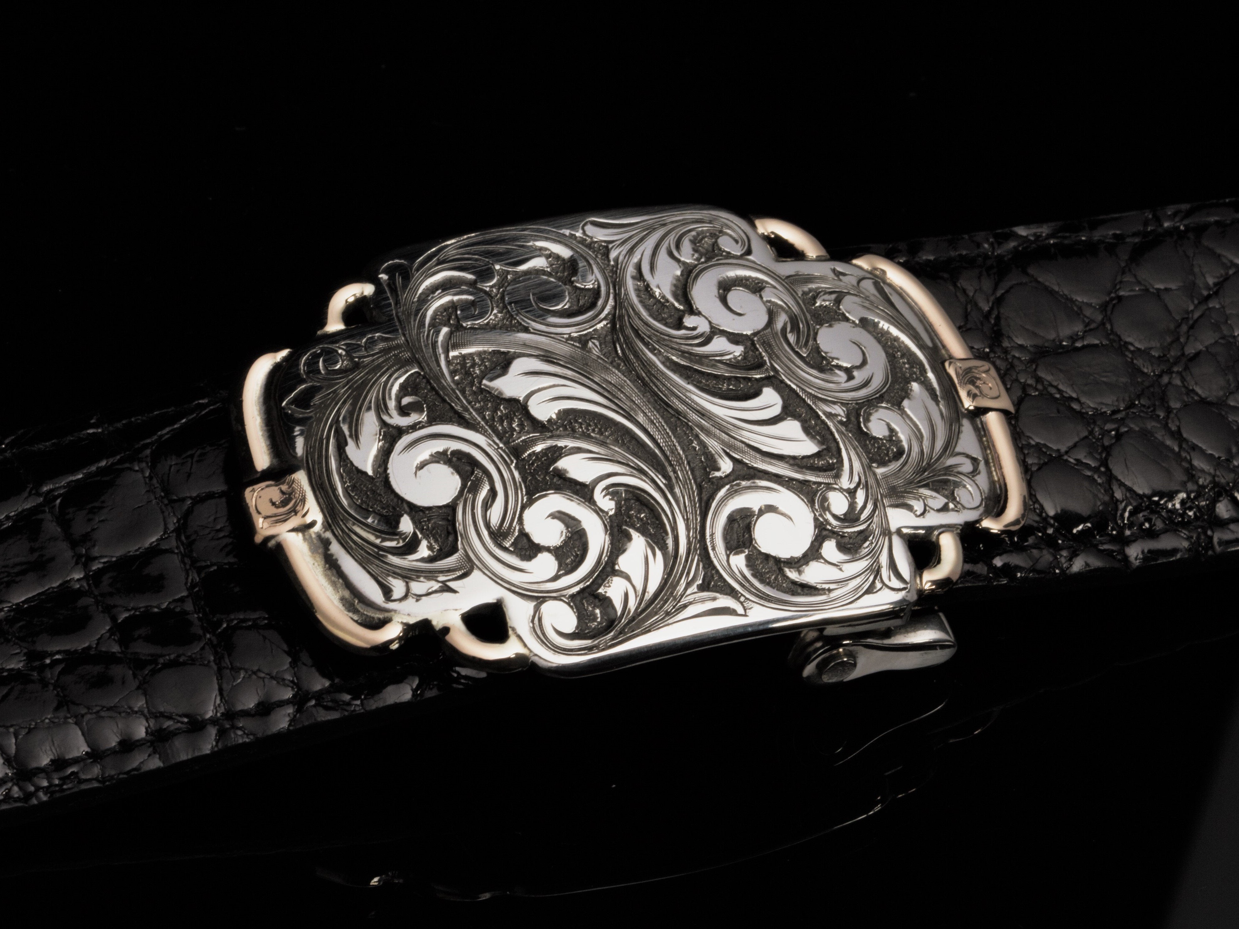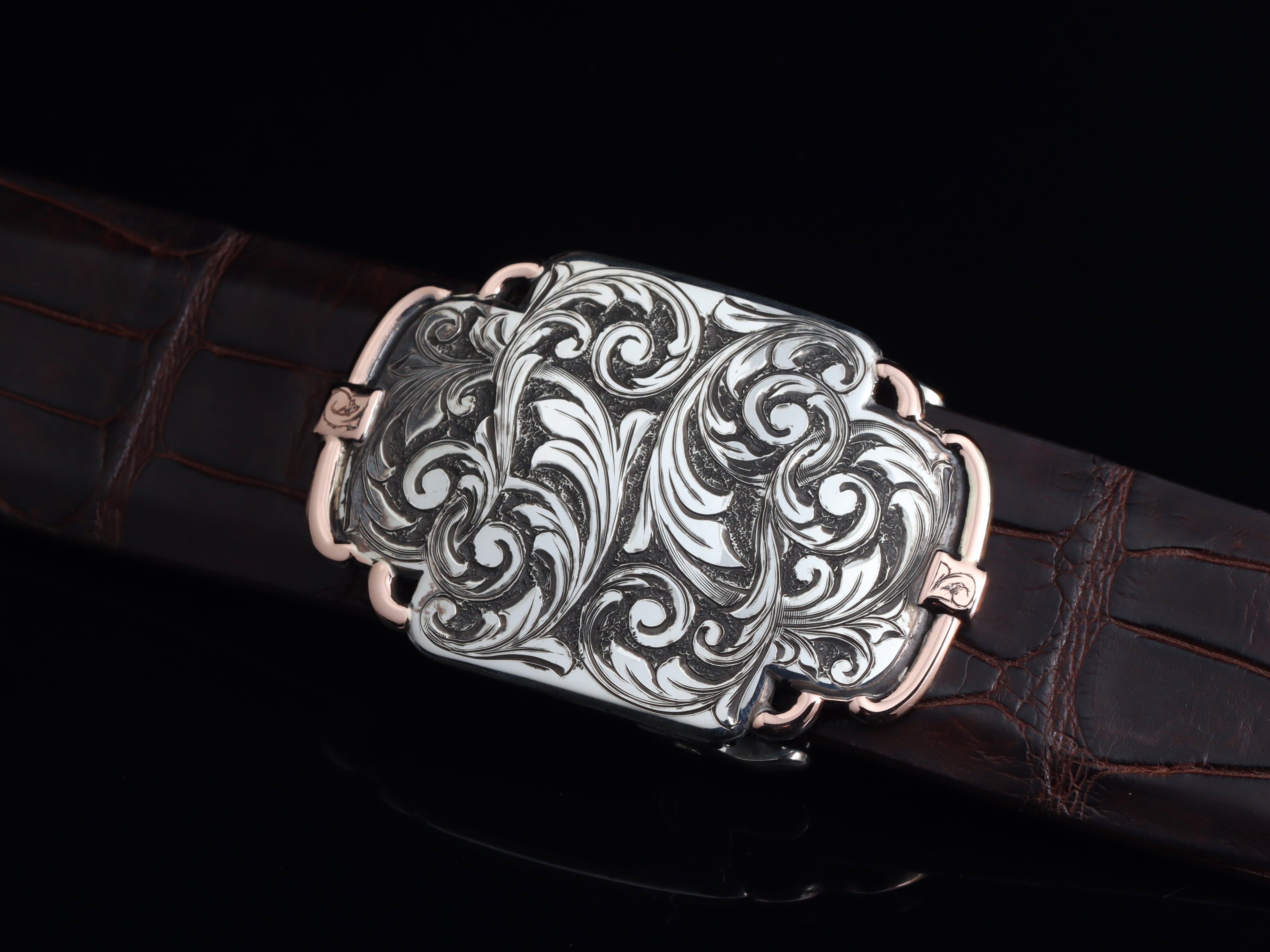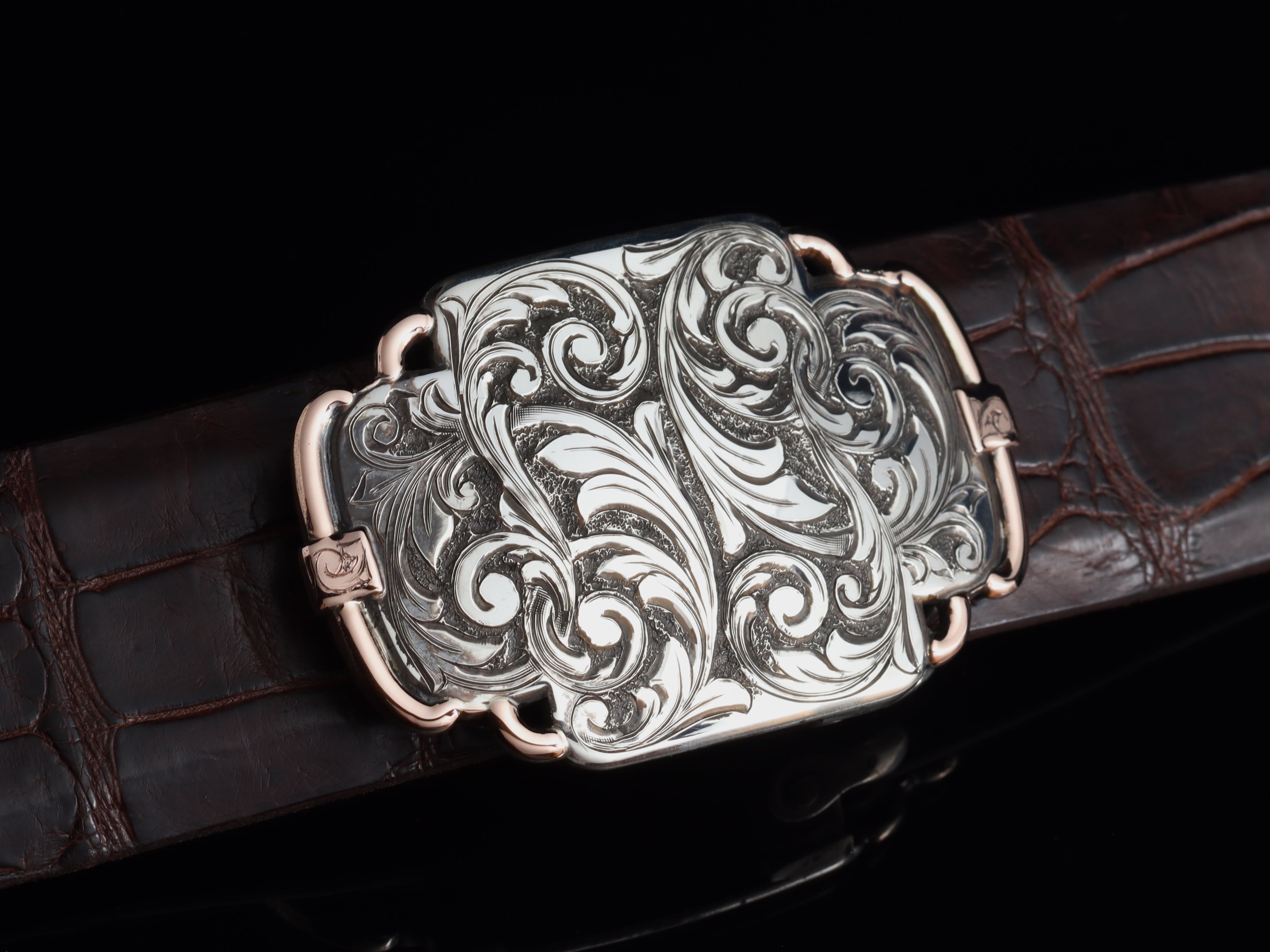 The Pendleton Austin 14k by Comstock Heritage is a modern interpretation of classic Deco style. Built on a Sterling silver base, this buckle features half-round 14k gold wire accents and a hand-cut Sterling silver border that frame the design with clean, structured lines. A blend of vintage influence and contemporary craftsmanship, it’s a piece that feels both timeless and fresh.