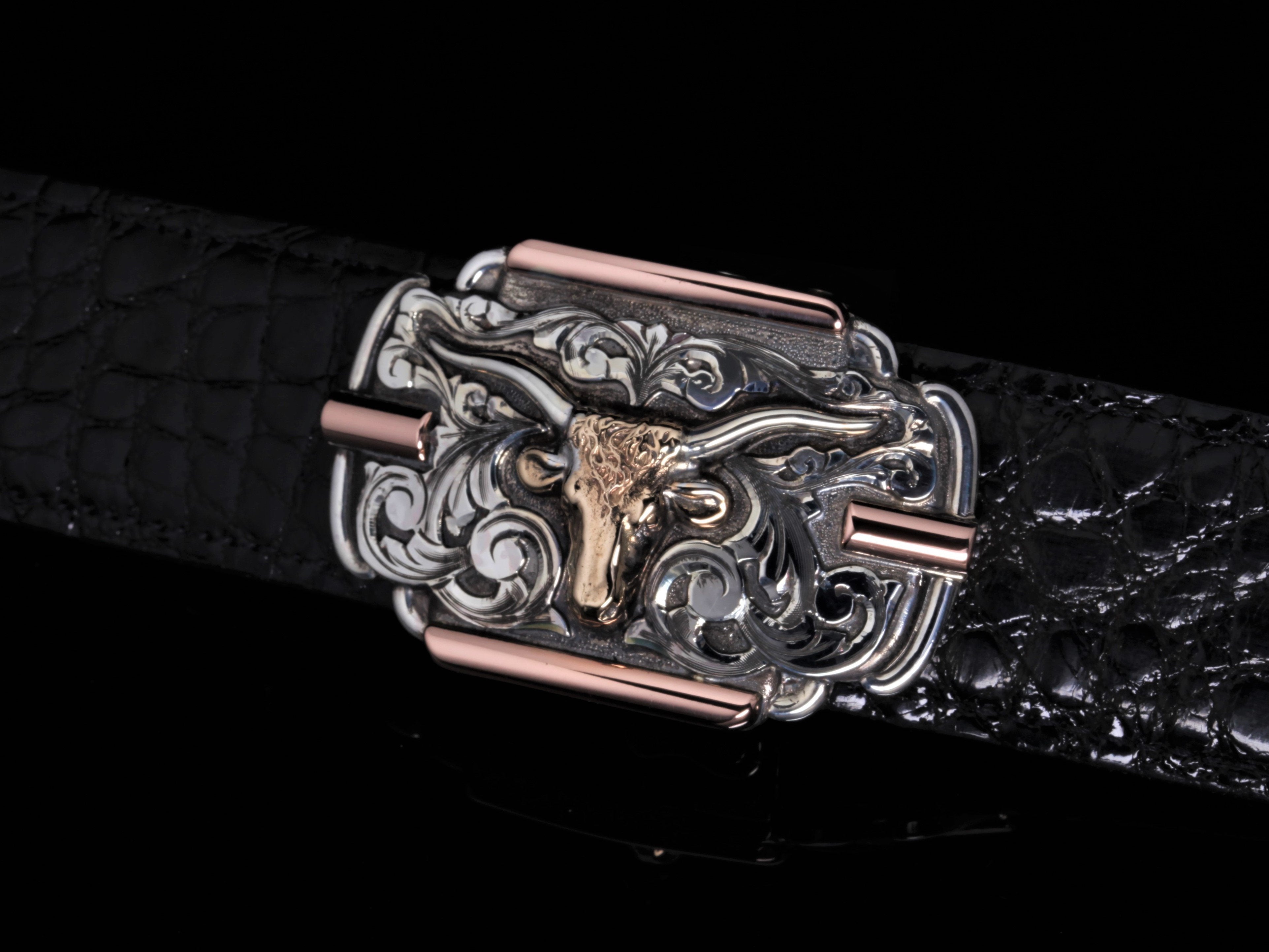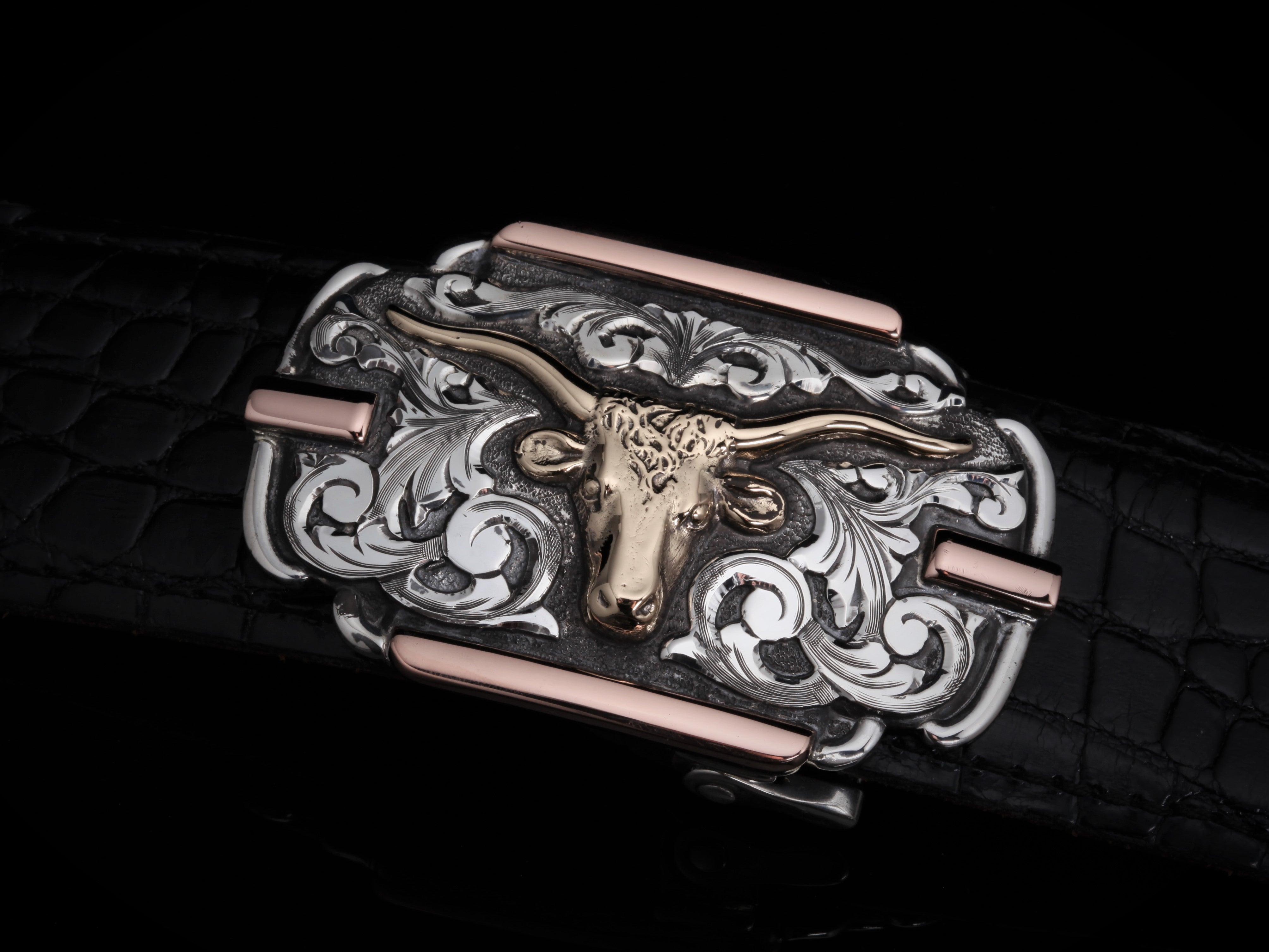 The Pendleton Ellis, Two Ways by Comstock Heritage are both a reminder of the Deco style, this sterling silver buckle is modernized by the half round 14k gold wire accents, hand cut sterling silver border, and one of our signature longhorn heads. One version has our signature longhorn head in Sterling silver only, the second has it with a 14k gold head and Sterling silver horns.