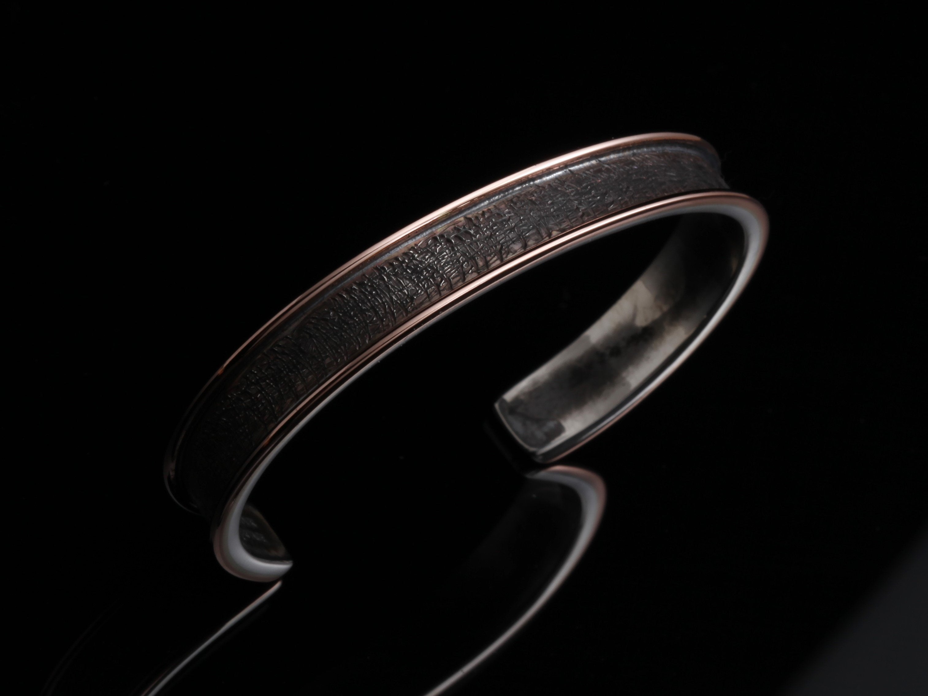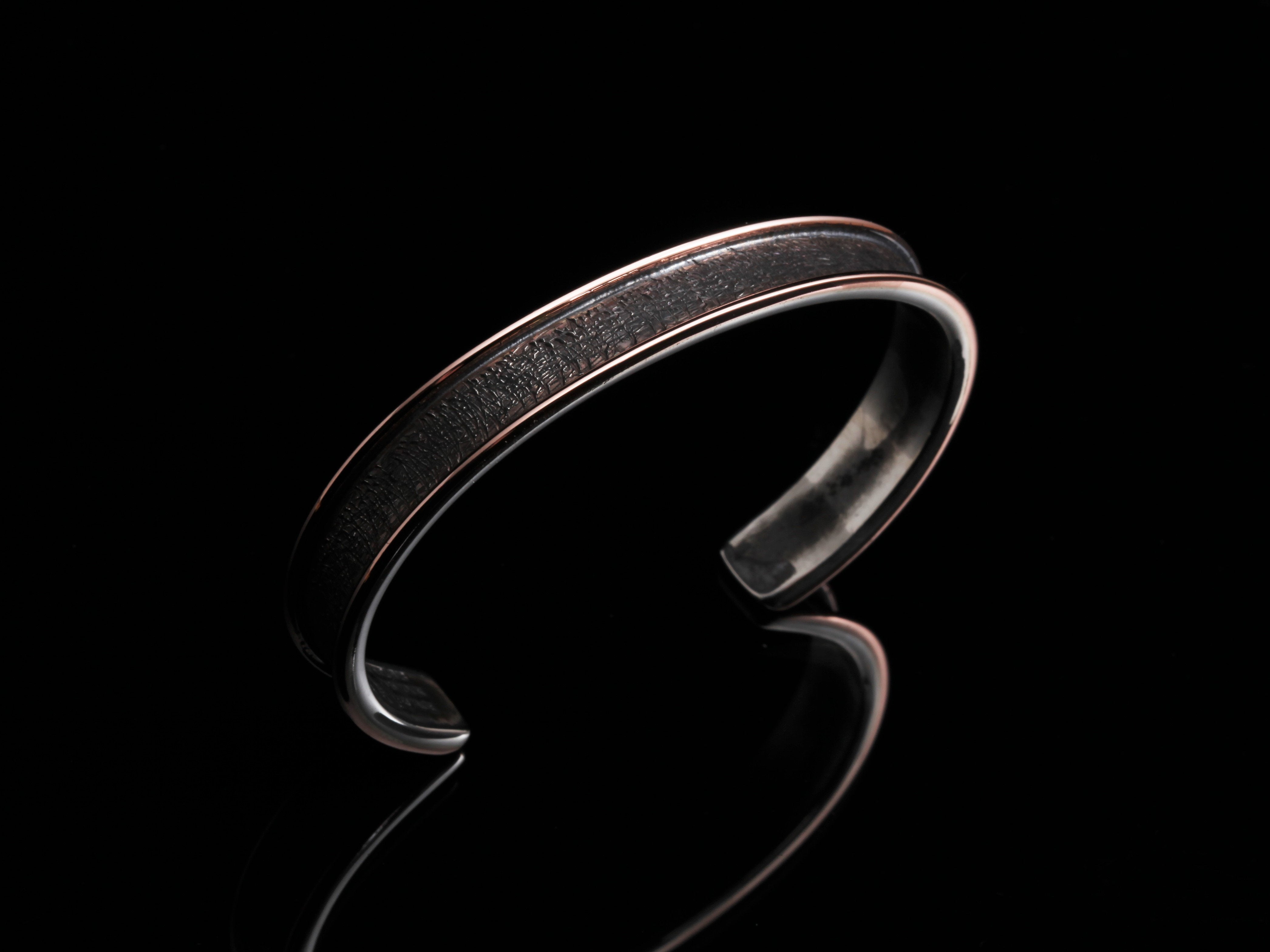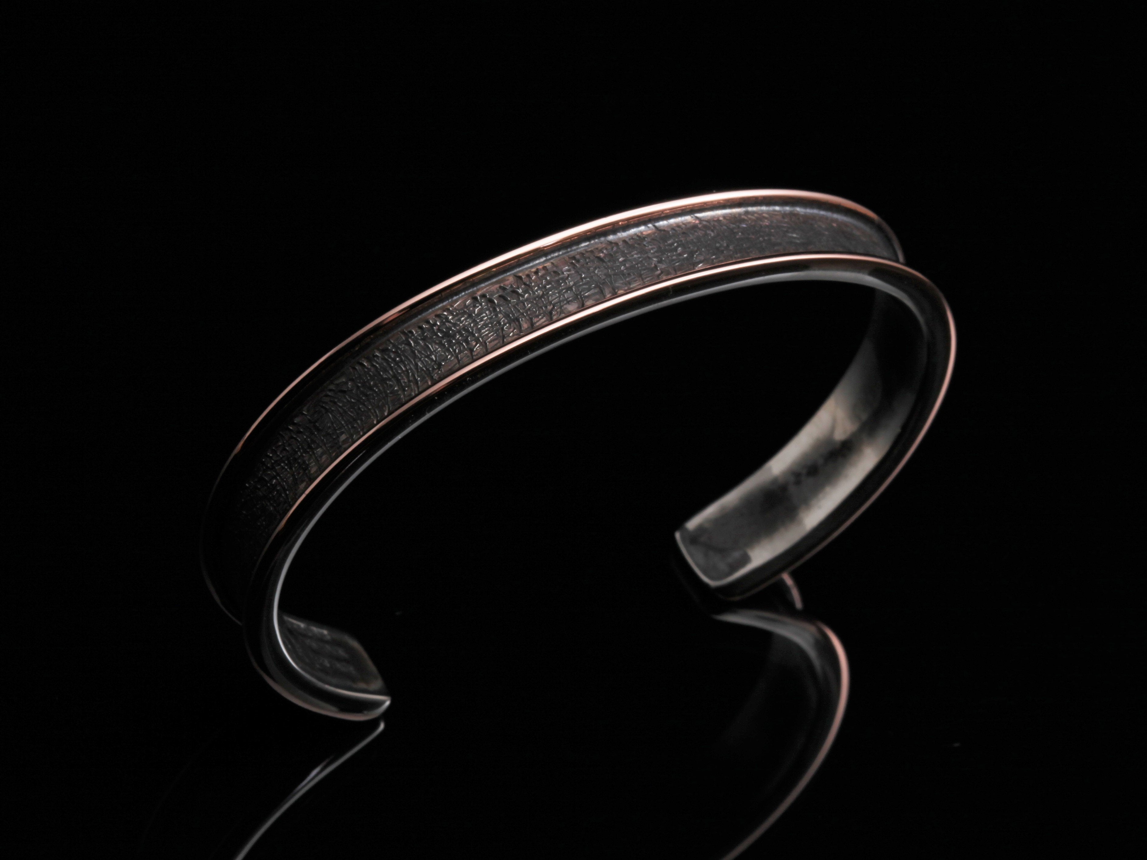 The SM Prince Cuff 14k by Comstock Heritage is a Sterling silver hand-formed cuff bracelet with a smaller gauge build, featuring intricate "Poe" hand engraving along the center. Framing this detailed design, delicate 14k rose gold round wire borders add a touch of warmth and contrast, enhancing its timeless appeal.